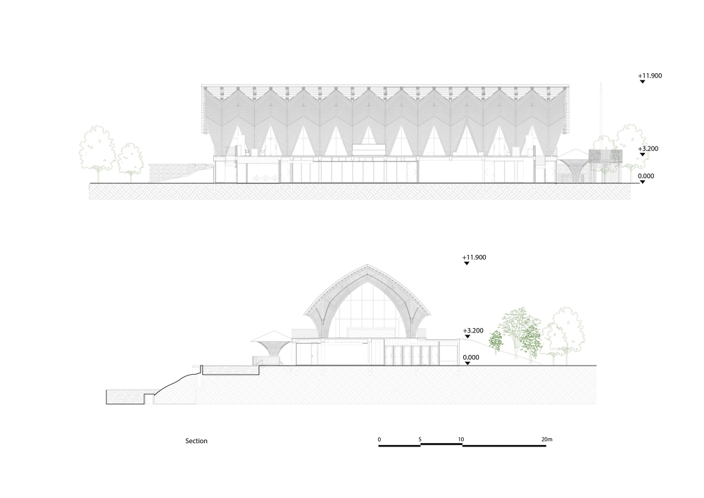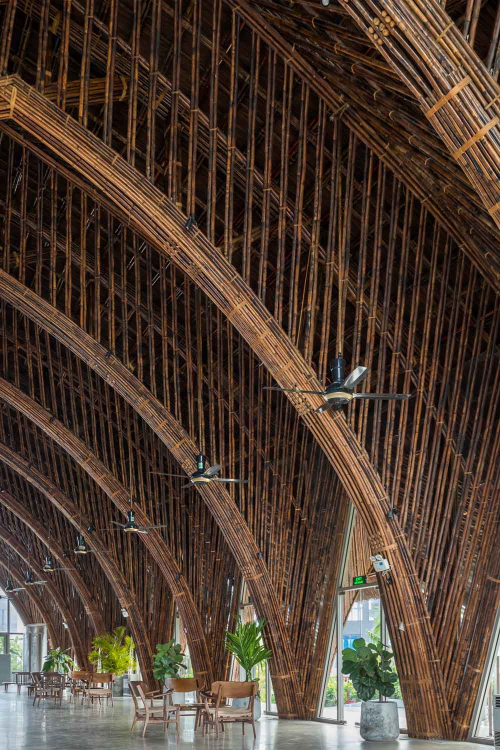 The hybrid bamboo structure consists of 22 arch frames of columns and trusses combined with bracing. This structure is almost 9m high and placed on a concrete plinth.