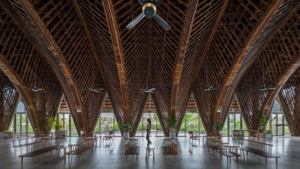 Using bamboo as the main material for this building brings many advantages. Bamboo structures have many layers of woven bamboo elements, making them efficient for acoustic absorption. This cheap construction allows social interaction inside the building. Moreover, the thatch roof also contributes to absorbing acoustics.