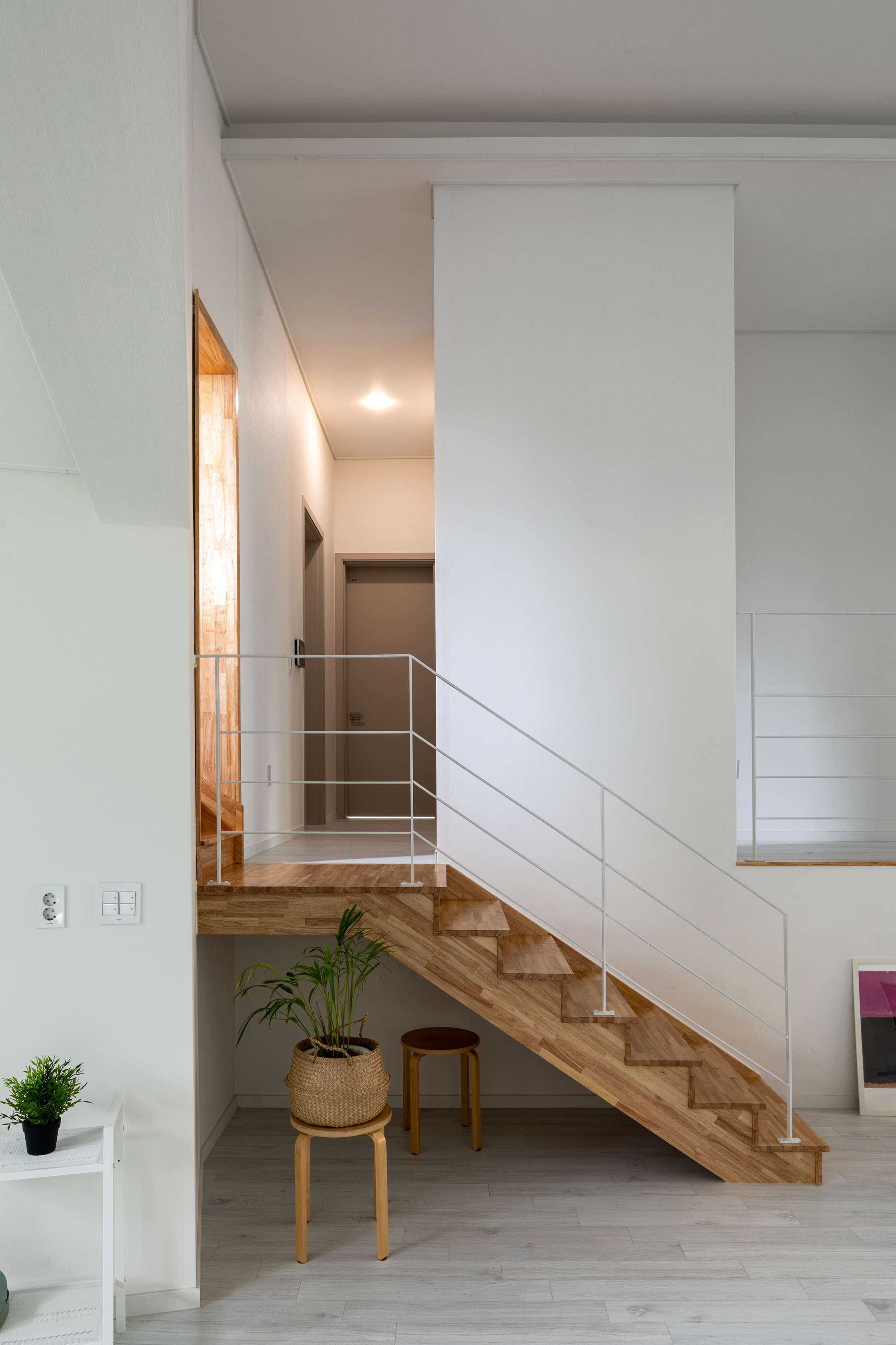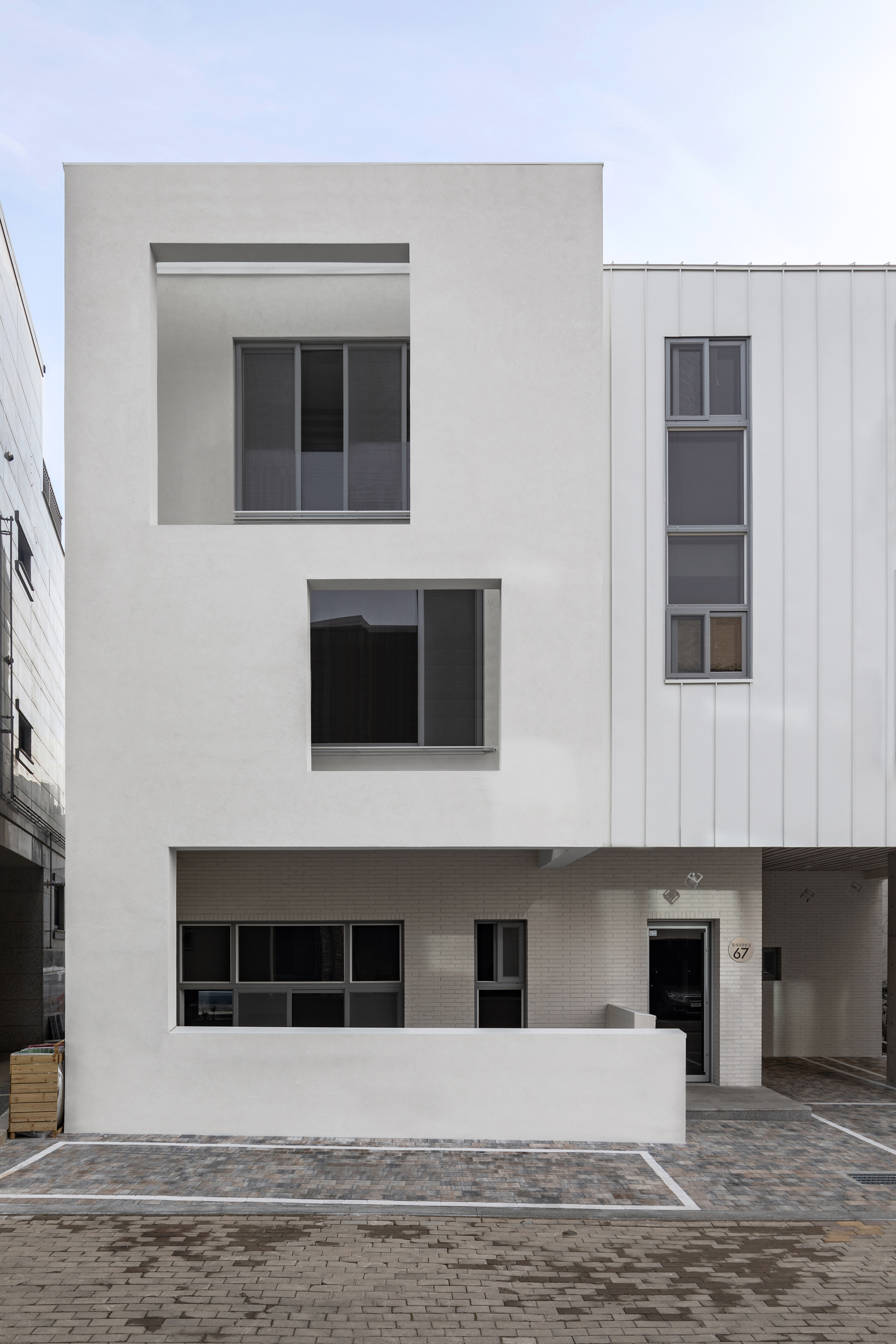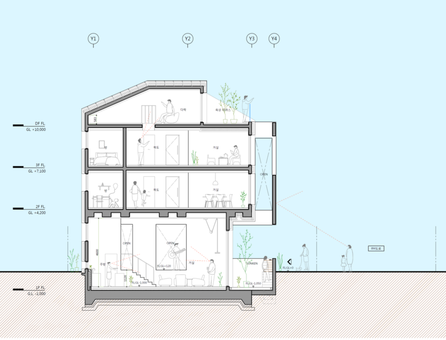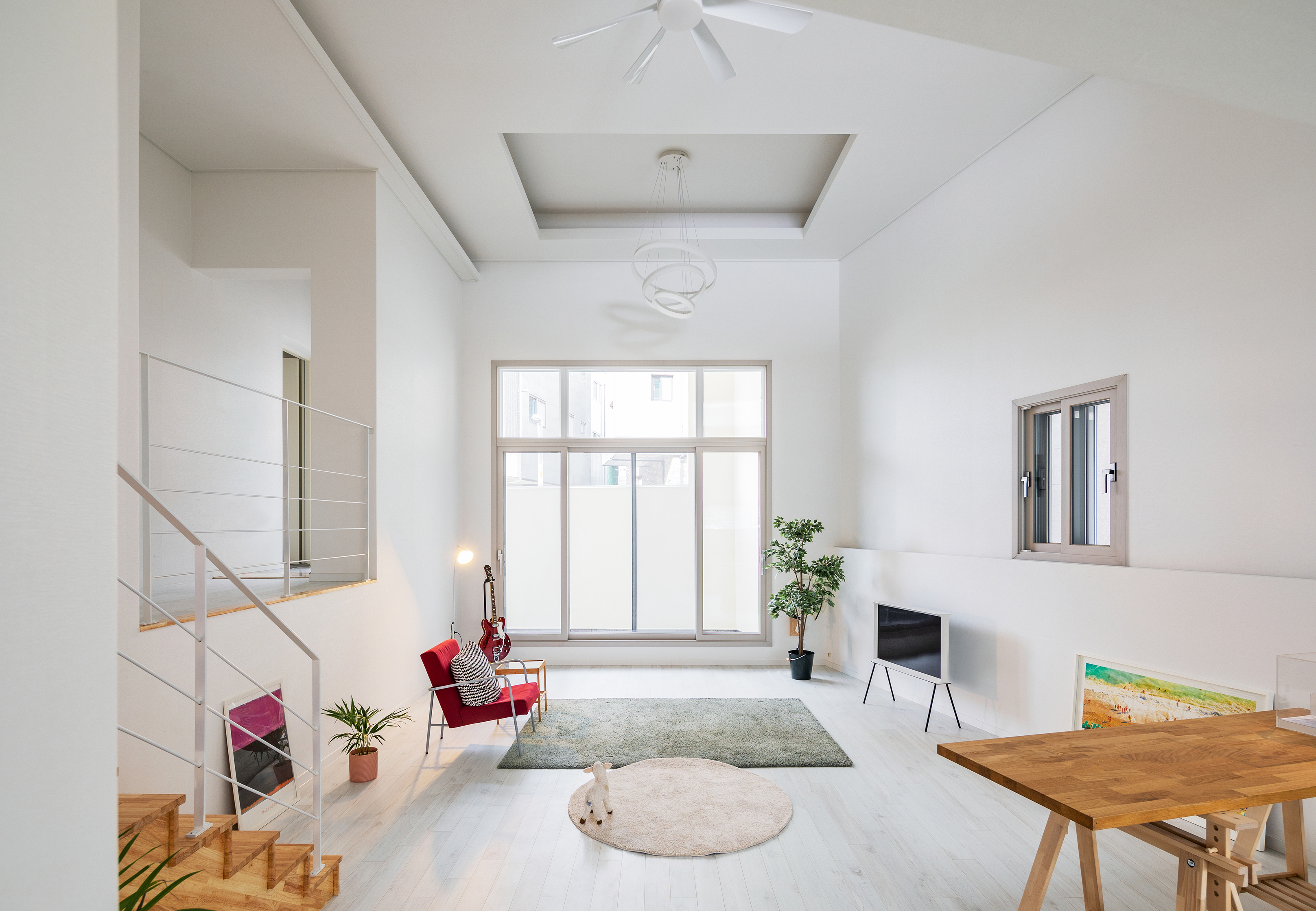 1+4 House is a multi-family housing, a universal residential type in Korea. The architect made a new attempt to break away from the spatial limitations of multi-family housings and attract the advantages of detached houses. Unlike typical multi-family housings in Korea, where the building owner’s household is placed on the upper floors, the owner’s household of 1+4 House was arranged on the first floor. The living room, which is 1m lower than the ground level, has a wide and spacious floor height. A cozy front yard was created due to the lowered front space, and a space with a high floor height that connects the yard-living room-dining room-kitchen is created. The terraces and attic spaces of the rental households on the third floor can be used independently in opposite directions, considering each other’s privacy as the household was divided. When looking at the front of the house, the residential lifestyles are protected from the building on the other side of the front road since the living room window is not directly exposed and there is a layer that considers the lighting aspect.