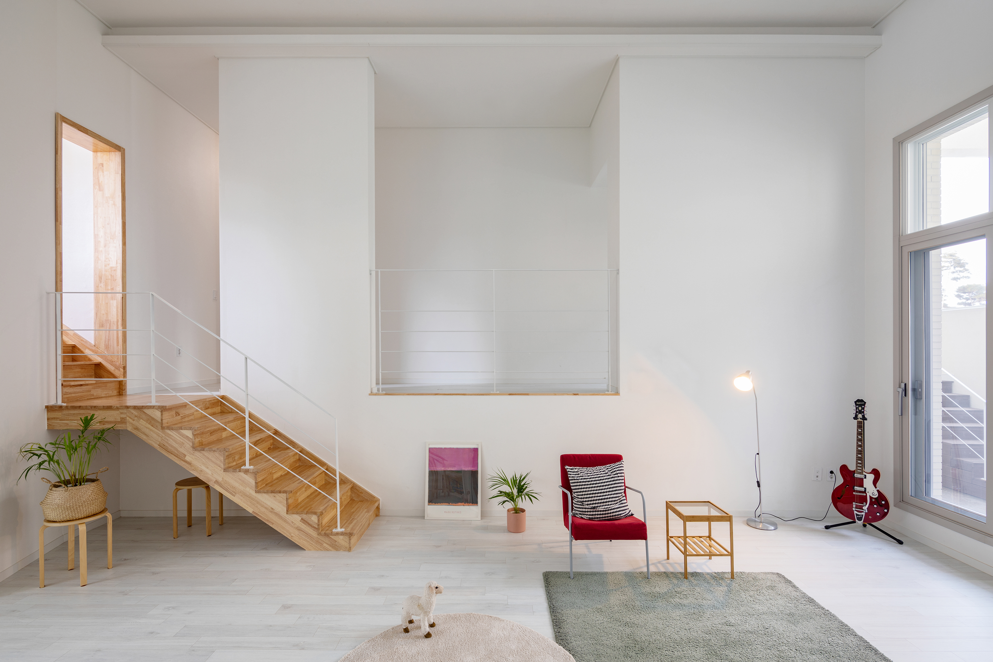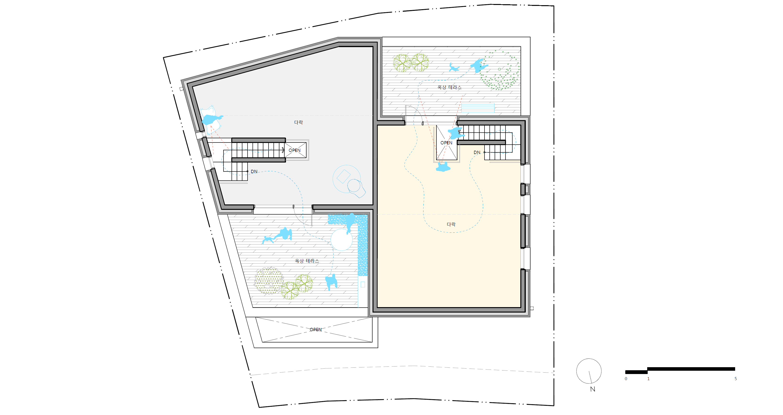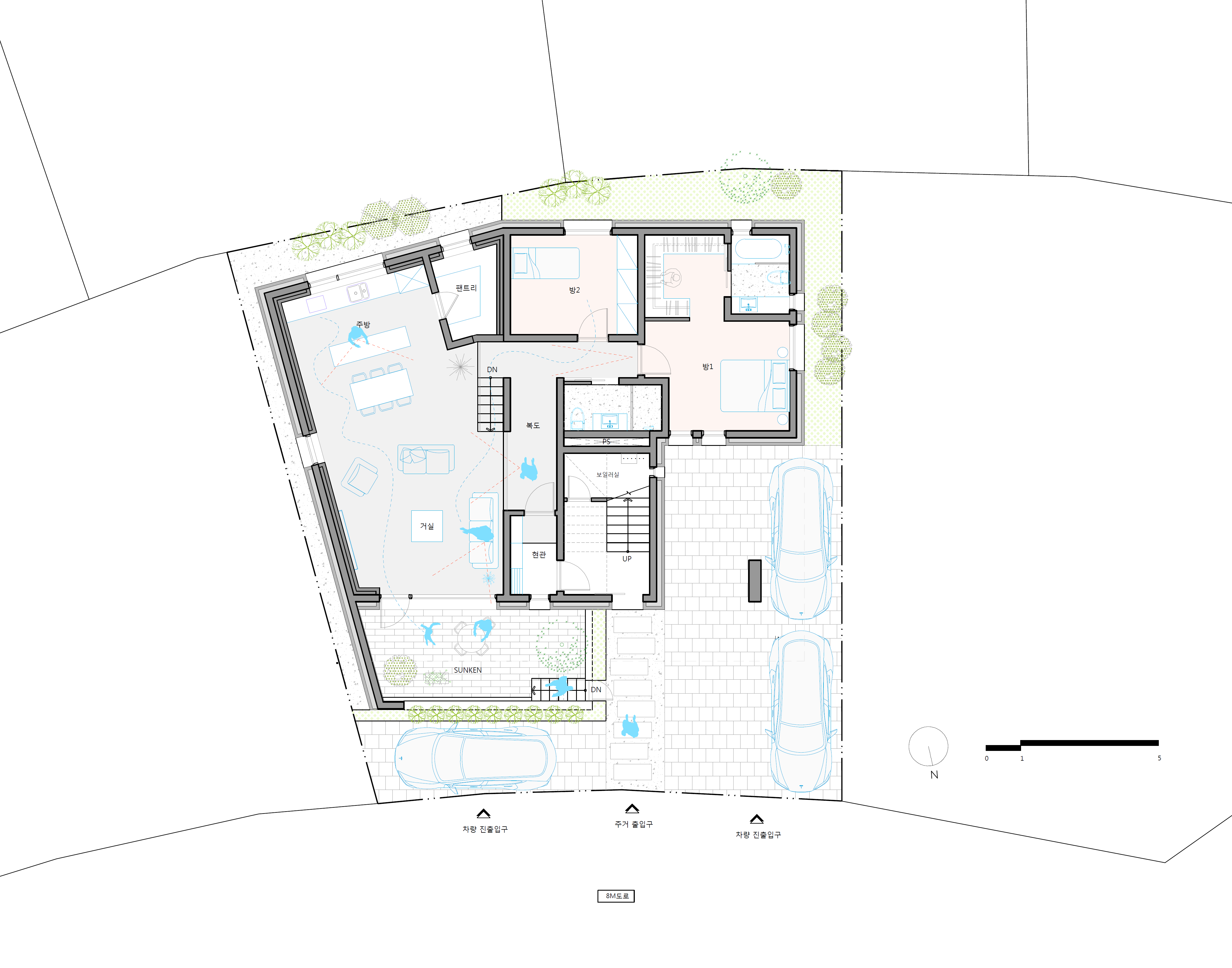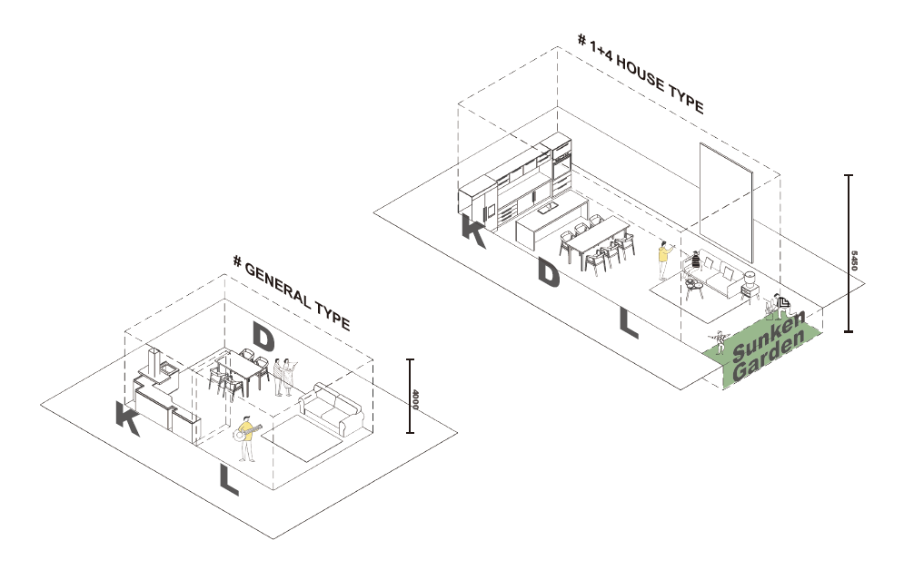 1+4 House is a multi-family housing, a universal residential type in Korea. The architect made a new attempt to break away from the spatial limitations of multi-family housings and attract the advantages of detached houses. Unlike typical multi-family housings in Korea, where the building owner’s household is placed on the upper floors, the owner’s household of 1+4 House was arranged on the first floor. The living room, which is 1m lower than the ground level, has a wide and spacious floor height. A cozy front yard was created due to the lowered front space, and a space with a high floor height that connects the yard-living room-dining room-kitchen is created. The terraces and attic spaces of the rental households on the third floor can be used independently in opposite directions, considering each other’s privacy as the household was divided. When looking at the front of the house, the residential lifestyles are protected from the building on the other side of the front road since the living room window is not directly exposed and there is a layer that considers the lighting aspect.