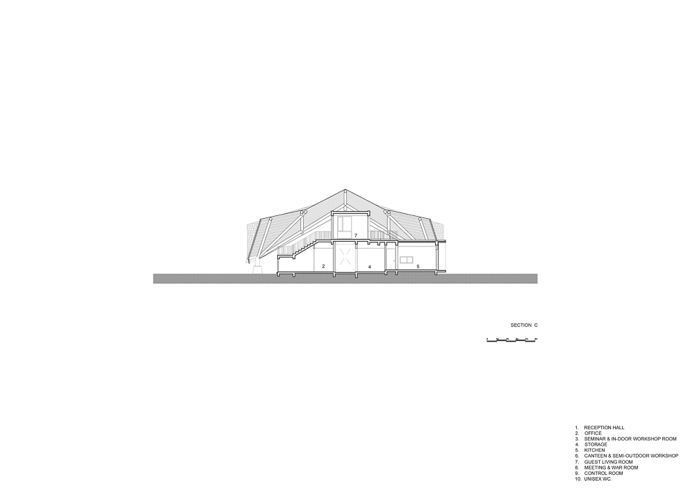 The activity center is placed as the landmark among the vast agriculture fields, It is designed as a large and open Pavilion to facilitate flexible usage of functions with natural lights and natural ventilation. The expansive and prominent roof made from locally grown bamboos helps to collect and drain rainwater towards small canals surrounding the building and in turn, redirect the water to feed other areas of the land before reaching the natural reservoirs for usage during the drought season.The natural color earthen walls, resulting from an experiment with local craftsmen’s skills and local soil further enhance “sufficiency thinking and mindset” in adapting locally available materials and capabilities for modern usage.