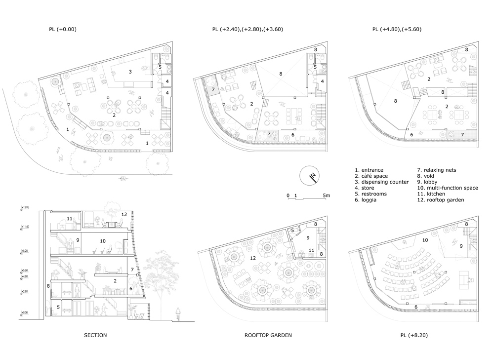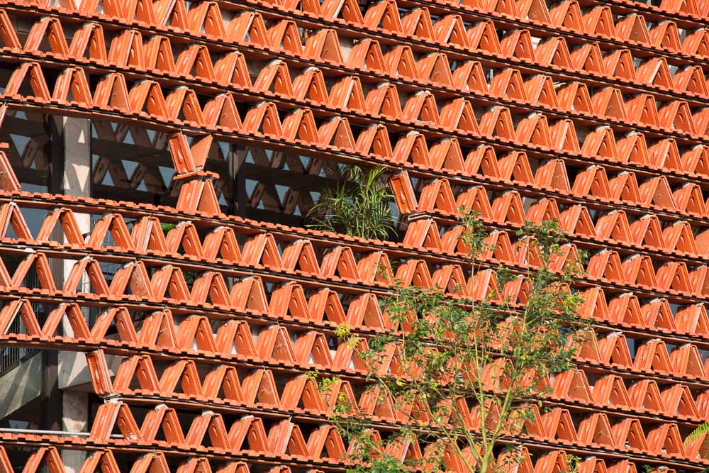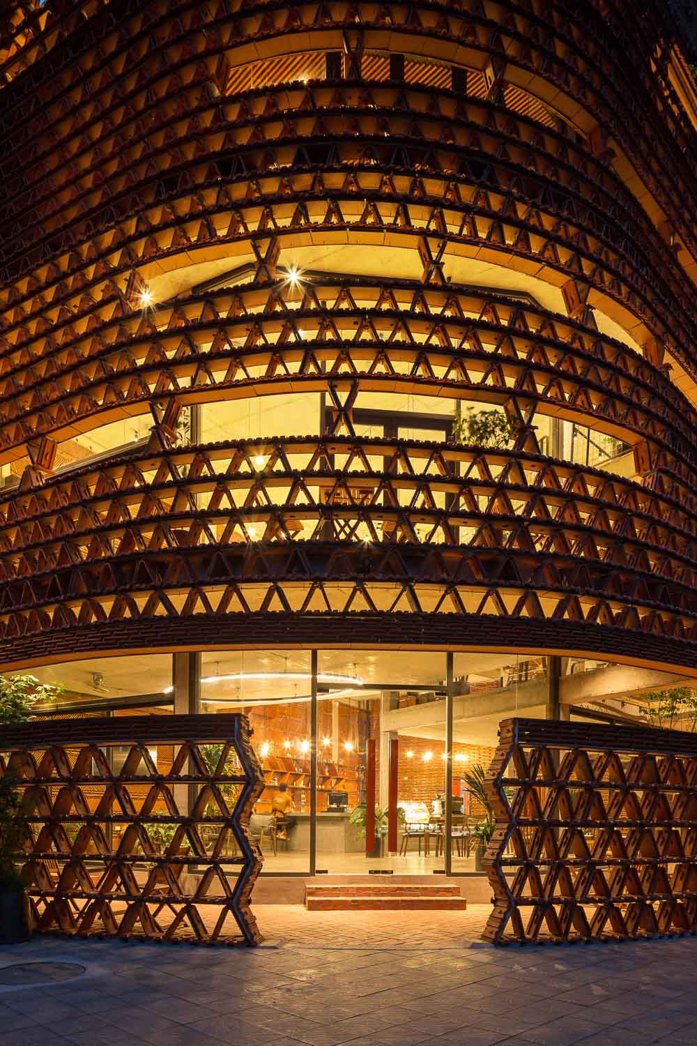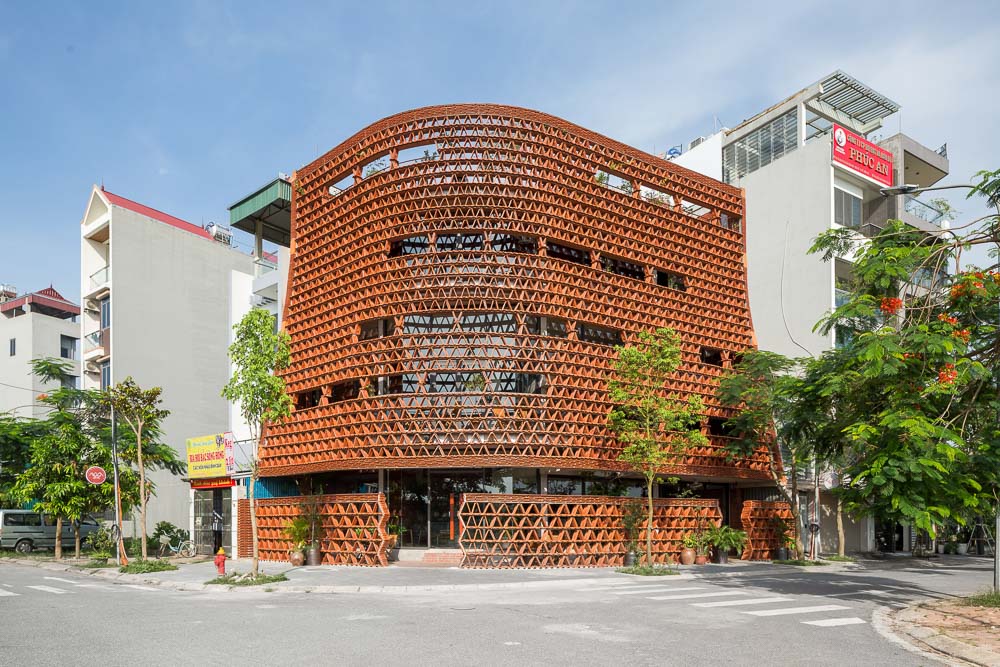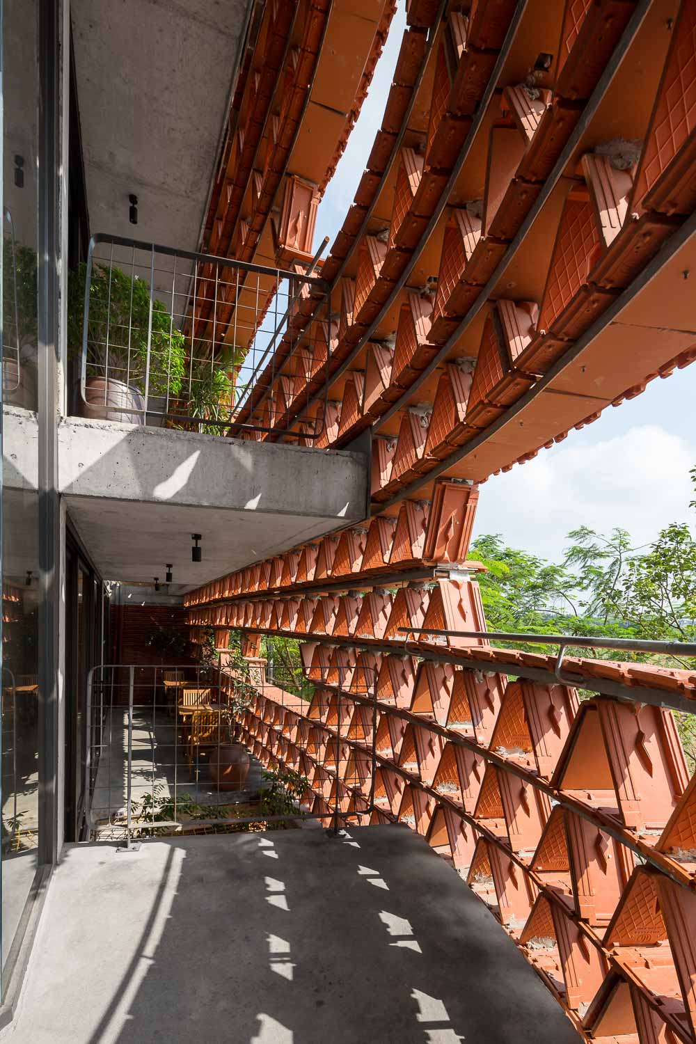 In making a Roof, Tile presents a natural option since it is a material familiar with most Vietnamese people, yet used in an unusual way (as walls, curtains) in an extraordinary space to produce a special different effect (regarding appearance, sense of space and micro-climate quality). The Ngói space functions Cafés (lower space + on the rooftop), Seminar and Exhibition rooms (on the middle floor) with the aim of offering a fresh destination, an inspiring common Roof.