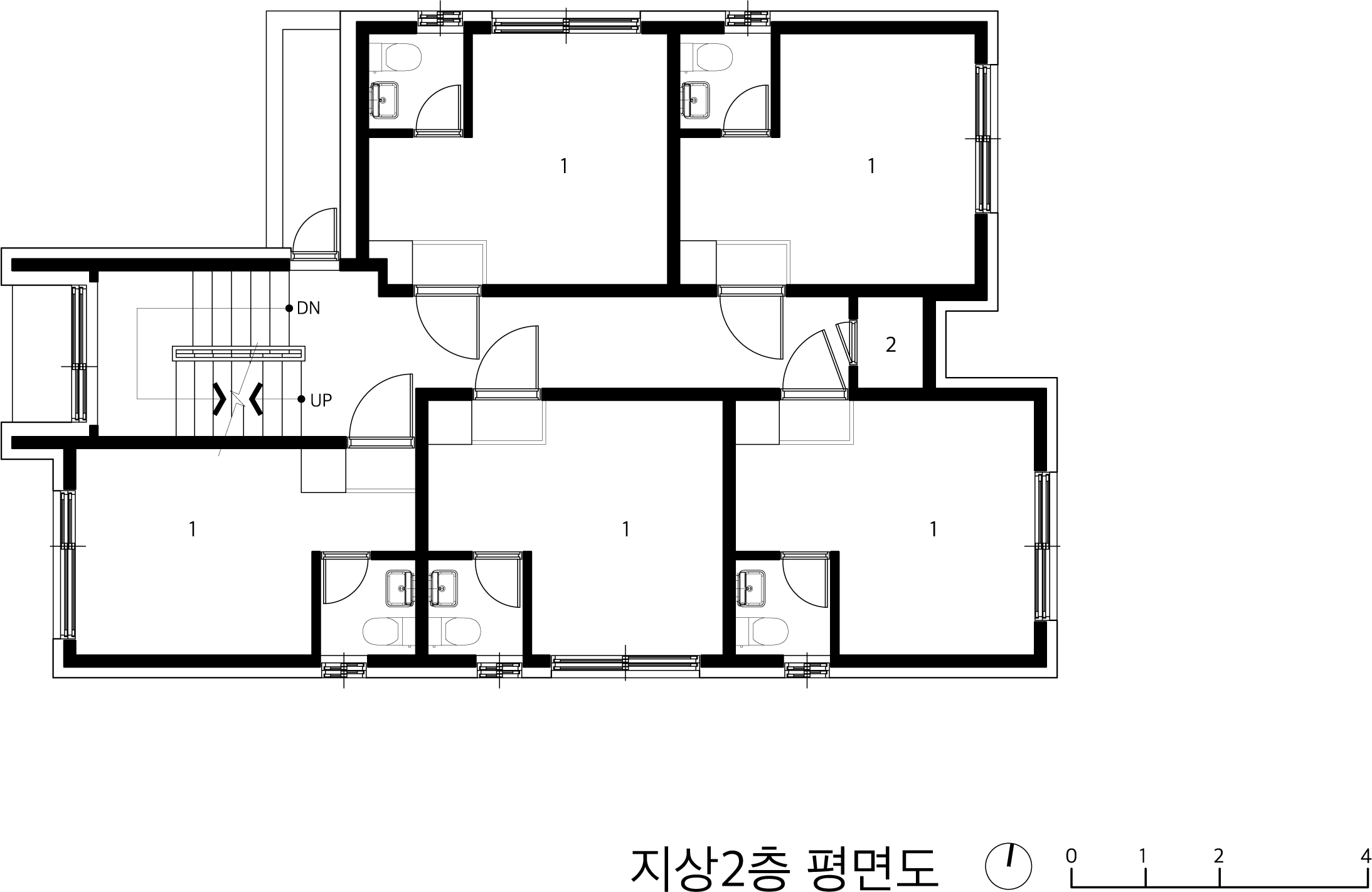 대지는 과거에 지어진 2층 미만의 단독주택과 근래에 지어진 3층 이상의 원룸주택이 불편하게 공존하고 있는 대학가 인근 주택가에 위치하고 있다. 인접 건축물 거주자들이 법적 기준 이상의 차면시설을 요구하여 신축하는 건물의 모든 창에 차면시설을 설치해야 하는 상황이었다. 건물 전면이 차면시설로 뒤덮여 있는 형태를 피하기 위해서 전면에 위치한 계단실의 벽체를 연장하여 신축건물과 인접건축물 상호 간의 프라이버시를 확보한 후 주민들을 설득했고, 계단실의 벽체가 어색하지 않도록 조형적이고 기하학적으로 계획하여 임대건물이지만 개성을 가질 수 있도록 했다.