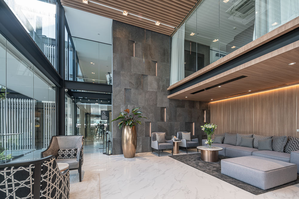 On the owner’s demand. Dr. Bas, he needs a building that was eyecatching for people passing by in the area of this intersection, and the building must not be very hot because the building faces the west so we still need natural light in the project and space within the “Glass Block” Project. Therefore it is an option that we choose to use as the main material because it can answer many things for us so we want our project to have the natural light area. Trees within the project area need light without being very hot inside and sparkle in the sun will shine to the building in the afternoon to make the building look outstanding according to the needs of the project owner.