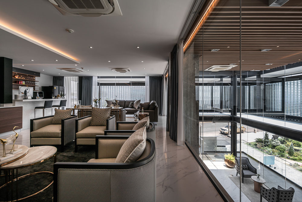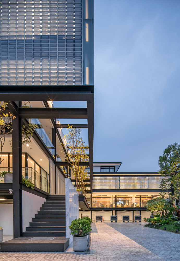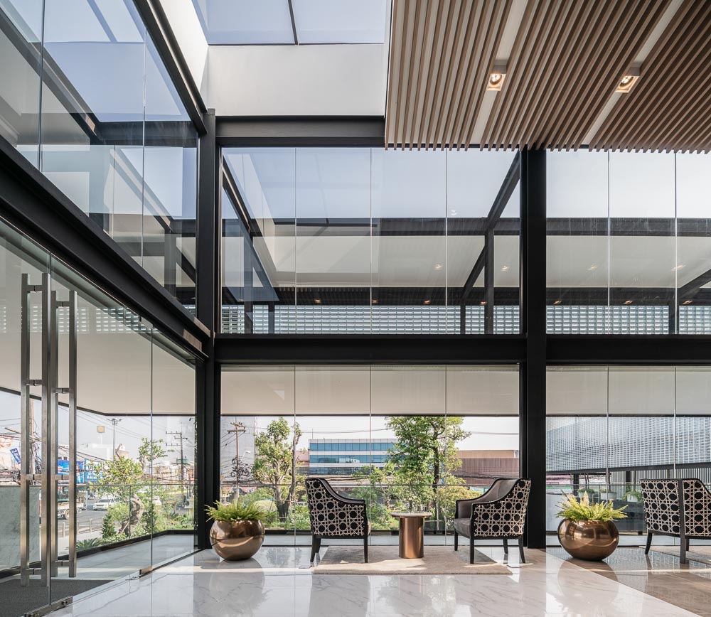 On the owner’s demand. Dr. Bas, he needs a building that was eyecatching for people passing by in the area of this intersection, and the building must not be very hot because the building faces the west so we still need natural light in the project and space within the “Glass Block” Project. Therefore it is an option that we choose to use as the main material because it can answer many things for us so we want our project to have the natural light area. Trees within the project area need light without being very hot inside and sparkle in the sun will shine to the building in the afternoon to make the building look outstanding according to the needs of the project owner.
