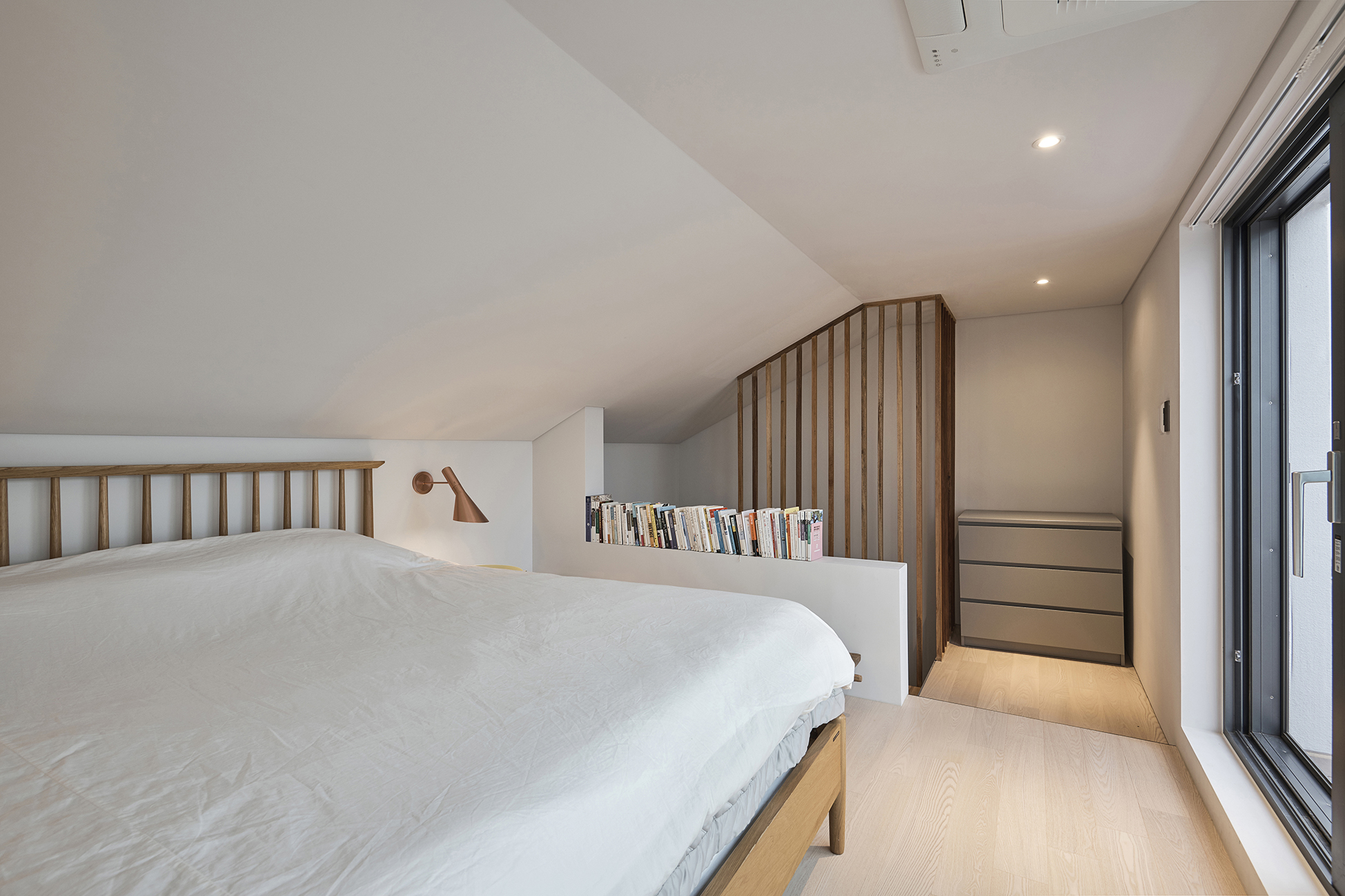 Mr. Mo, who loves wood as his hobby is carpentry, stacked layers of laminated wood to make one solid tread. He fixed these double-sided treads onto thin steel plates to create a stable, yet transparent staircase. As a result, the staircase room serves as a breathing space for the building the 2nd floor through the attic. The attic serves as a bedroom for the couple, so the terrace in front of it is designed as more intimate space. The gentle ridge of Woongil Mountain far away is pictured within the widely extended frame.