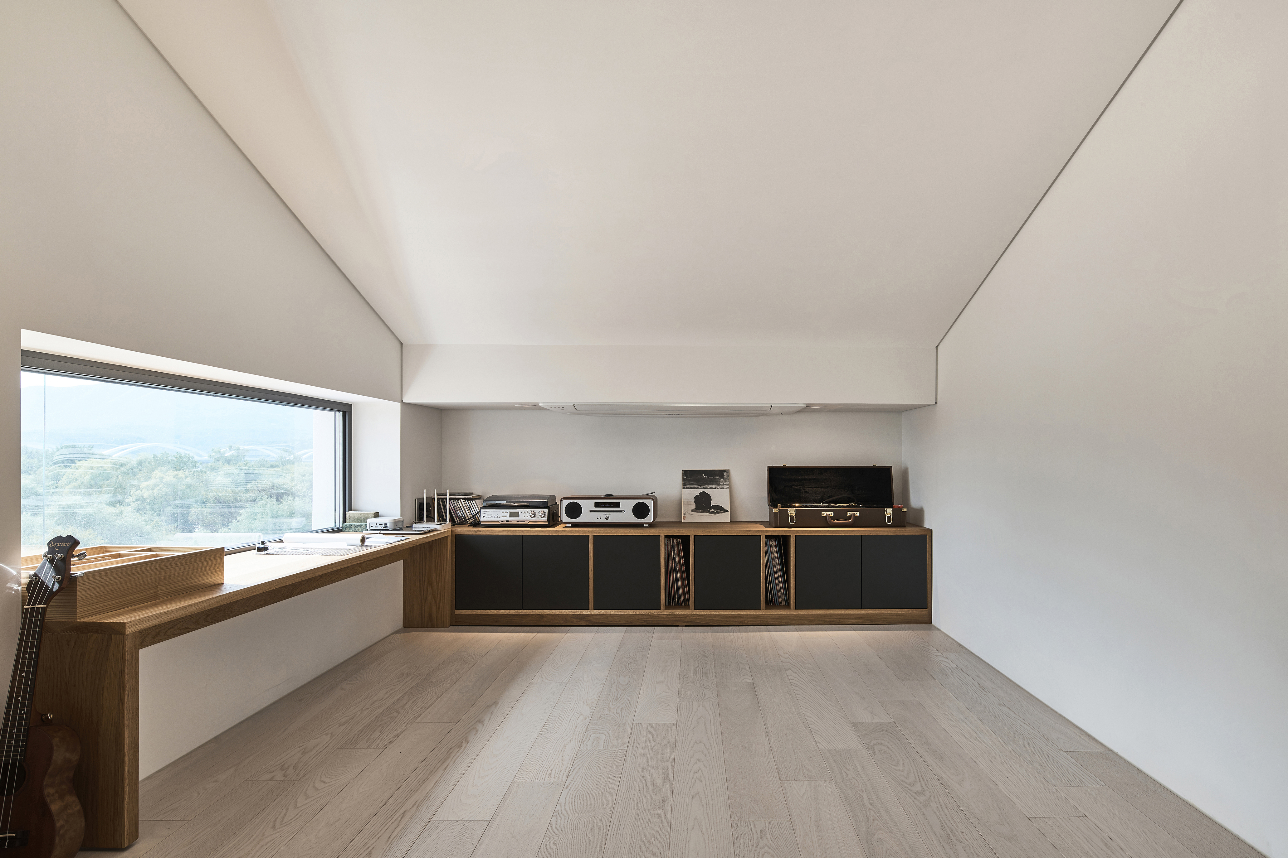 목공이 취미일 만큼 나무를 좋아하는 모씨는 집성목을 포개, 통목을 만들어 계단의 디딤판을 만들었다. 양감 있는 계단 판을 얇은 철판에 고정하여 안정적이되 투명한 계단을 만들었고, 계단실은 다락부터 2층을 관통하는 숨구멍이 됐다. 다락을 부부의 침실로 사용하기에 다락 앞 테라스는 좀 더 내밀한 공간으로 계획됐다. 멀리 완만하게 펼쳐진 운길산의 능선은 가로로 길게 찢어진 액자를 만들어 담았다.