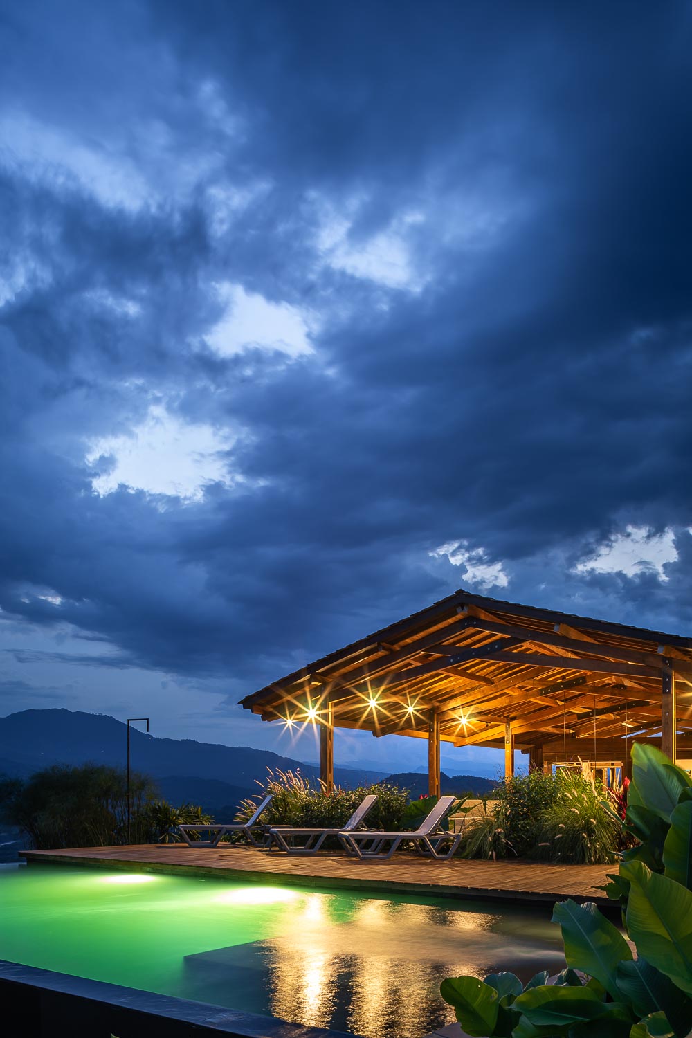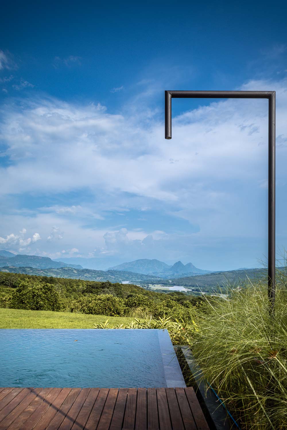Finally, the social area of the house is configured with the strictly necessary elements: a large elongated dining table and a u-shaped unit in masonry that serves as a room open to the landscape and that in turn precedes the area of the pool. This one, built in natural black slate, seeks to contrast strongly with the deck, also in wood, and give the greatest feeling of naturalness possible. Thus, the visitor remains here in an open space surrounded by plants, giving way to one of the most important geographical landmarks in the region: Los farallones de la pintada.