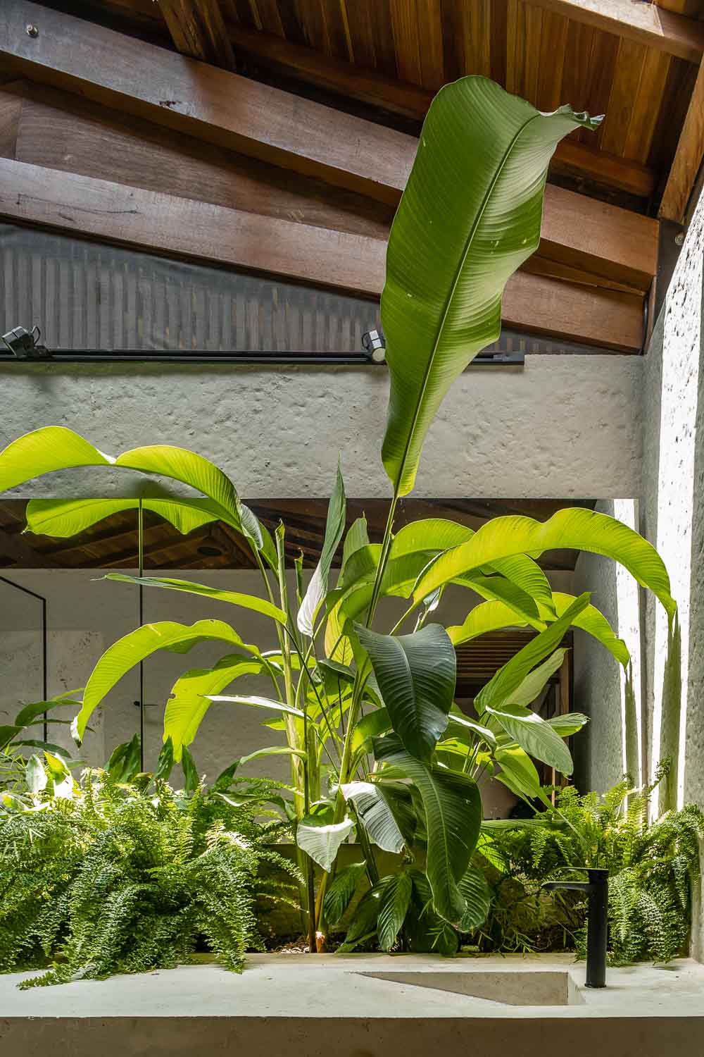 집에 열대식물들이 지속적으로 존재하도록 하기 위해 주변 경관과 디자인적인 측면에서는 장소와 상황에 적합한 색상 포인트와 그림자의 혼합, 자연스러움을 보여준다. 마지막으로 집의 사회적 공간은 반드시 필요한 요소로 구성되어 있다. 크고 긴 식탁과 ㄷ자 모양의 벽돌로 된 유닛은 풍경을 향해 열려 있는 방 역할을 하고 수영장 앞에 위치한다. 천연 블랙 슬레이트로 제작된 이 제품은 목재 데크와의 강한 대비를 나타내며 자연스러움을 선사한다.