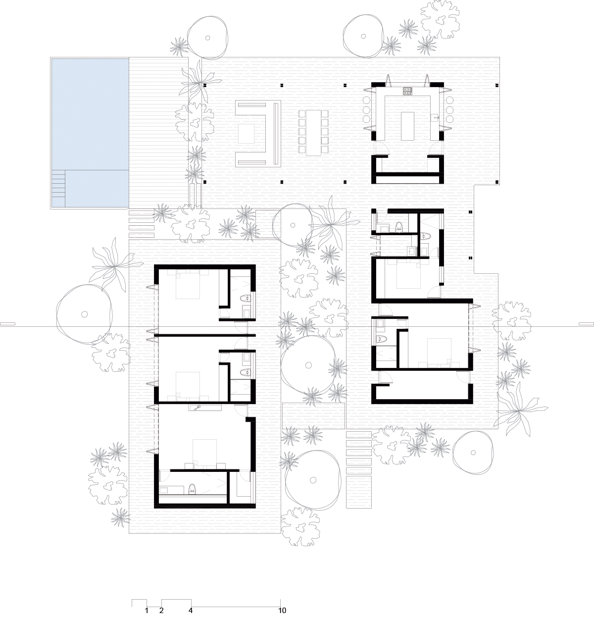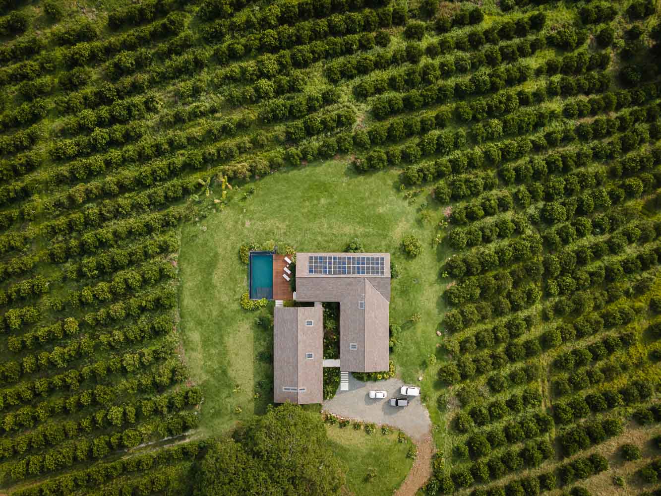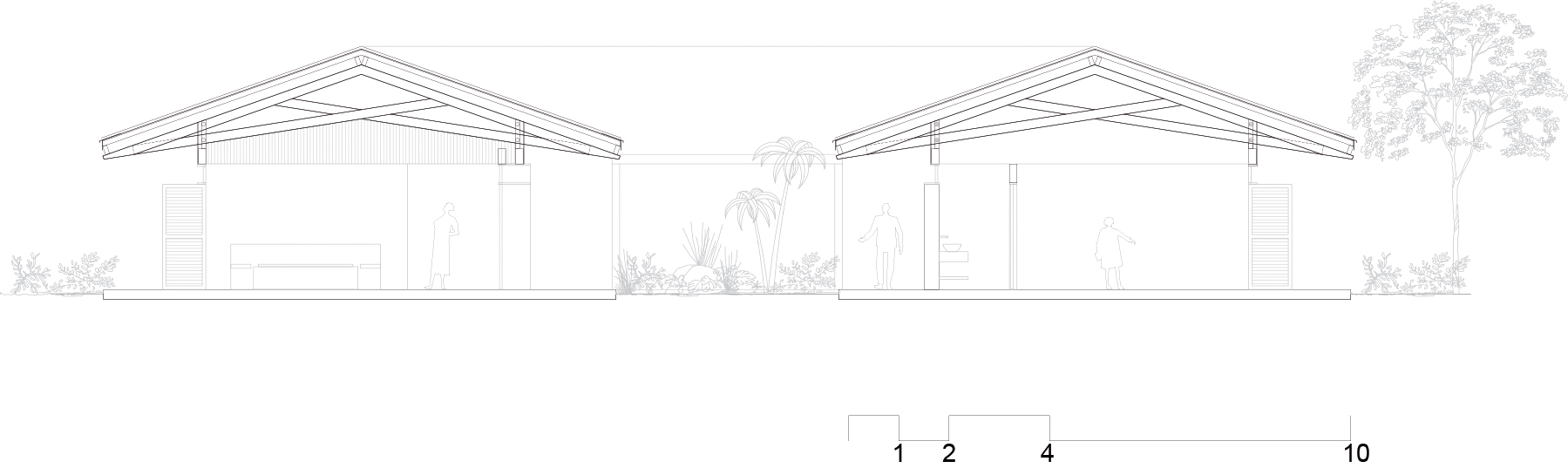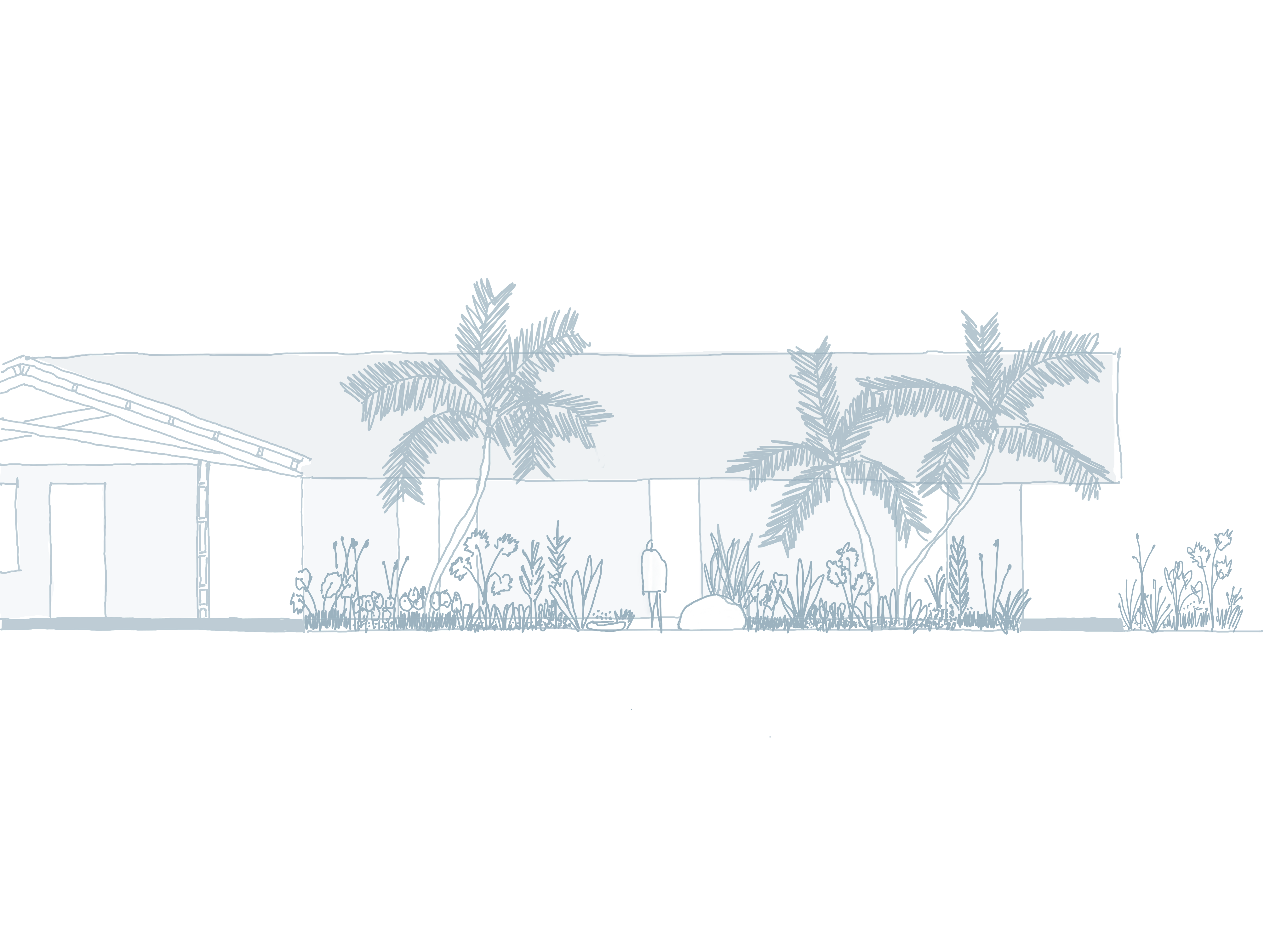 집에 열대식물들이 지속적으로 존재하도록 하기 위해 주변 경관과 디자인적인 측면에서는 장소와 상황에 적합한 색상 포인트와 그림자의 혼합, 자연스러움을 보여준다. 마지막으로 집의 사회적 공간은 반드시 필요한 요소로 구성되어 있다. 크고 긴 식탁과 ㄷ자 모양의 벽돌로 된 유닛은 풍경을 향해 열려 있는 방 역할을 하고 수영장 앞에 위치한다. 천연 블랙 슬레이트로 제작된 이 제품은 목재 데크와의 강한 대비를 나타내며 자연스러움을 선사한다.