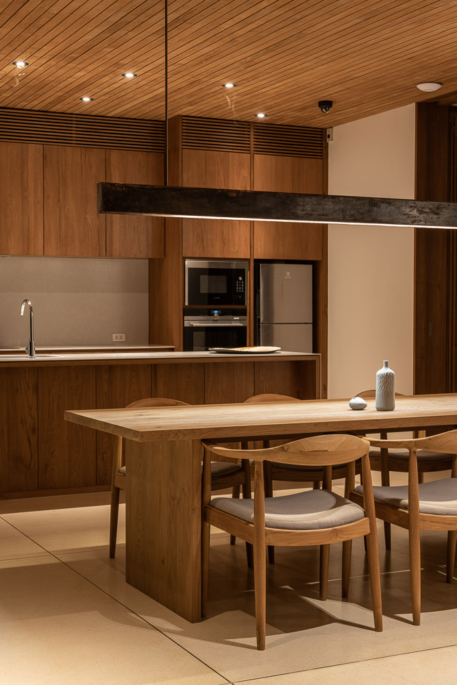 Local materials are the essential elements of the house. Floor and roof tiles were made by local artisans whose workshops are not far from the house and reclaimed teaks are from an abandoned house. In order to protect the house from exposure to sunlight, bamboo louvers provide a delicate aperture to the delightful view while reducing the heat and letting in gentle breezes along the east and west facade of the house. The house stands subtly and in harmony with nature, light, breezes and the richness of natural texture.