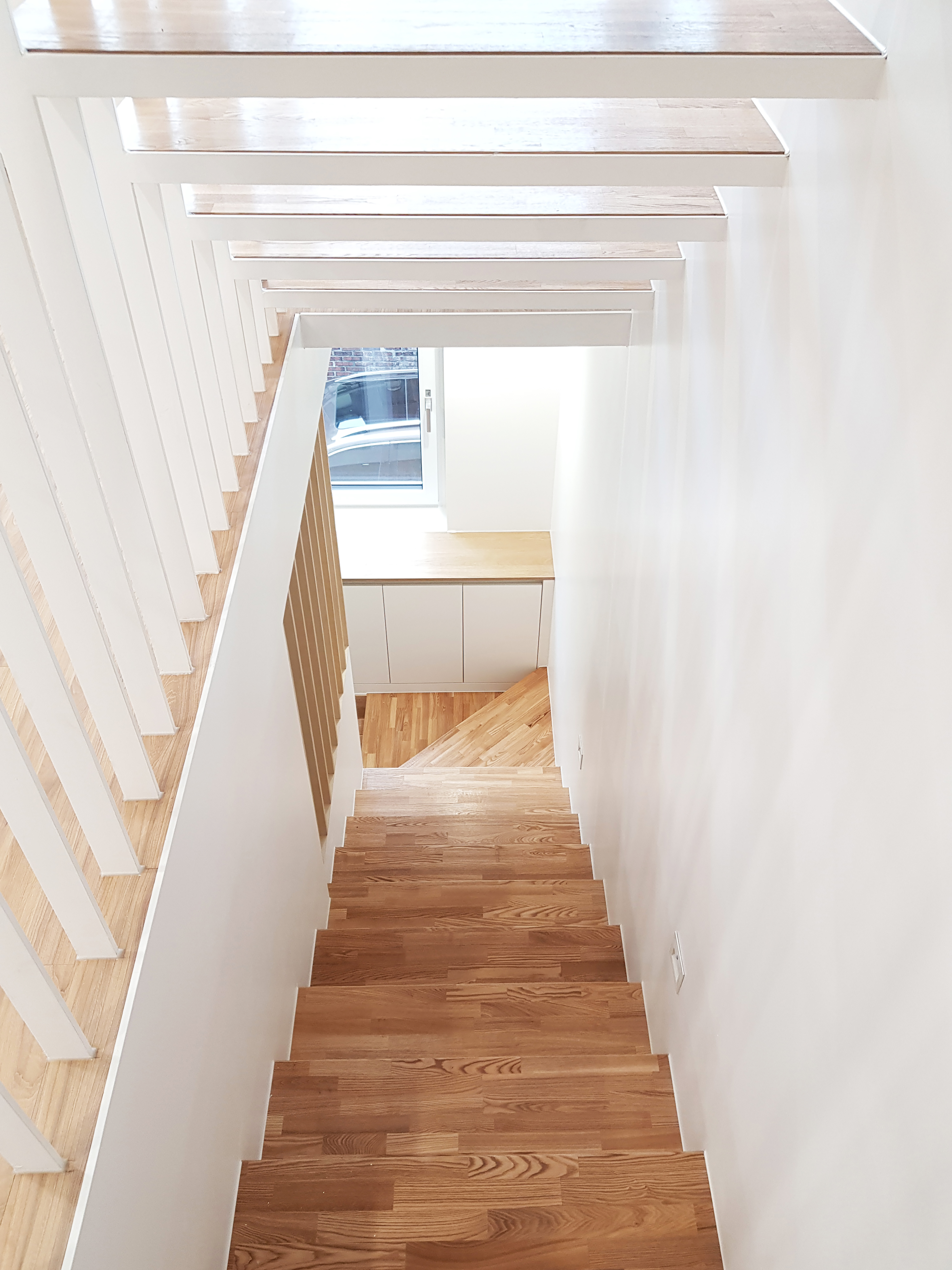 The first floor of Cotton House has a neighborhood living facility and parking lot, and the second floor has a rental residential space with two rooms. The third and fourth floors, which are found through the front entrance on the second floor, are the client’s residential space, and there is a rooftop terrace in addition to the residential spaces. The area of each floor in the narrow site is about 50m². However, not only do the openness and lighting feel maximized from the interior space, but also the fact that the connection between the spaces were considered to be reasonable yet meticulous can be seen. The main interior spaces are open towards the road on the east side, and the bedroom was open towards the dead-end road on the south side to secure lighting. When the living room and dining room on the second and third floors are reached, an open staircase and the kitchen with an urban landscape are met. The most important point of the architect’s design was to border the common spaces, where they face one another, and the independent private spaces within the life of the client’s residential space in a loose space form. In this way, the interior staircase of the living room emphasizes the openness as much as possible and naturally connects the sight and circulation. Most of the doors have a pocket door format. Furthermore, all parts including the walls and the roof of Cotton House were designed with thorough exterior insulation. In particular, an exterior insulation waterproof method was applied to the flat roof in order to resolve its troublesome waterproof defect and thermal bridge, and a careful construction process was carried out. ‘Cotton House’, which has newly settled down in Myeonmok-dong’s residential area, is overlapped and stacked with suitably connected small spaces. It is a residential space that faithfully captures the daily life that is warm and cozy like a blooming cotton flower.