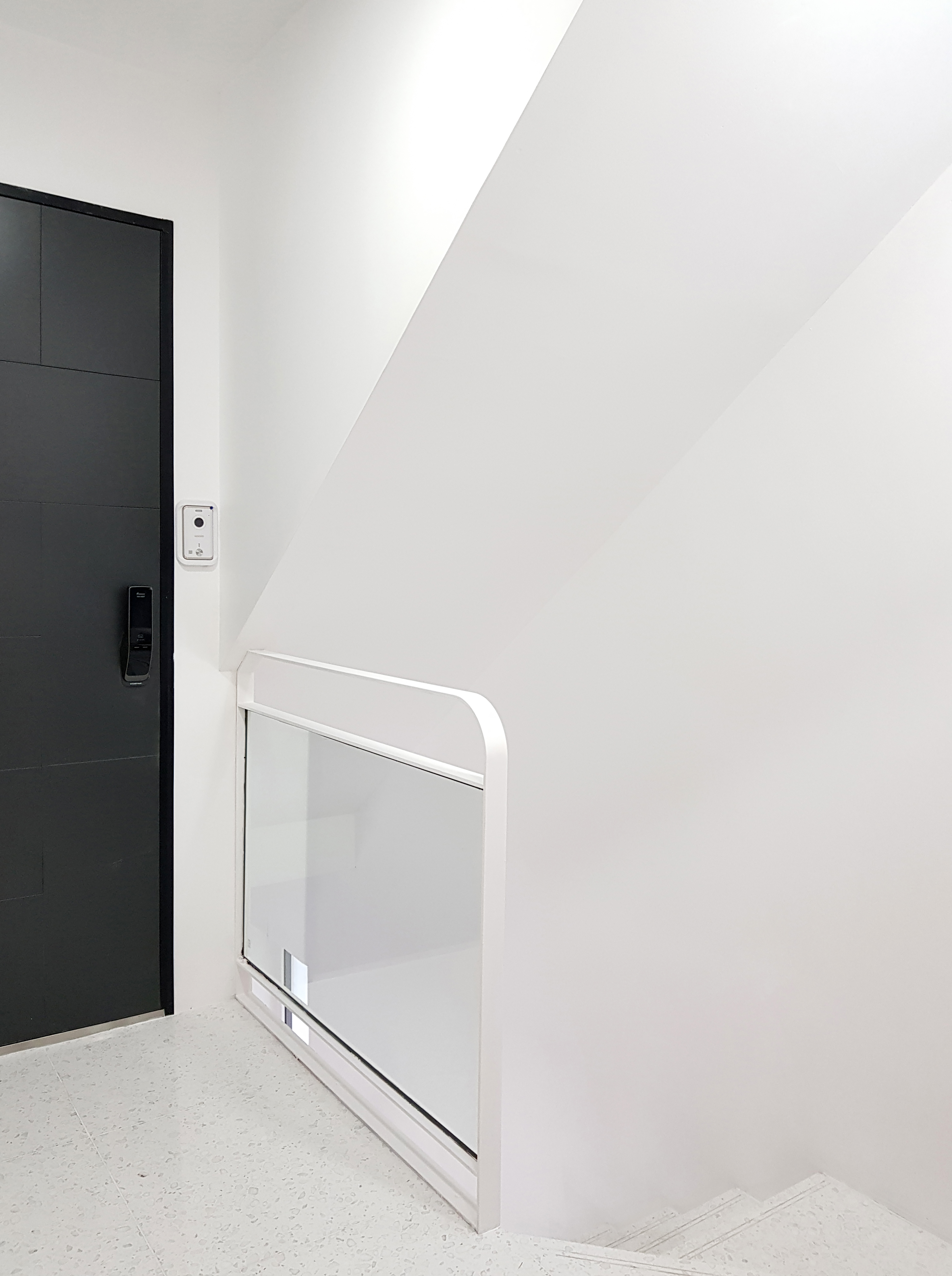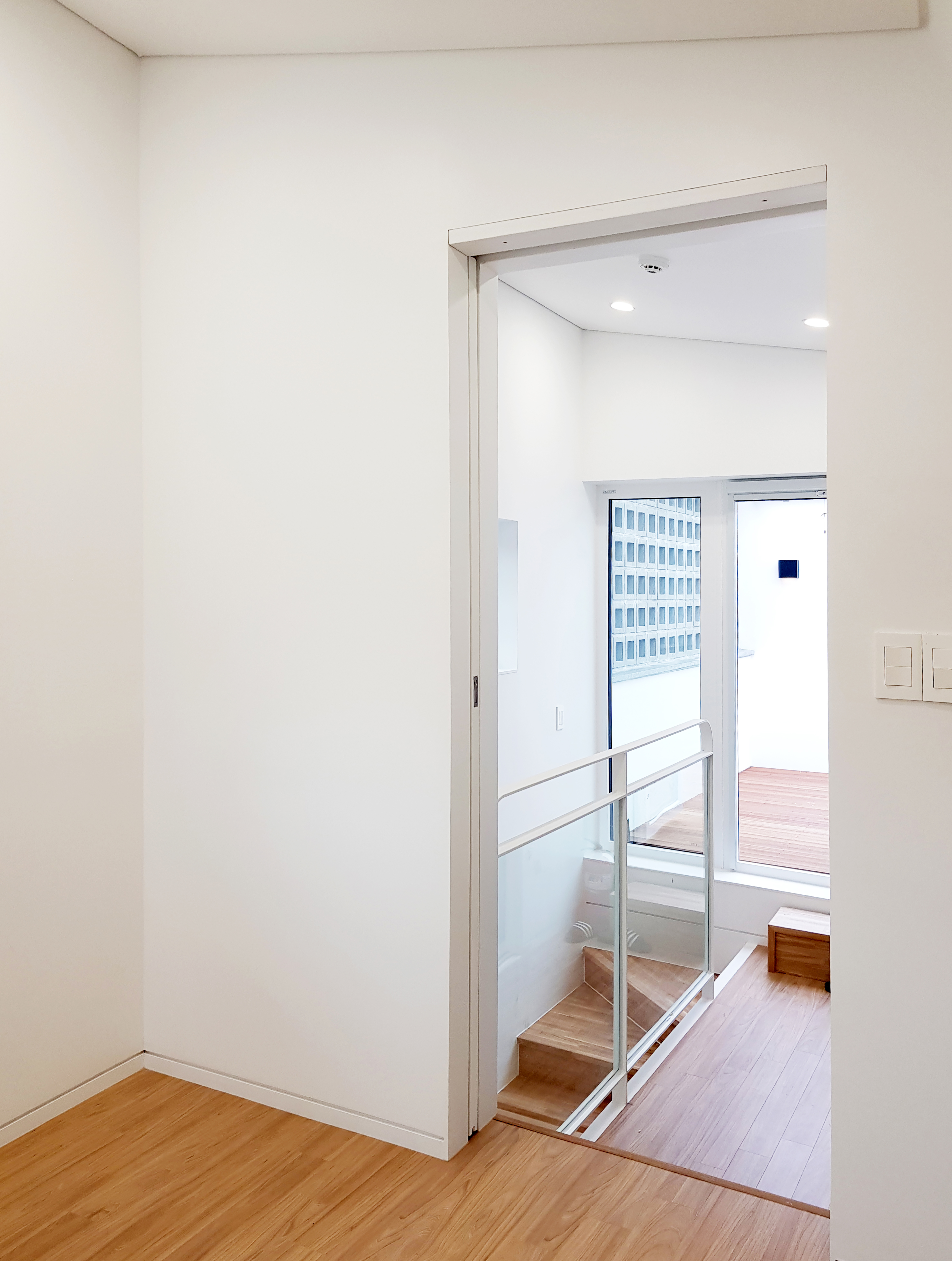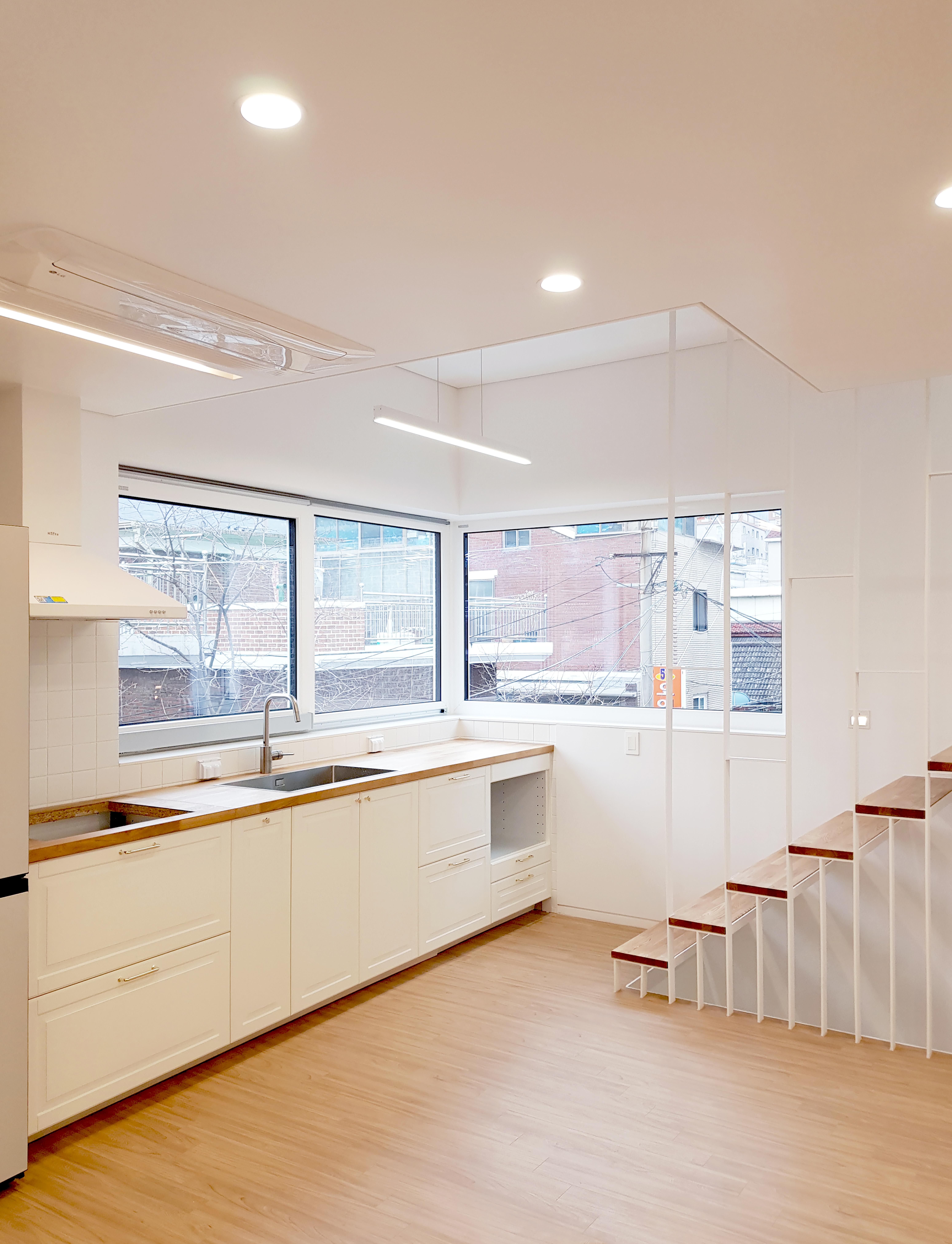 The first floor of Cotton House has a neighborhood living facility and parking lot, and the second floor has a rental residential space with two rooms. The third and fourth floors, which are found through the front entrance on the second floor, are the client’s residential space, and there is a rooftop terrace in addition to the residential spaces. The area of each floor in the narrow site is about 50m². However, not only do the openness and lighting feel maximized from the interior space, but also the fact that the connection between the spaces were considered to be reasonable yet meticulous can be seen. The main interior spaces are open towards the road on the east side, and the bedroom was open towards the dead-end road on the south side to secure lighting. When the living room and dining room on the second and third floors are reached, an open staircase and the kitchen with an urban landscape are met. The most important point of the architect’s design was to border the common spaces, where they face one another, and the independent private spaces within the life of the client’s residential space in a loose space form. In this way, the interior staircase of the living room emphasizes the openness as much as possible and naturally connects the sight and circulation. Most of the doors have a pocket door format. Furthermore, all parts including the walls and the roof of Cotton House were designed with thorough exterior insulation. In particular, an exterior insulation waterproof method was applied to the flat roof in order to resolve its troublesome waterproof defect and thermal bridge, and a careful construction process was carried out. ‘Cotton House’, which has newly settled down in Myeonmok-dong’s residential area, is overlapped and stacked with suitably connected small spaces. It is a residential space that faithfully captures the daily life that is warm and cozy like a blooming cotton flower.