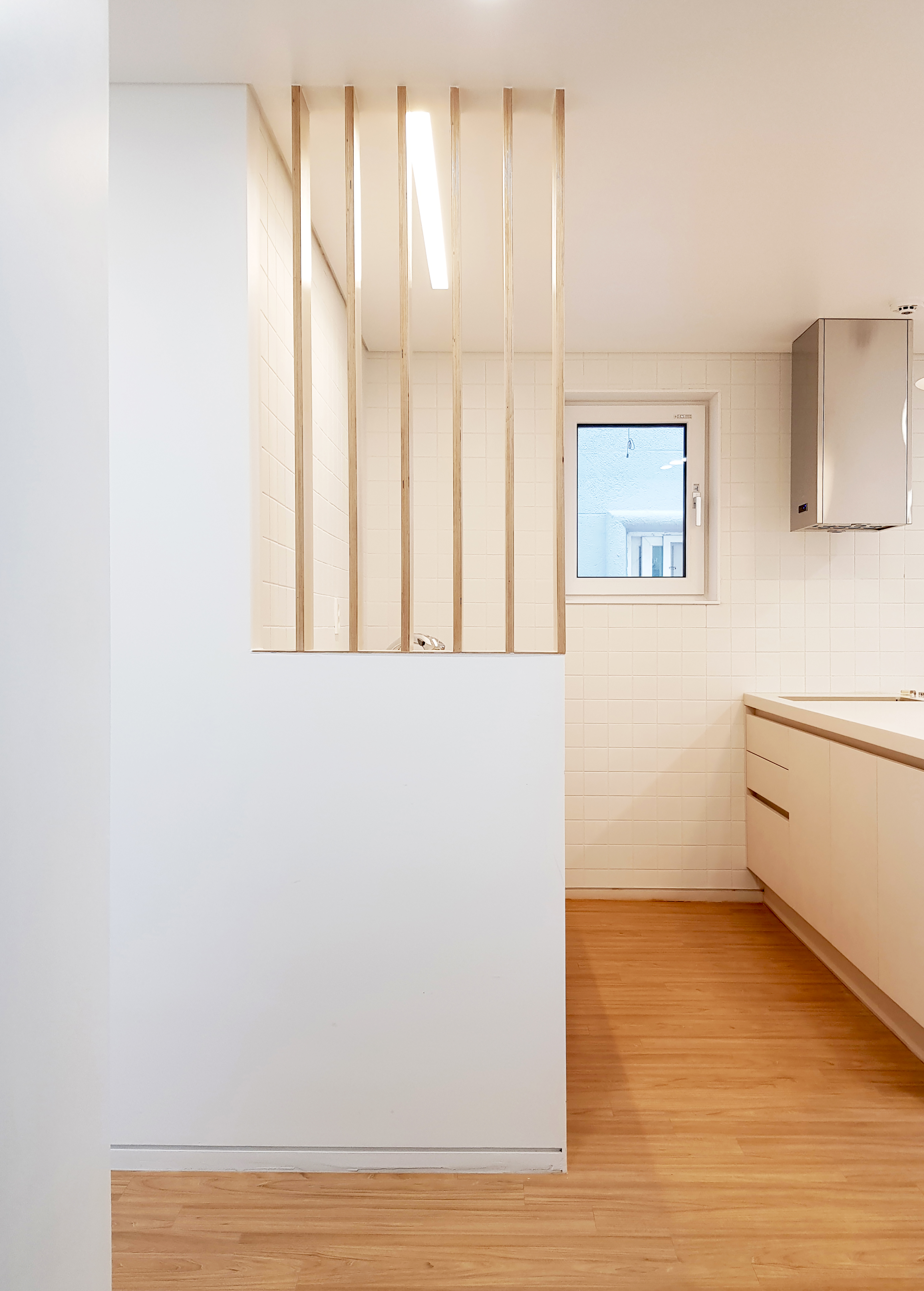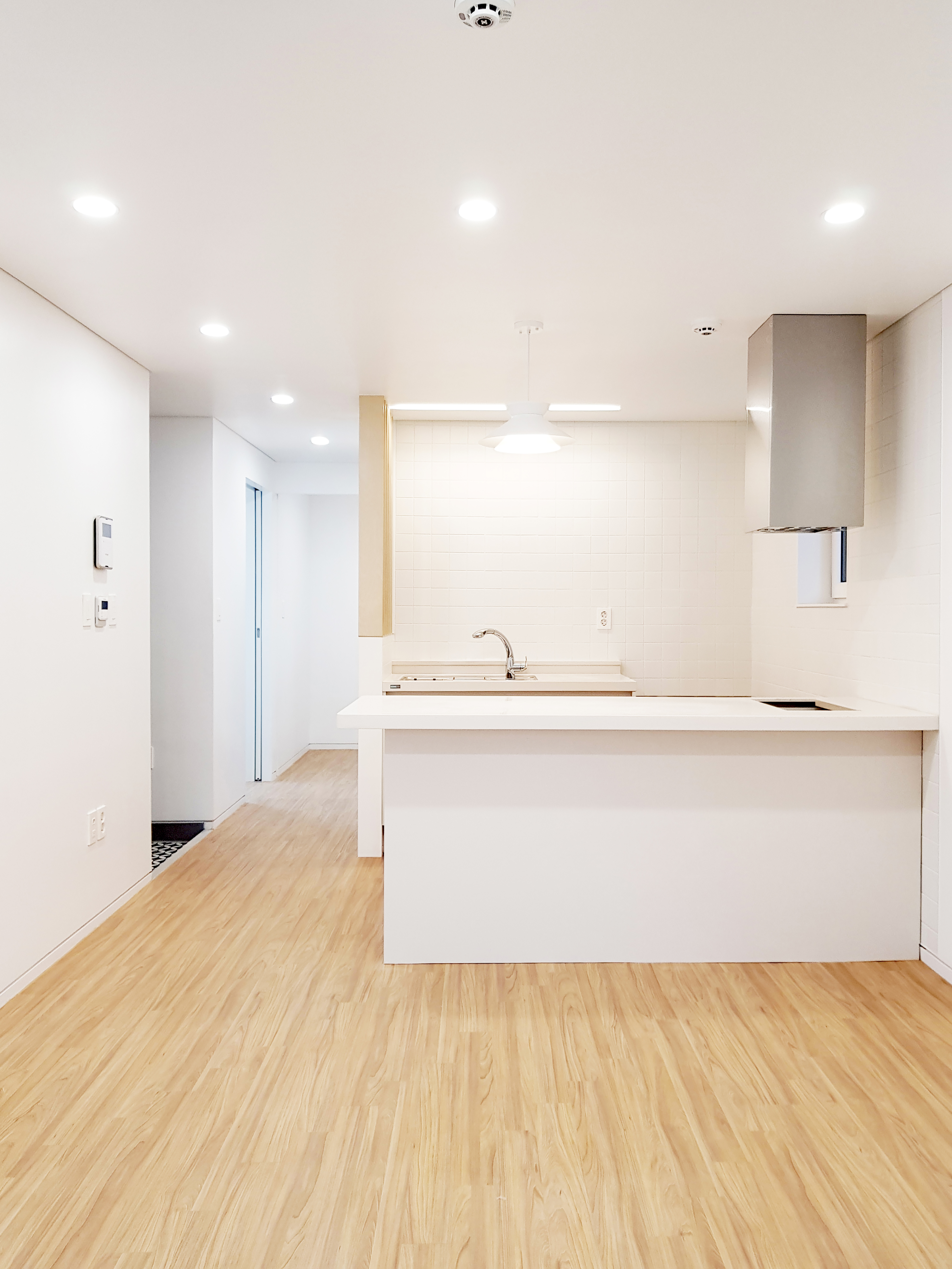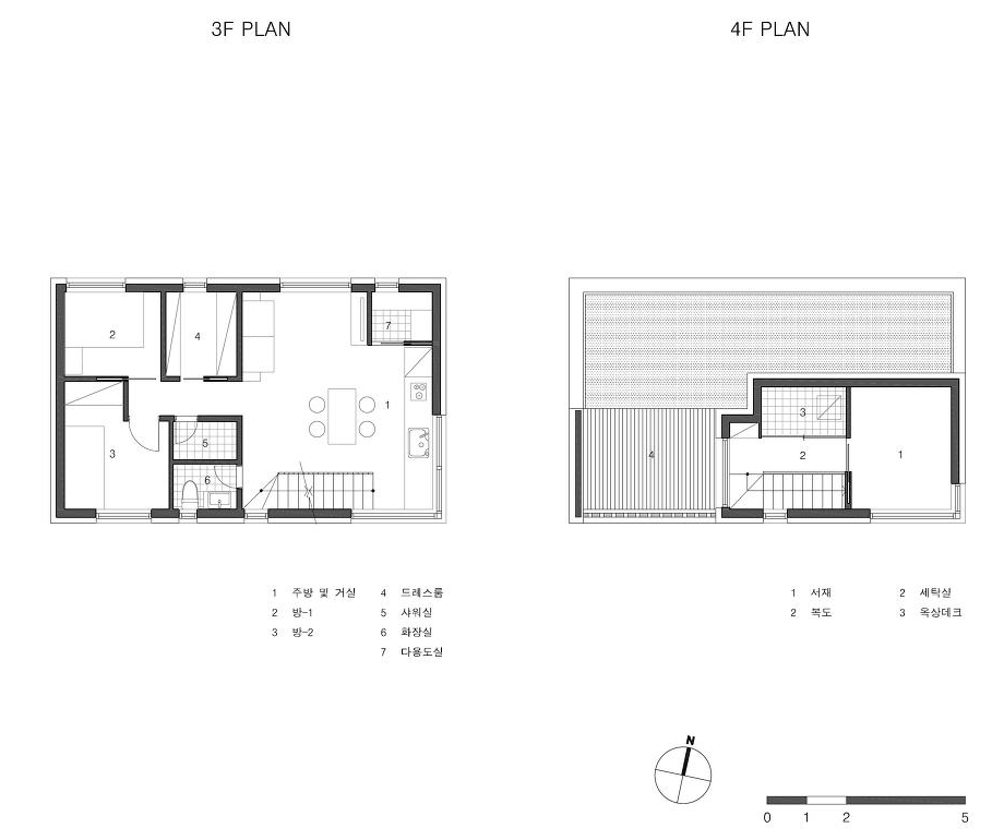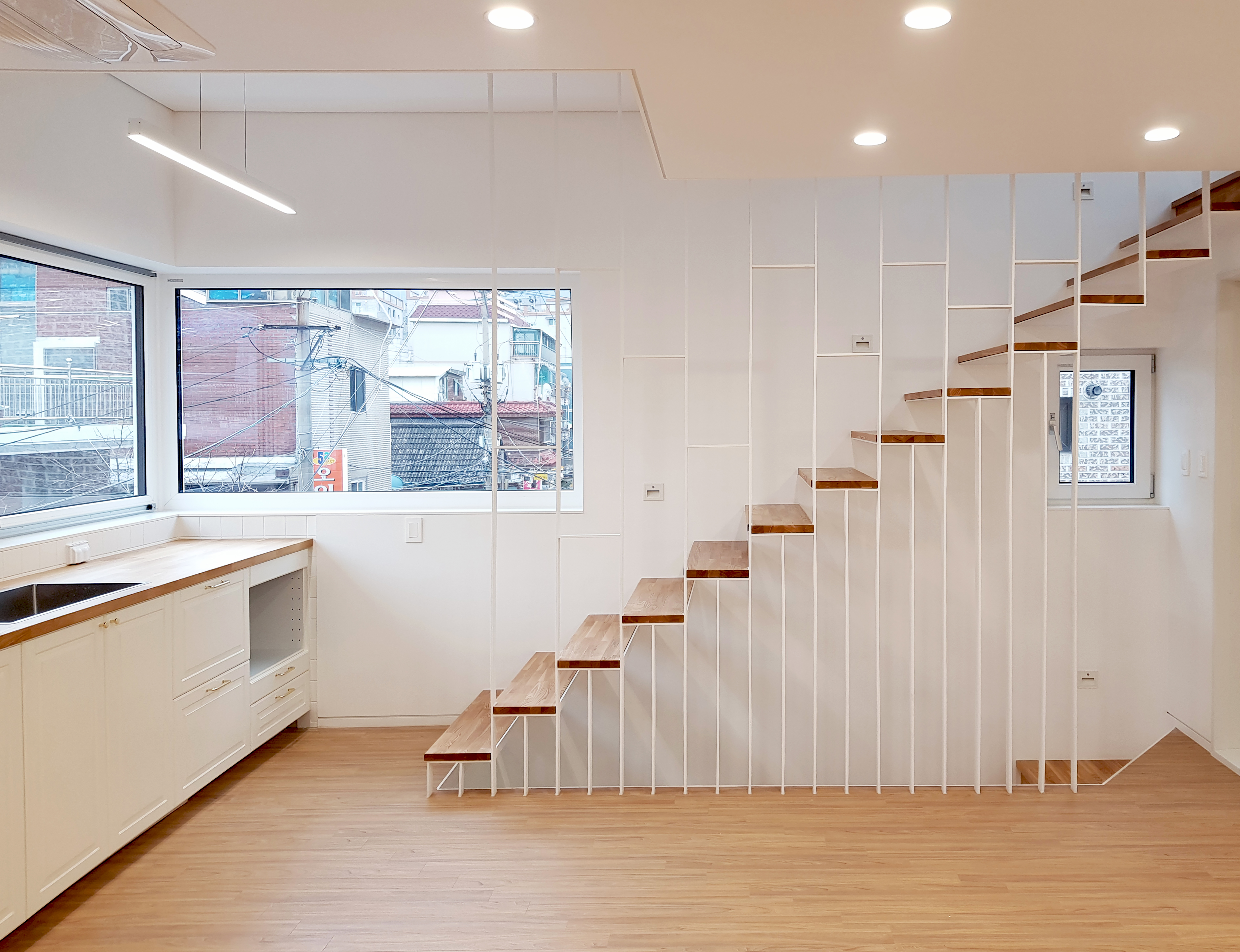 The first floor of Cotton House has a neighborhood living facility and parking lot, and the second floor has a rental residential space with two rooms. The third and fourth floors, which are found through the front entrance on the second floor, are the client’s residential space, and there is a rooftop terrace in addition to the residential spaces. The area of each floor in the narrow site is about 50m². However, not only do the openness and lighting feel maximized from the interior space, but also the fact that the connection between the spaces were considered to be reasonable yet meticulous can be seen. The main interior spaces are open towards the road on the east side, and the bedroom was open towards the dead-end road on the south side to secure lighting. When the living room and dining room on the second and third floors are reached, an open staircase and the kitchen with an urban landscape are met. The most important point of the architect’s design was to border the common spaces, where they face one another, and the independent private spaces within the life of the client’s residential space in a loose space form. In this way, the interior staircase of the living room emphasizes the openness as much as possible and naturally connects the sight and circulation. Most of the doors have a pocket door format. Furthermore, all parts including the walls and the roof of Cotton House were designed with thorough exterior insulation. In particular, an exterior insulation waterproof method was applied to the flat roof in order to resolve its troublesome waterproof defect and thermal bridge, and a careful construction process was carried out. ‘Cotton House’, which has newly settled down in Myeonmok-dong’s residential area, is overlapped and stacked with suitably connected small spaces. It is a residential space that faithfully captures the daily life that is warm and cozy like a blooming cotton flower.