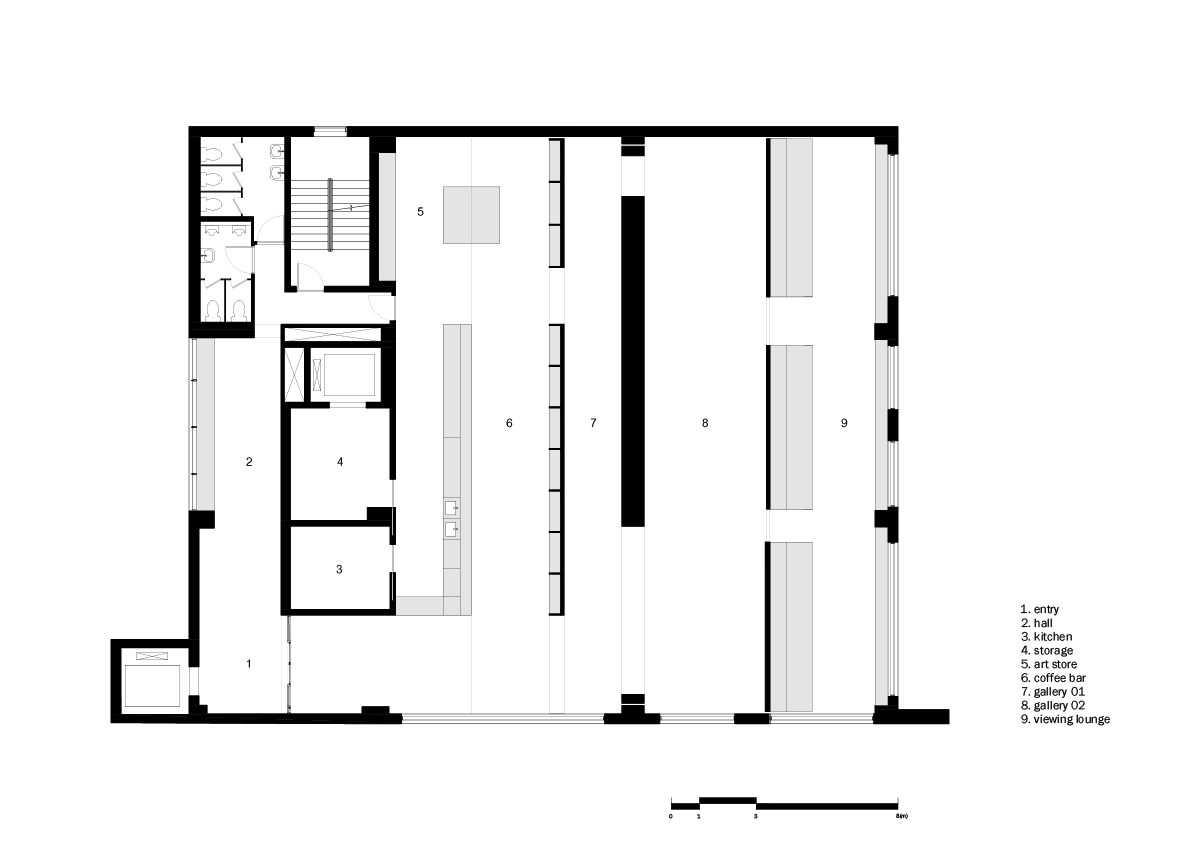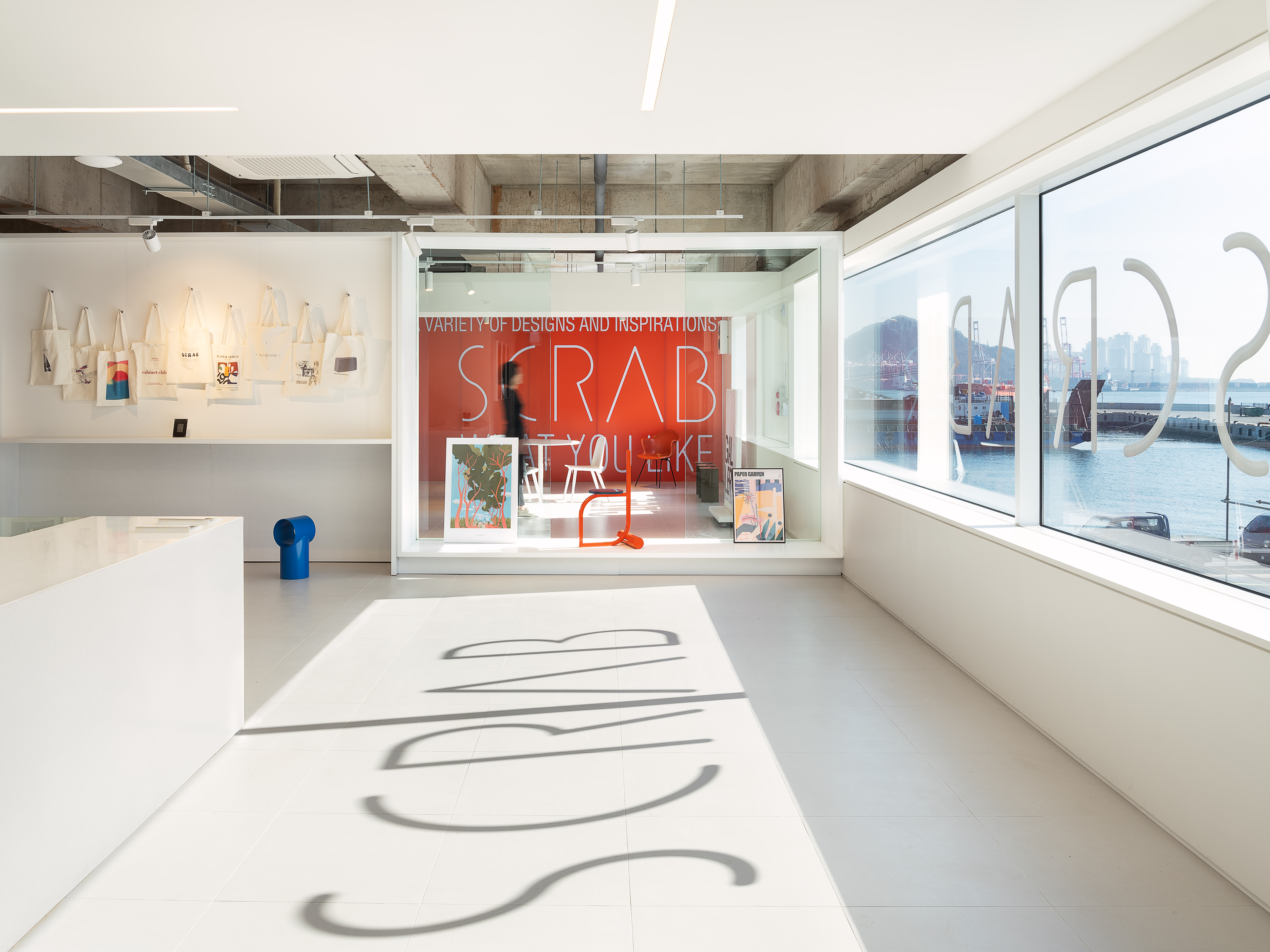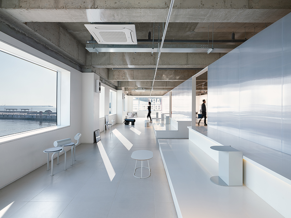 Scrab is a gallery cafe located in Yeongdo, the southern edge of Busan, with a unique industrial landscape that changes every moment. The interior space is a complex cultural space that contains various programs such as cafes, exhibition spaces, design editing shops, and indoor viewing seats, and was planned through repeated use of the white wall, which is the basic element of the traditional exhibition method. The interior space is designed like a maze of white walls, and consists of various textured white walls such as gypsum boards, polycarbonates, shelves, and glass, which are designed to feature exhibition halls, canvases, and shelves for various artists.Visitors walk through this space and gradually experience the sea, ports, and industrial landscapes through the openings between the walls, and through this experience, they remember the relationship between visitors, writers, and artworks in a new way.