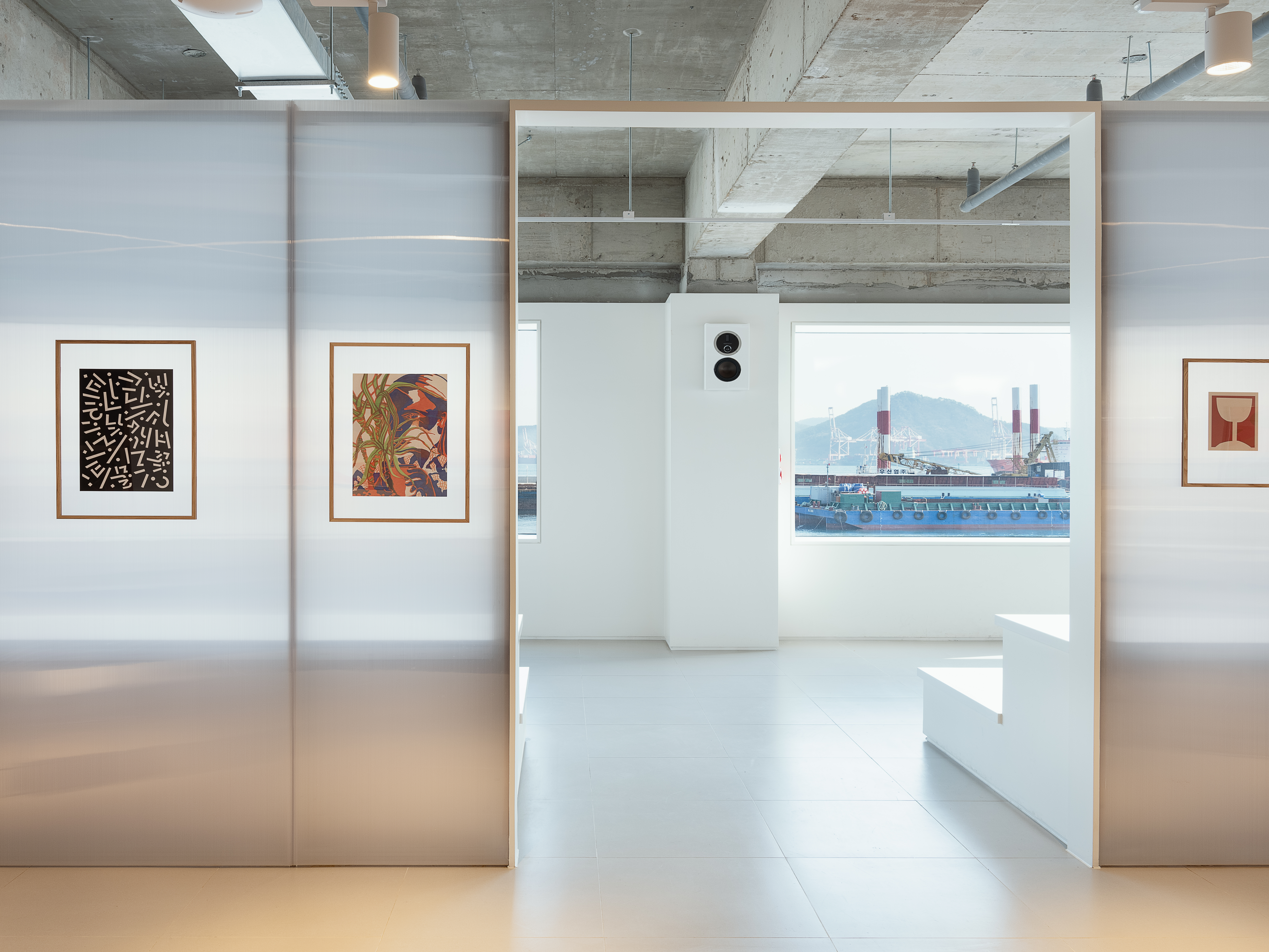 내부공간은 카페, 전시공간, 디자인 편집숍, 실내관람석 등 다양한 프로그램을 담아내는 복합문화공간으로서 전통적 전시방식인 화이트 큐브의 기본적인 요소인 ‘흰 벽’의 반복적인 사용과 재료의 변화를 통해 계획되었다. 내부공간은 흰 벽으로 이루어진 미로와 같이 설계되어 석고보드, 폴리카보네이트, 선반, 유리 등 질감을 가지는 다양한 흰벽들로 구성되어 있으며, 이 벽들은 다양한 작가들의 작품들을 위한 전시홀, 캔버스, 선반으로 구성되어 여러 가지 행위들을 담아낼 수 있는 공간으로 계획되었다.관람객들은 이 공간을 거닐며 벽들 사이의 개구부를 통해 바다, 항구, 산업의 풍경들을 점진적으로 경험하고, 이러한 경험을 통해 관람객, 작가, 예술품의 관계를 새로운 방식으로 기억하게 된다.