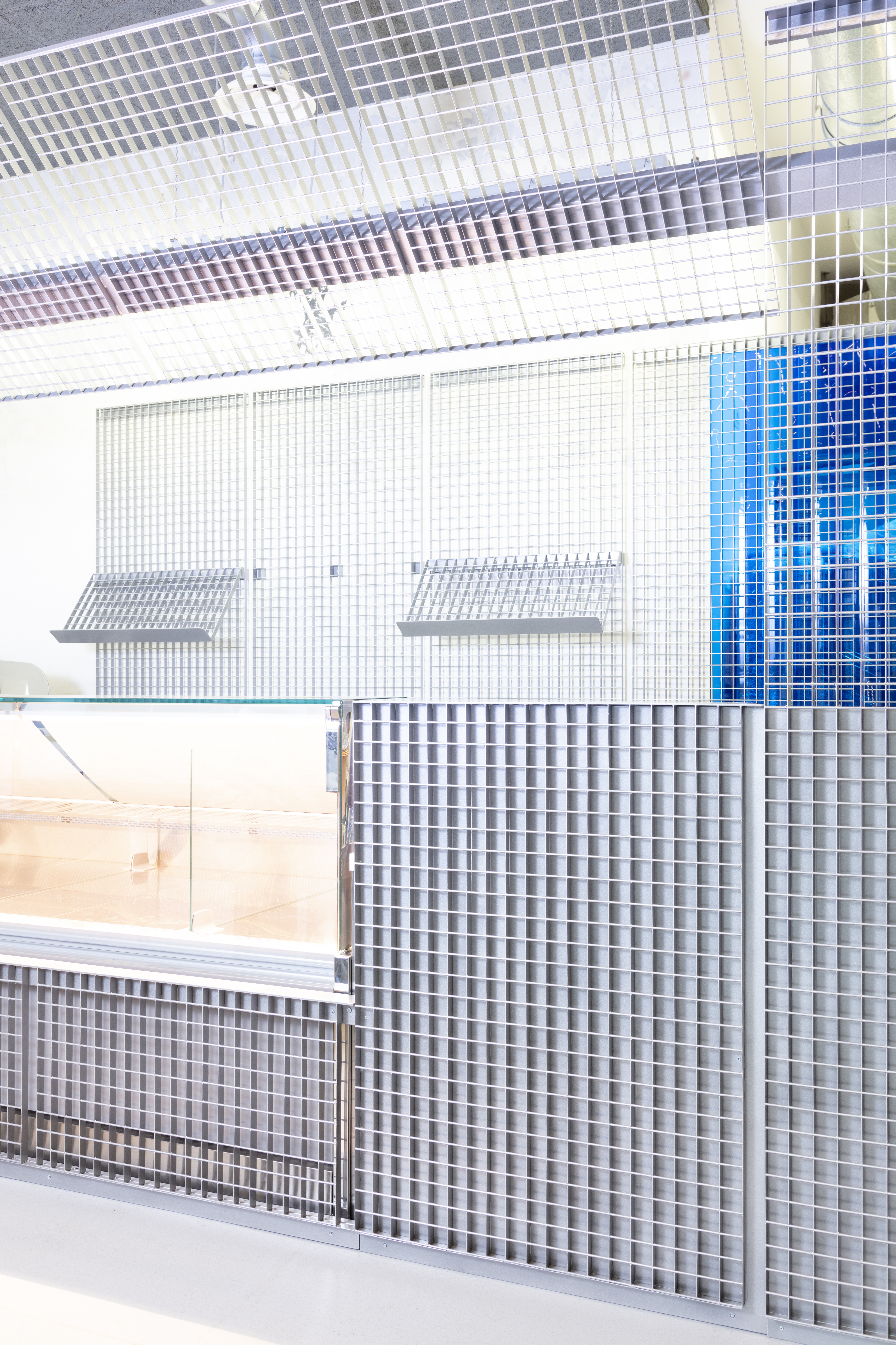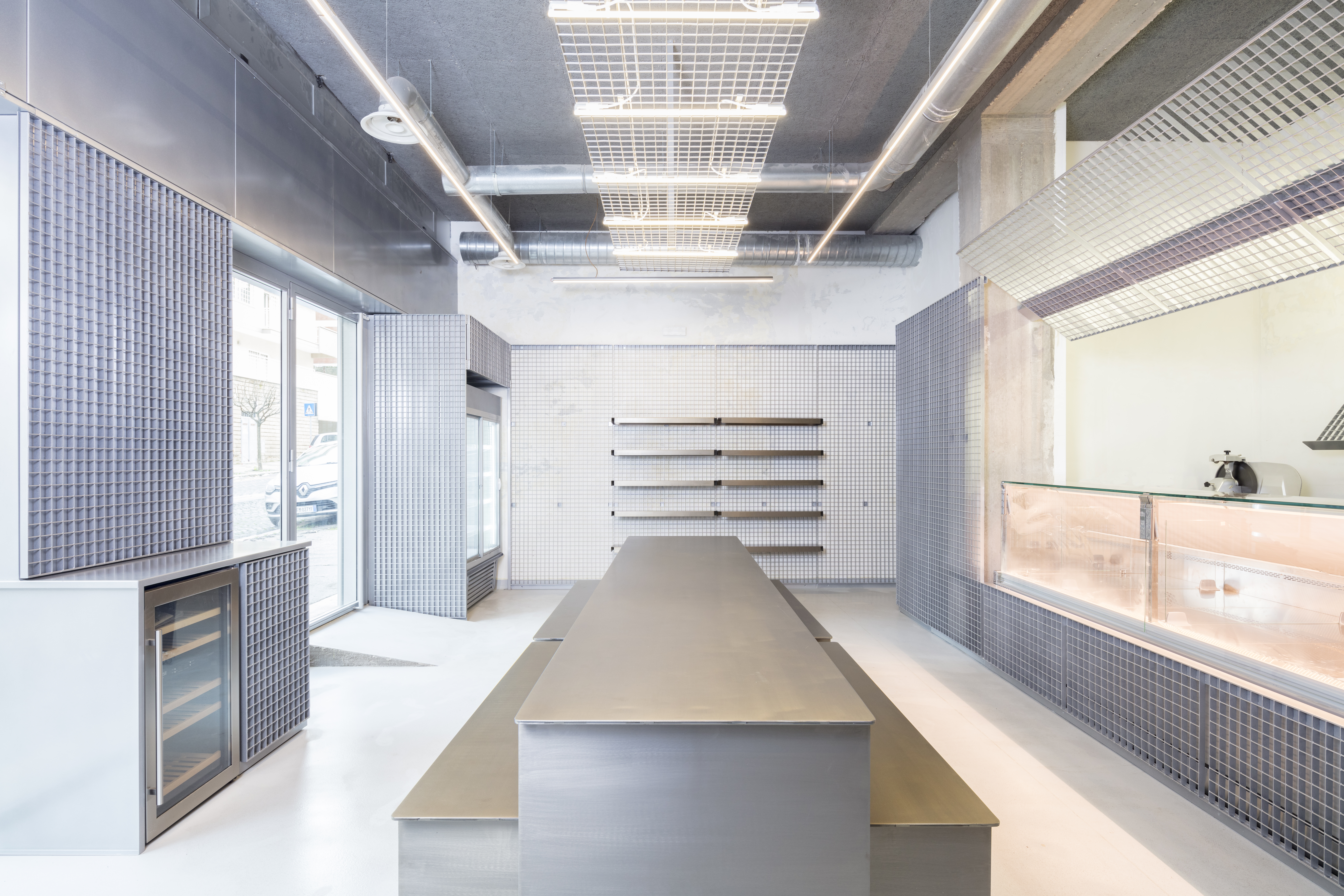 Pizzicarola is a new grocery store that opened at the beginning of 2022 in the Monteverde district of Rome. Created to respond to the changing needs related to the purchase and experience of food in the post-pandemic reality, the store intends to redefine a consolidated typology, expanding the possibilities of social and symbolic interaction between customers, space, and products. The commercial space opens to the street through two large windows, framed within a metal grid. The metal grid panels continue inside and define the perimeter of the space, completely covering it. The metal grid becomes a wall cladding, a piece of furniture, a chandelier, giving the space its distinctive character and building the infrastructure of the modular display system that develops along the walls, completely freeing the interior space of the store.
