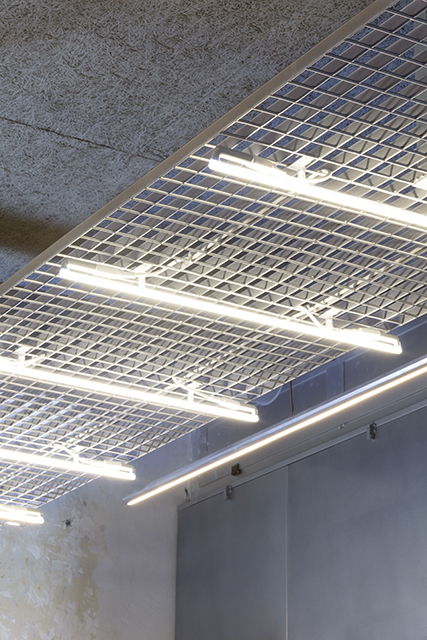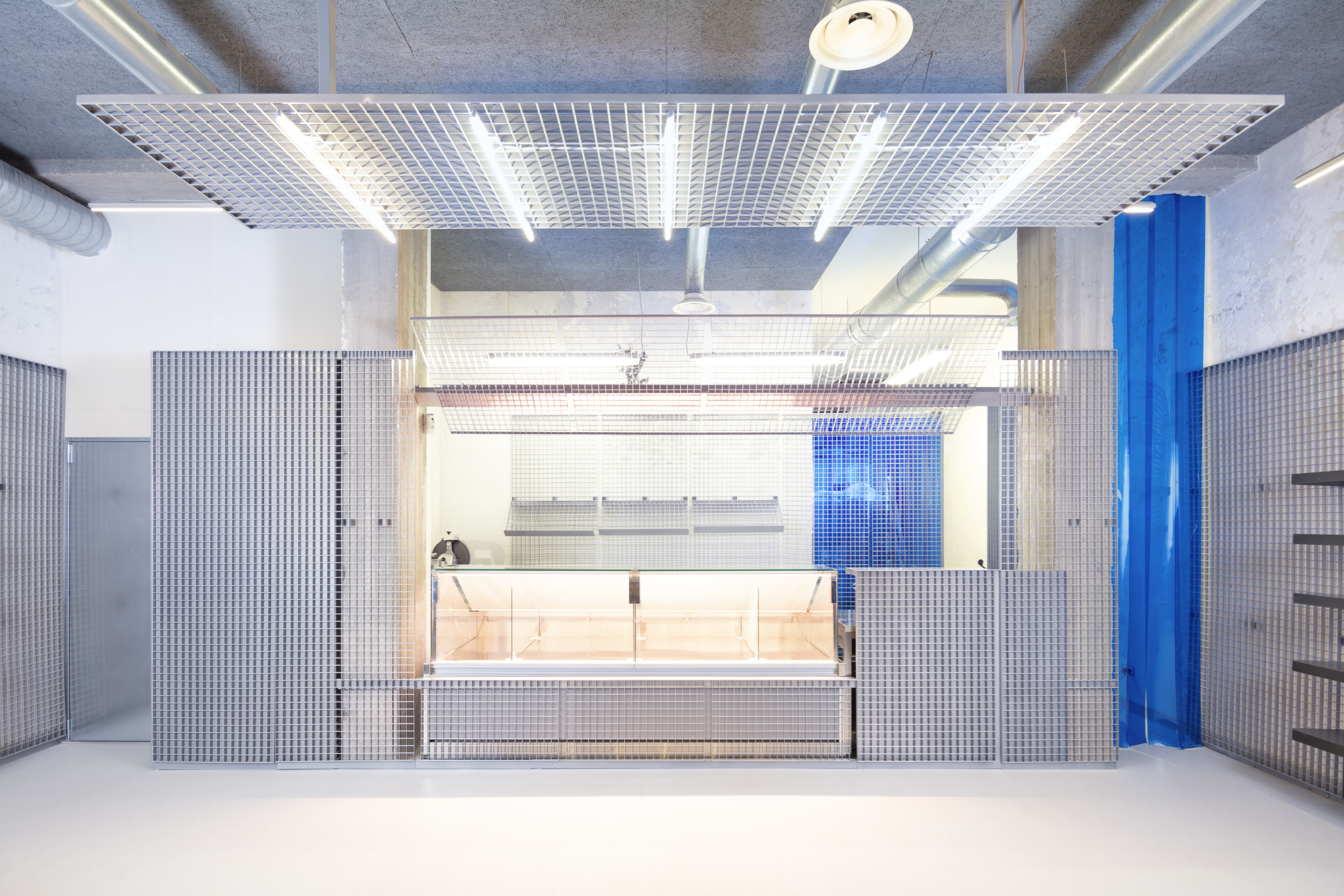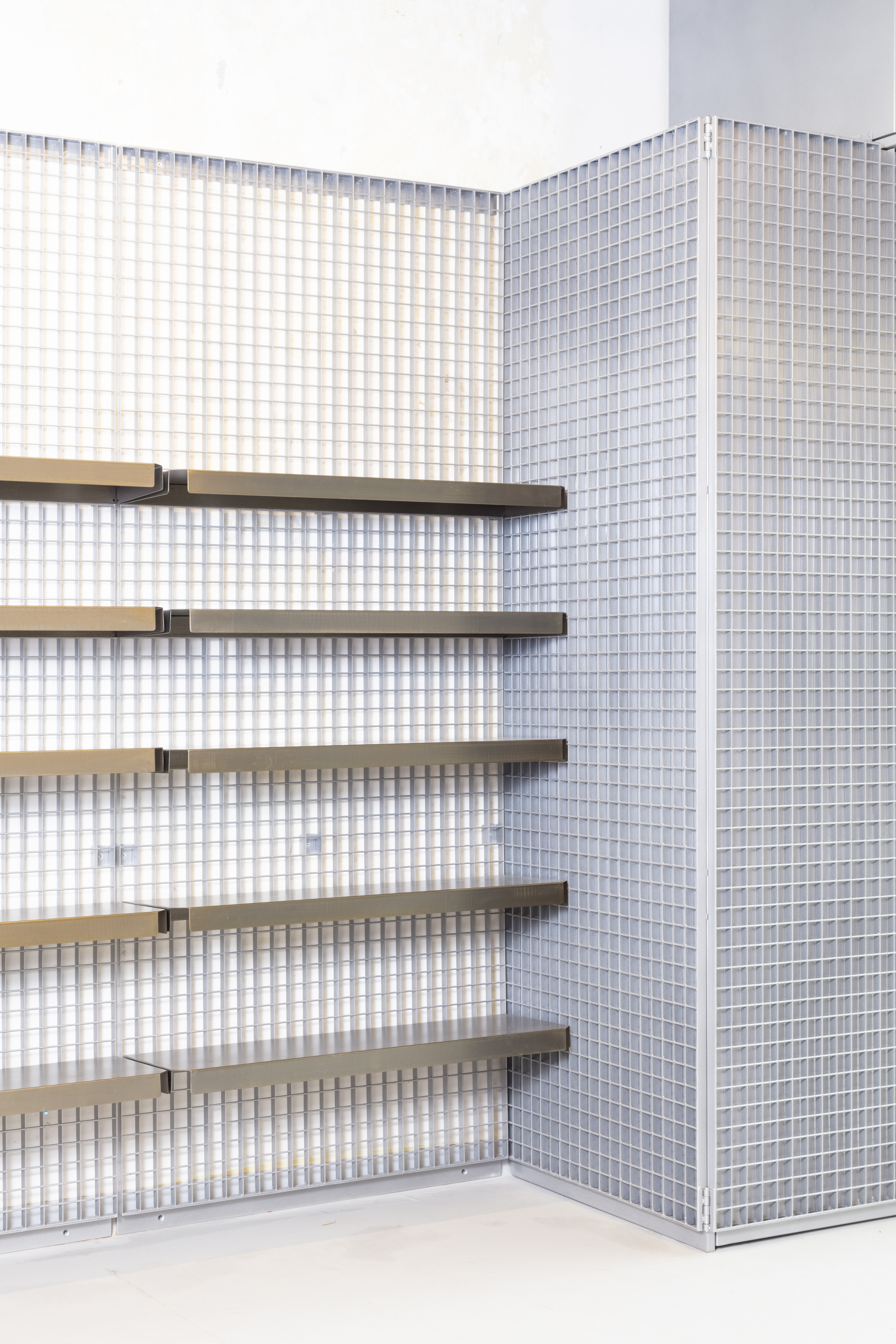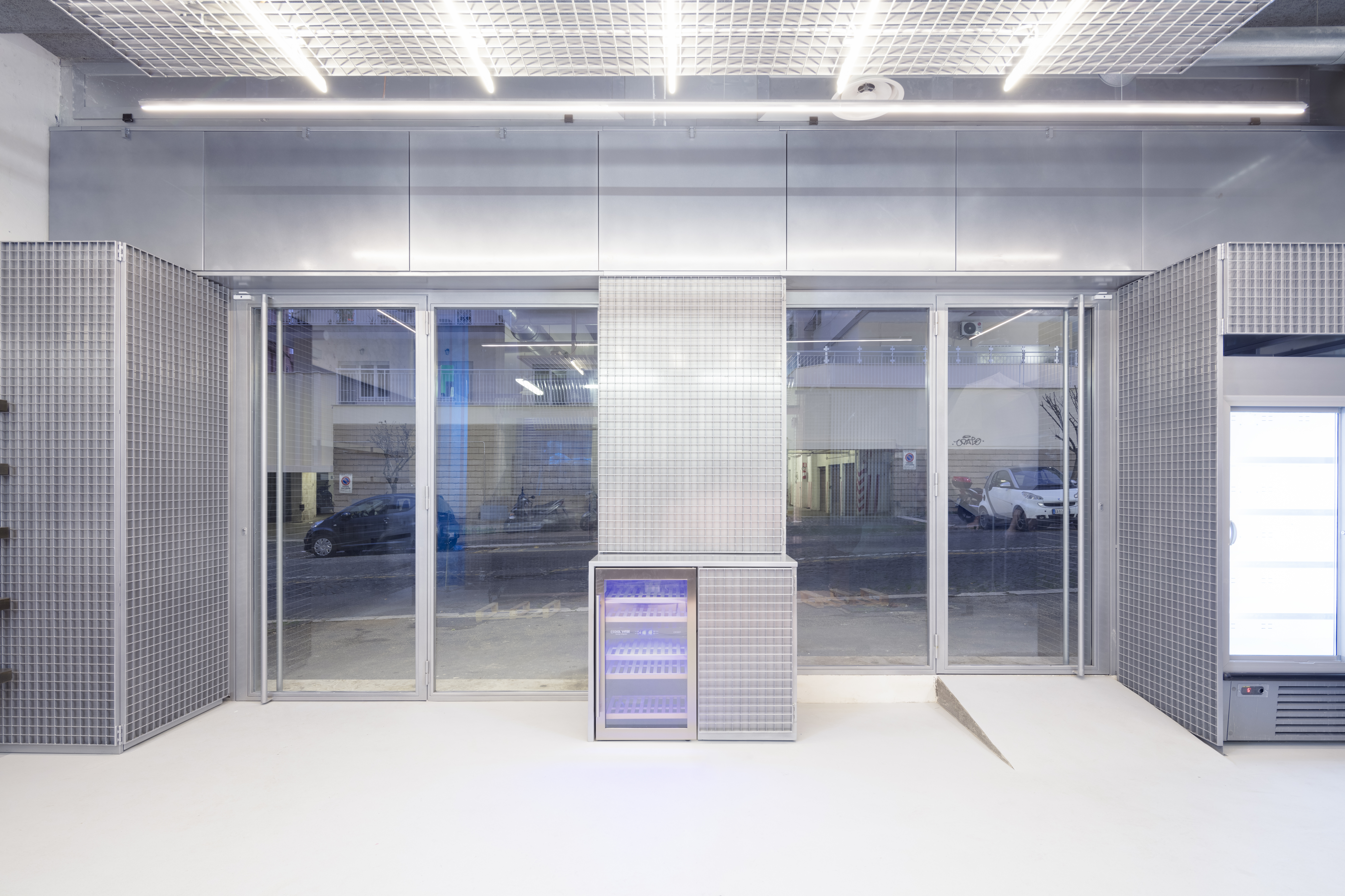 Pizzicarola is a new grocery store that opened at the beginning of 2022 in the Monteverde district of Rome. Created to respond to the changing needs related to the purchase and experience of food in the post-pandemic reality, the store intends to redefine a consolidated typology, expanding the possibilities of social and symbolic interaction between customers, space, and products. The commercial space opens to the street through two large windows, framed within a metal grid. The metal grid panels continue inside and define the perimeter of the space, completely covering it. The metal grid becomes a wall cladding, a piece of furniture, a chandelier, giving the space its distinctive character and building the infrastructure of the modular display system that develops along the walls, completely freeing the interior space of the store.