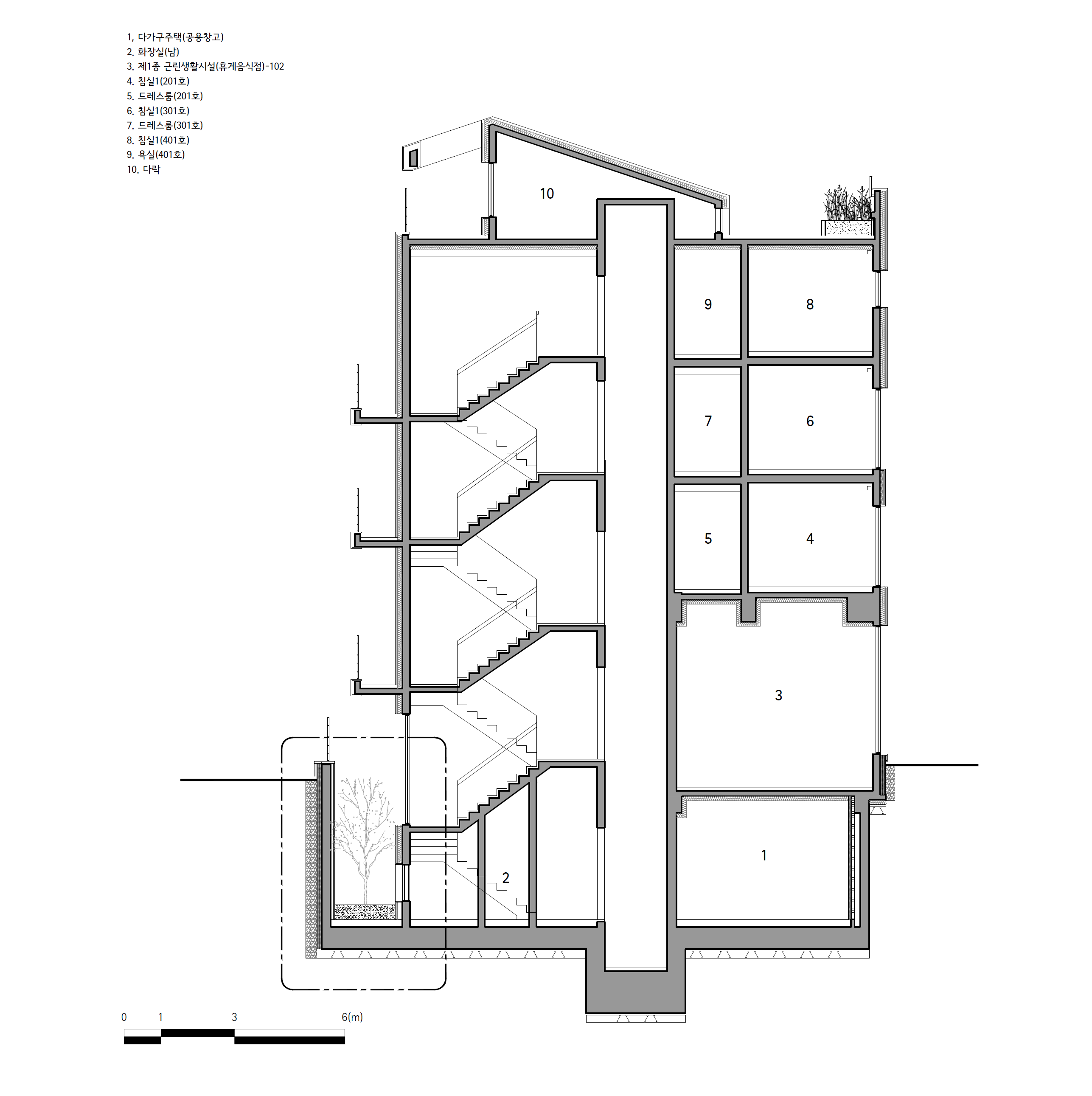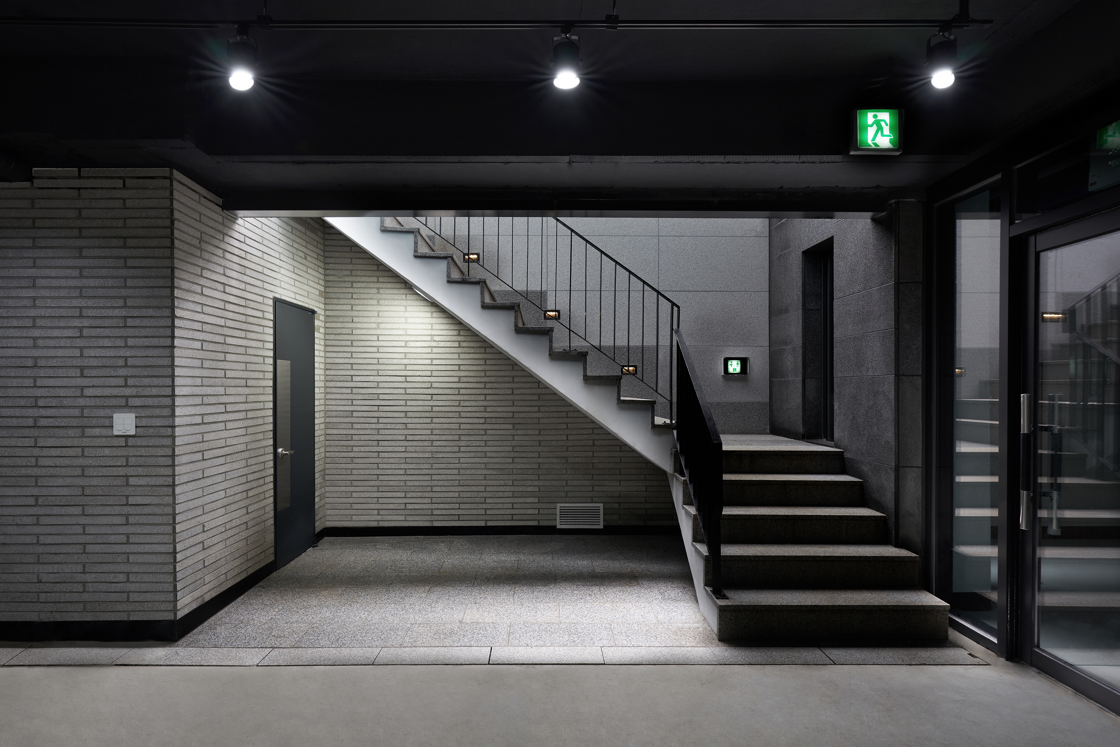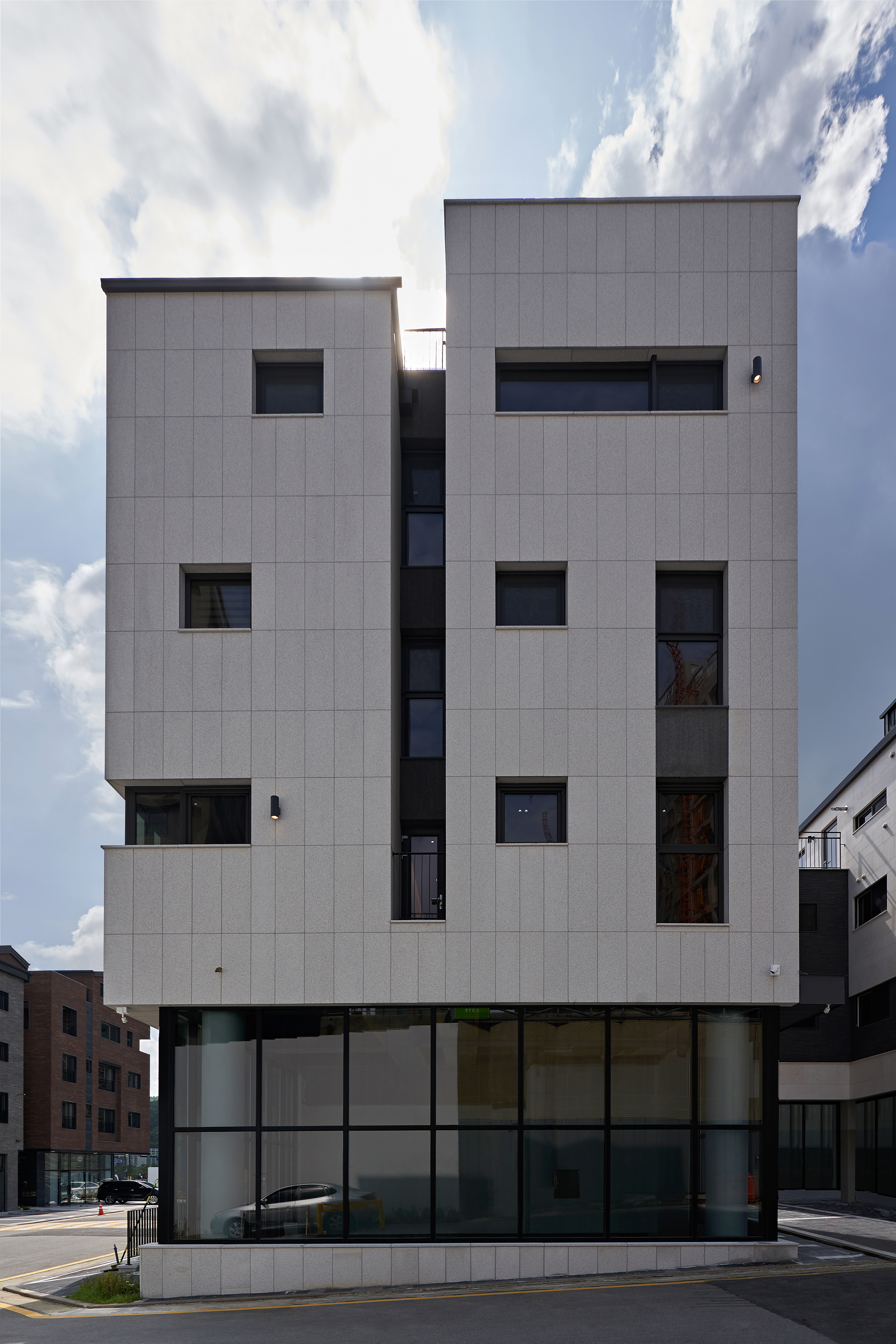 Cheongyeonjae is a commercial multi-family housing in which a total of three households can live. The site is a plot for a store residence in Godeung district, a housing site development area in Seongnam. Cheongyeonjae has competitiveness with a variety of unique compositions that deviate from the monotonous basic type of ordinary commercial housings.The total of three households were organized with one household on each floor, allowing the quality of the residences and as much leasable area as possible to be ensured. The area of the reduced parking lot was absorbed into the shopping area on the first floor, and a shopping area with a larger space compared to the same sites in the surrounding was secured. In addition, the shopping area, where the level difference of the site acted as a disadvantage, was attempted to be overcome with floor height. Since one of the two roads that adjoin the site at the corner buries about 60cm of the site, the floor height of one side was raised that much, separating the residential space on the second floor with a vertical(stairway) circulation plan, and an open public space with a high floor height was arranged on one side while a cozy and private space was provided on the other side by forming it into a bedroom. This skip-floor type plan composition allows various senses of space to be experienced that cannot be found in general commercial housings. By applying a sunken garden that was formed into an exterior space resembling an interior space to the underground space, in which an environmentally unfavorable closed spatial composition is inevitable, it is more advantageous in terms of lighting and ventilation, and it is not only used as a connecting space to the underground shopping area but also acts as a breathing space. As one goes up to the first floor from the basement through the stairs, the entire concrete wall is filled with a large window at the stair landing area, and green bamboos are planted behind the window.