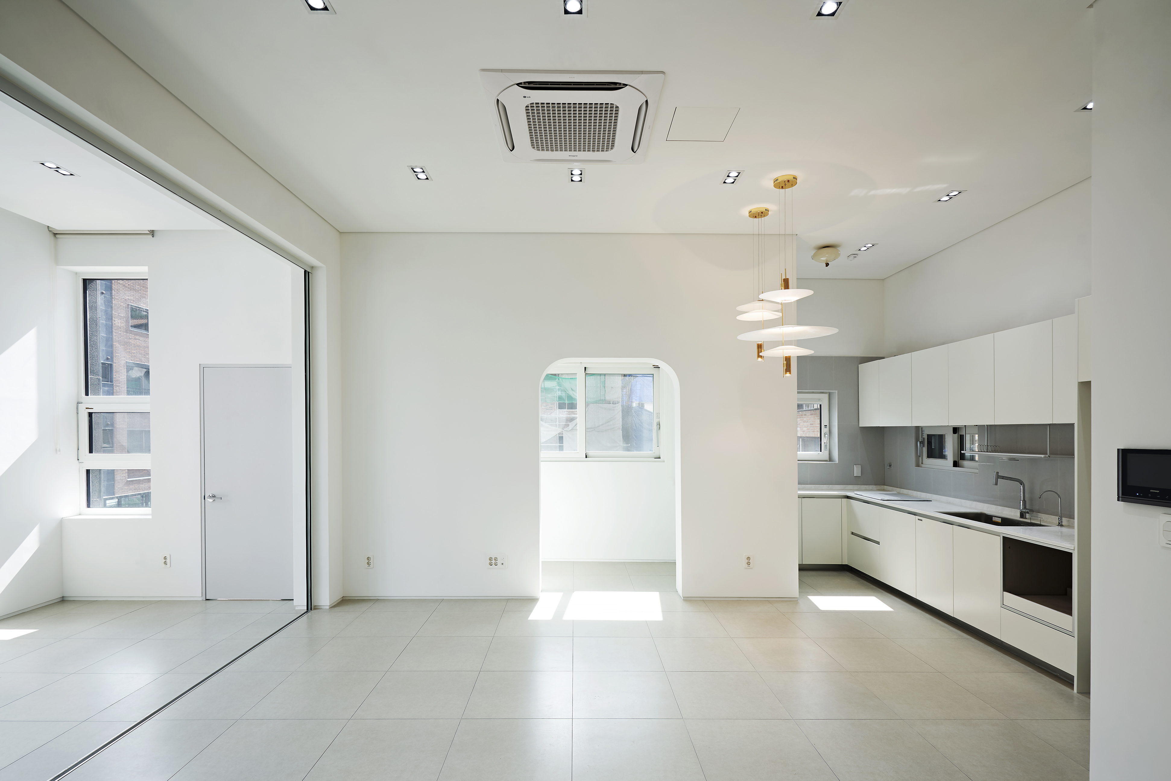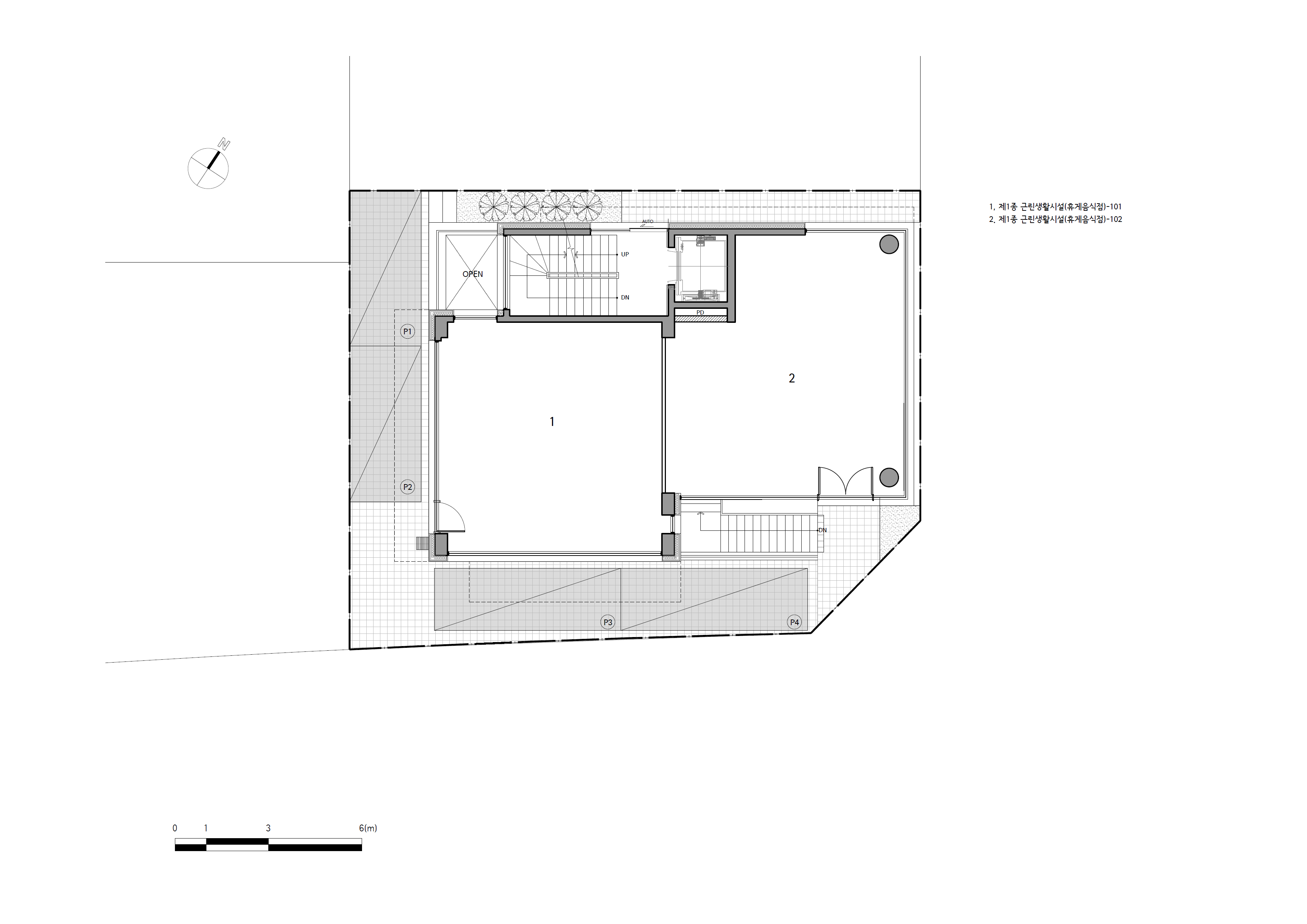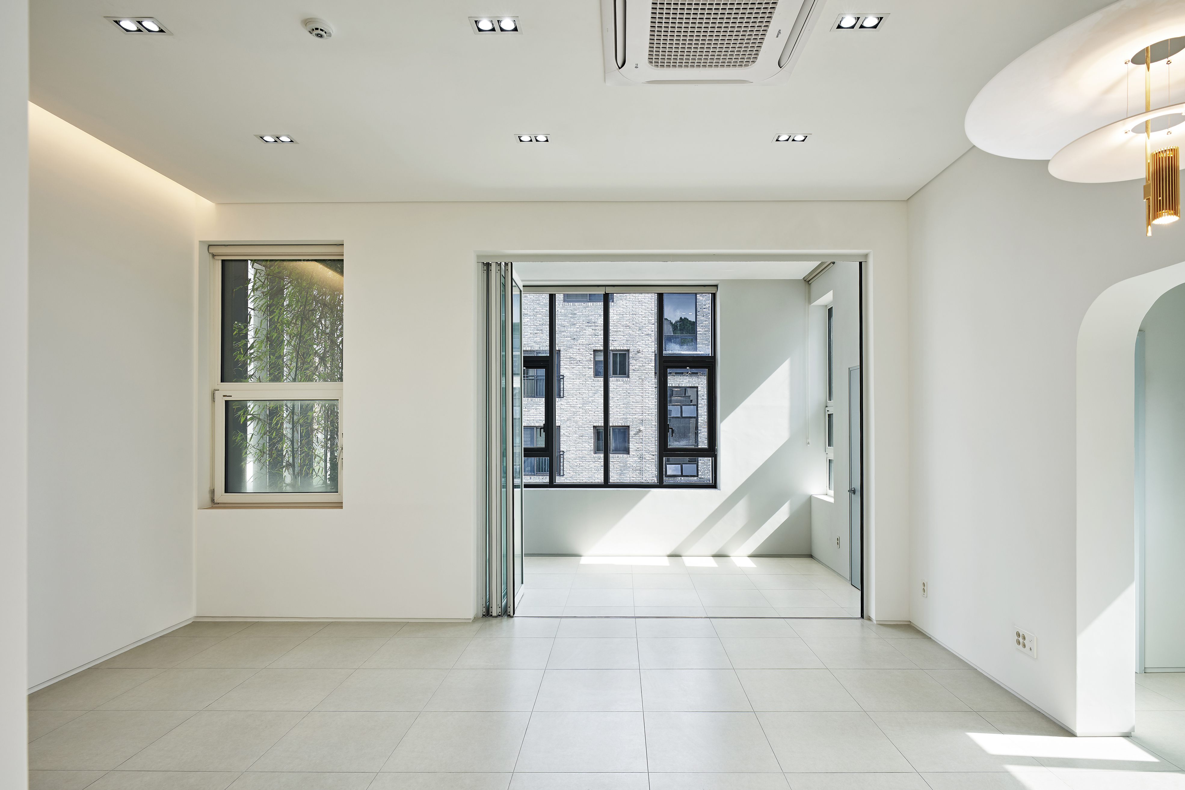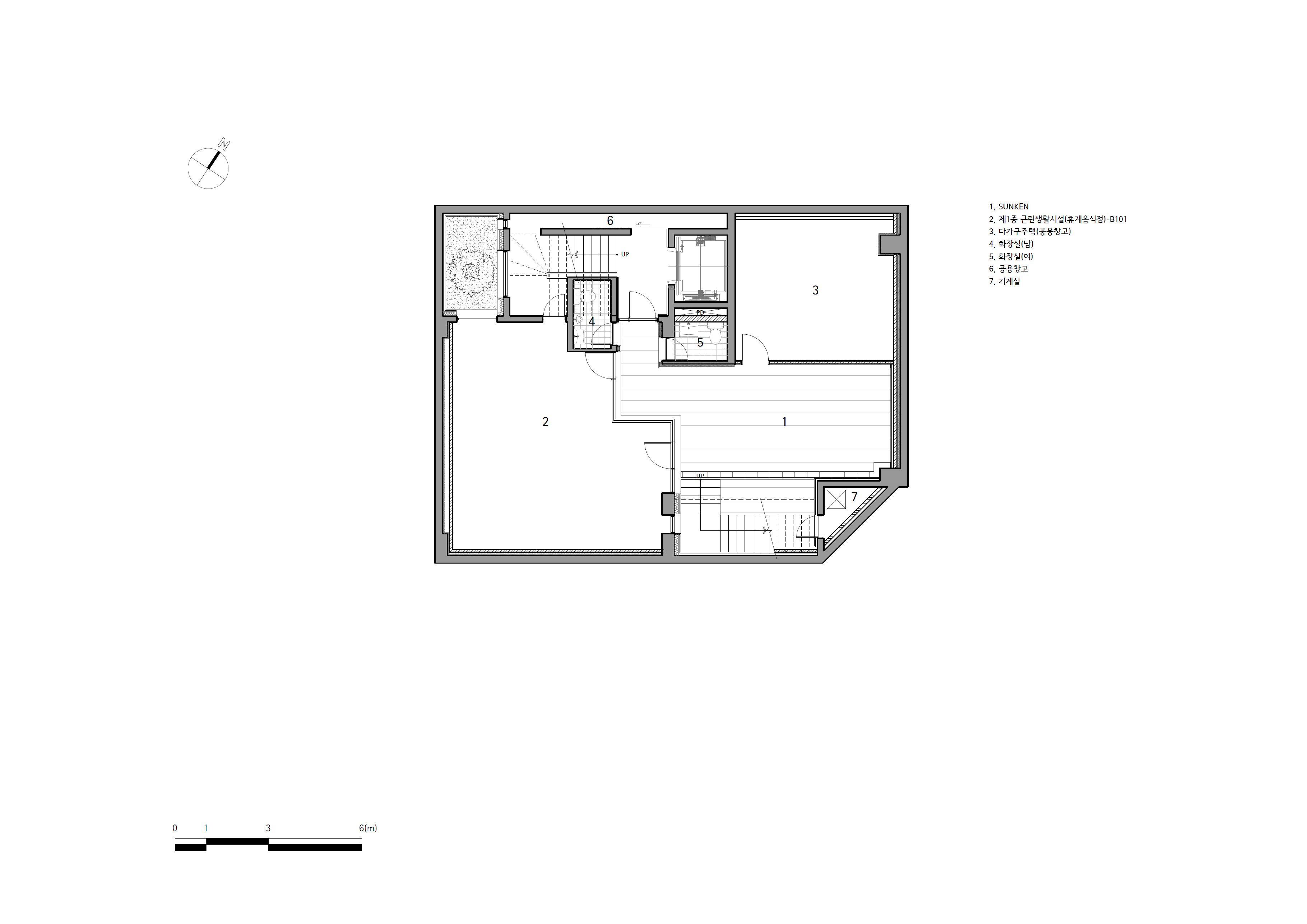 Cheongyeonjae is a commercial multi-family housing in which a total of three households can live. The site is a plot for a store residence in Godeung district, a housing site development area in Seongnam. Cheongyeonjae has competitiveness with a variety of unique compositions that deviate from the monotonous basic type of ordinary commercial housings.The total of three households were organized with one household on each floor, allowing the quality of the residences and as much leasable area as possible to be ensured. The area of the reduced parking lot was absorbed into the shopping area on the first floor, and a shopping area with a larger space compared to the same sites in the surrounding was secured. In addition, the shopping area, where the level difference of the site acted as a disadvantage, was attempted to be overcome with floor height. Since one of the two roads that adjoin the site at the corner buries about 60cm of the site, the floor height of one side was raised that much, separating the residential space on the second floor with a vertical(stairway) circulation plan, and an open public space with a high floor height was arranged on one side while a cozy and private space was provided on the other side by forming it into a bedroom. This skip-floor type plan composition allows various senses of space to be experienced that cannot be found in general commercial housings. By applying a sunken garden that was formed into an exterior space resembling an interior space to the underground space, in which an environmentally unfavorable closed spatial composition is inevitable, it is more advantageous in terms of lighting and ventilation, and it is not only used as a connecting space to the underground shopping area but also acts as a breathing space. As one goes up to the first floor from the basement through the stairs, the entire concrete wall is filled with a large window at the stair landing area, and green bamboos are planted behind the window.