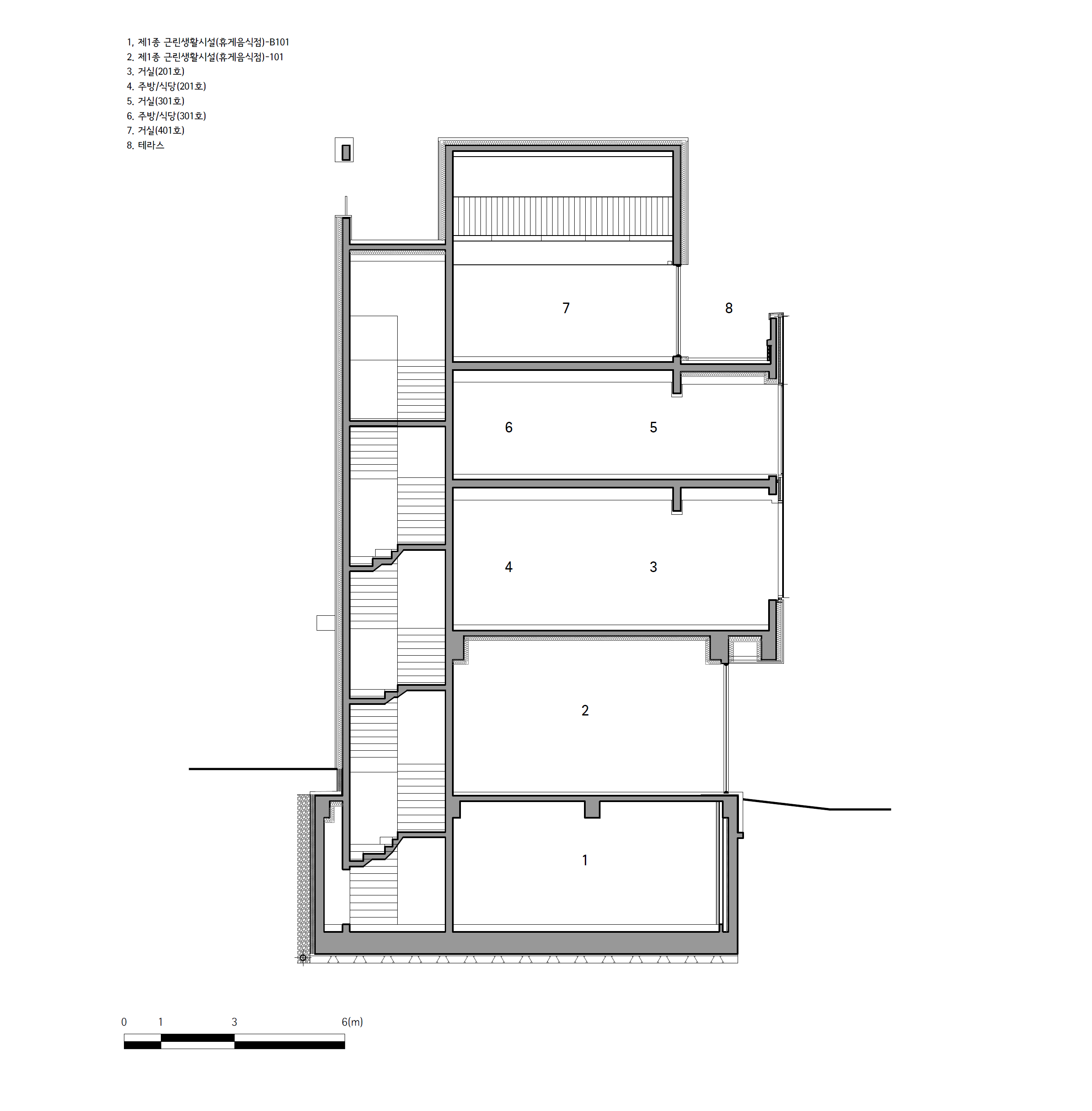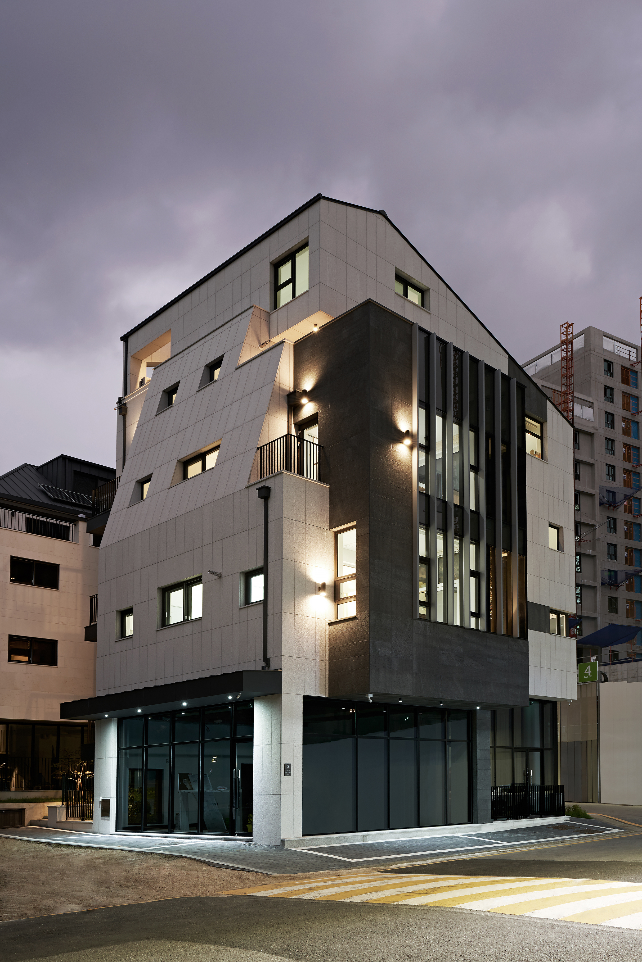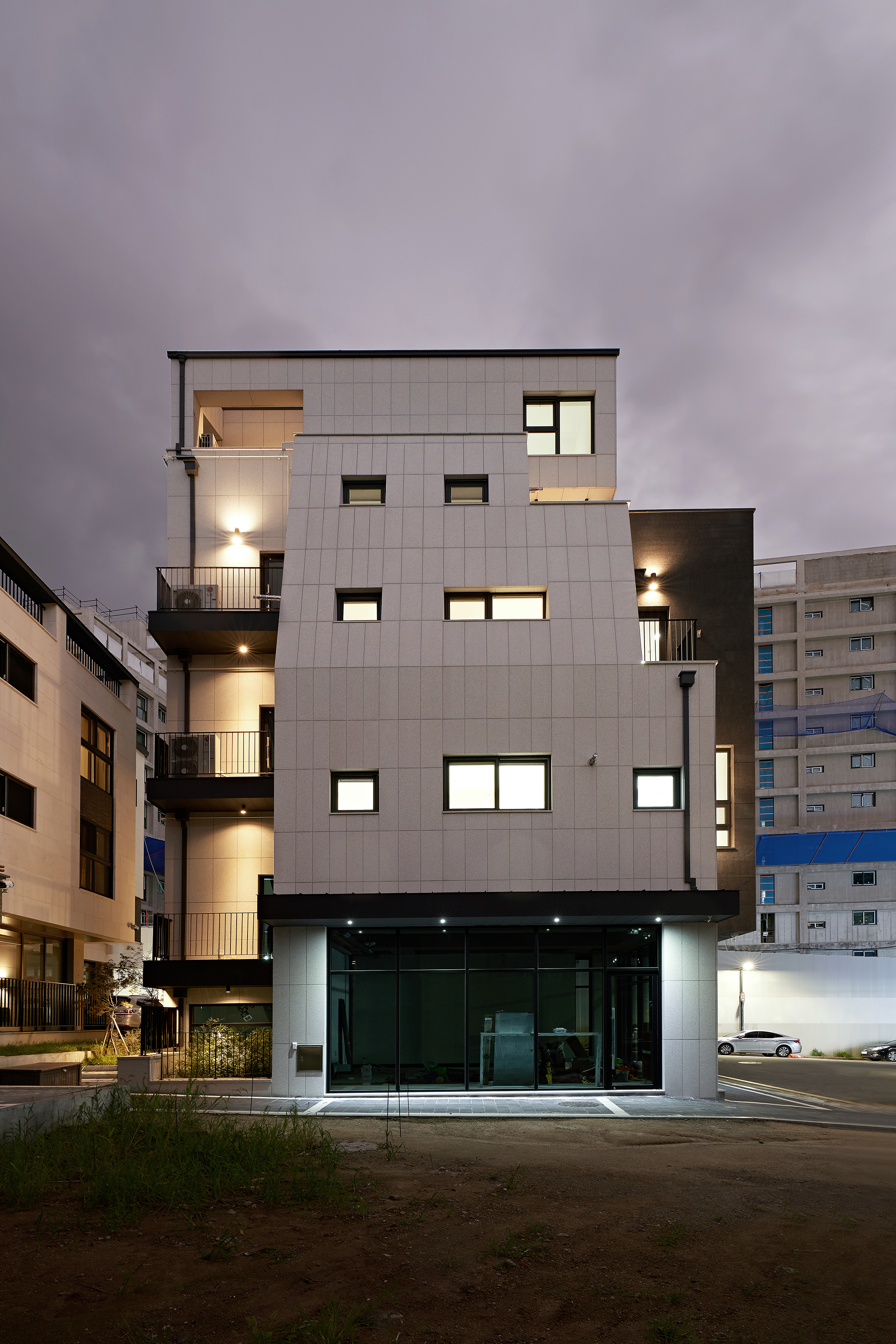 Cheongyeonjae is a commercial multi-family housing in which a total of three households can live. The site is a plot for a store residence in Godeung district, a housing site development area in Seongnam. Cheongyeonjae has competitiveness with a variety of unique compositions that deviate from the monotonous basic type of ordinary commercial housings.The total of three households were organized with one household on each floor, allowing the quality of the residences and as much leasable area as possible to be ensured. The area of the reduced parking lot was absorbed into the shopping area on the first floor, and a shopping area with a larger space compared to the same sites in the surrounding was secured. In addition, the shopping area, where the level difference of the site acted as a disadvantage, was attempted to be overcome with floor height. Since one of the two roads that adjoin the site at the corner buries about 60cm of the site, the floor height of one side was raised that much, separating the residential space on the second floor with a vertical(stairway) circulation plan, and an open public space with a high floor height was arranged on one side while a cozy and private space was provided on the other side by forming it into a bedroom. This skip-floor type plan composition allows various senses of space to be experienced that cannot be found in general commercial housings. By applying a sunken garden that was formed into an exterior space resembling an interior space to the underground space, in which an environmentally unfavorable closed spatial composition is inevitable, it is more advantageous in terms of lighting and ventilation, and it is not only used as a connecting space to the underground shopping area but also acts as a breathing space. As one goes up to the first floor from the basement through the stairs, the entire concrete wall is filled with a large window at the stair landing area, and green bamboos are planted behind the window.