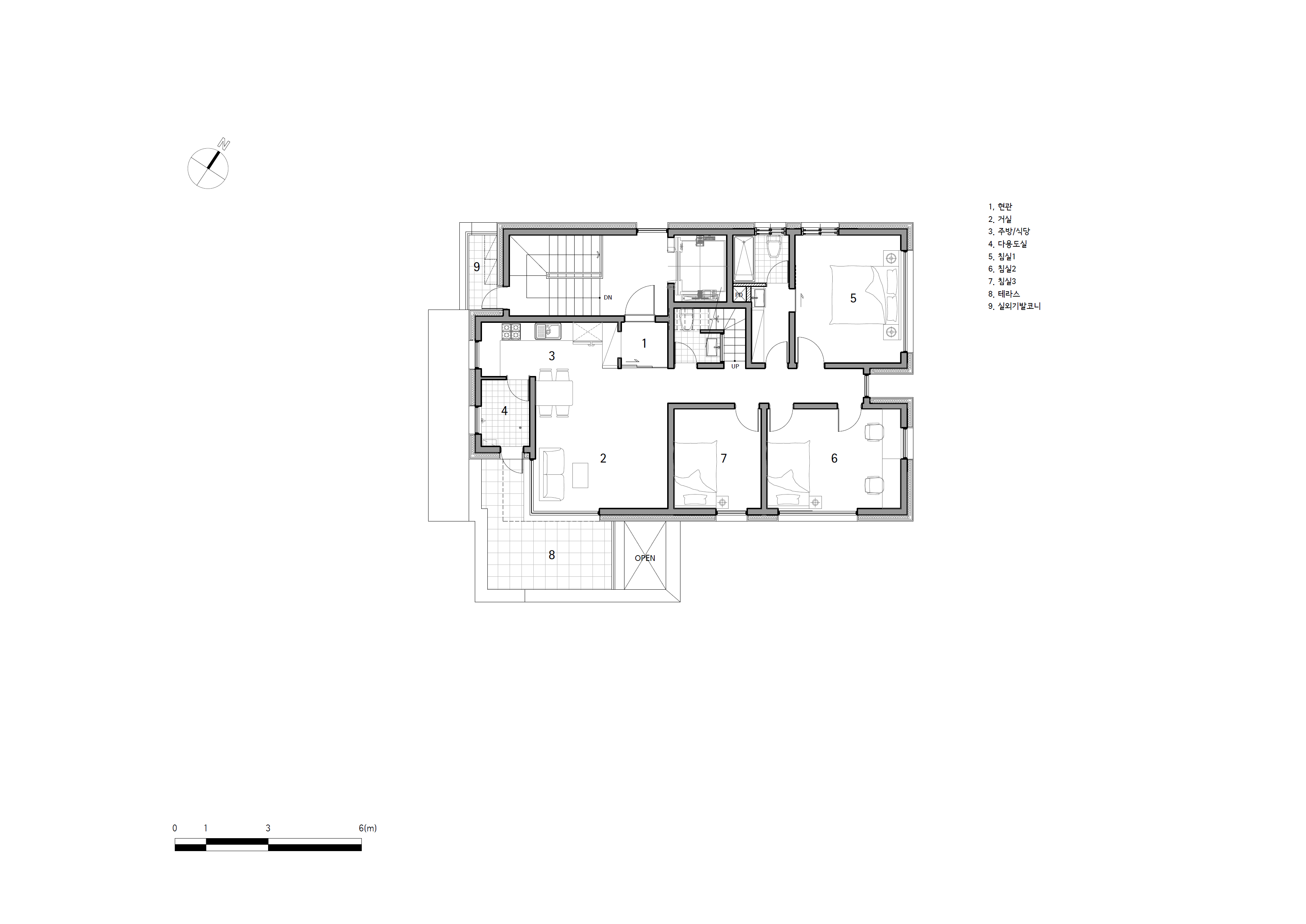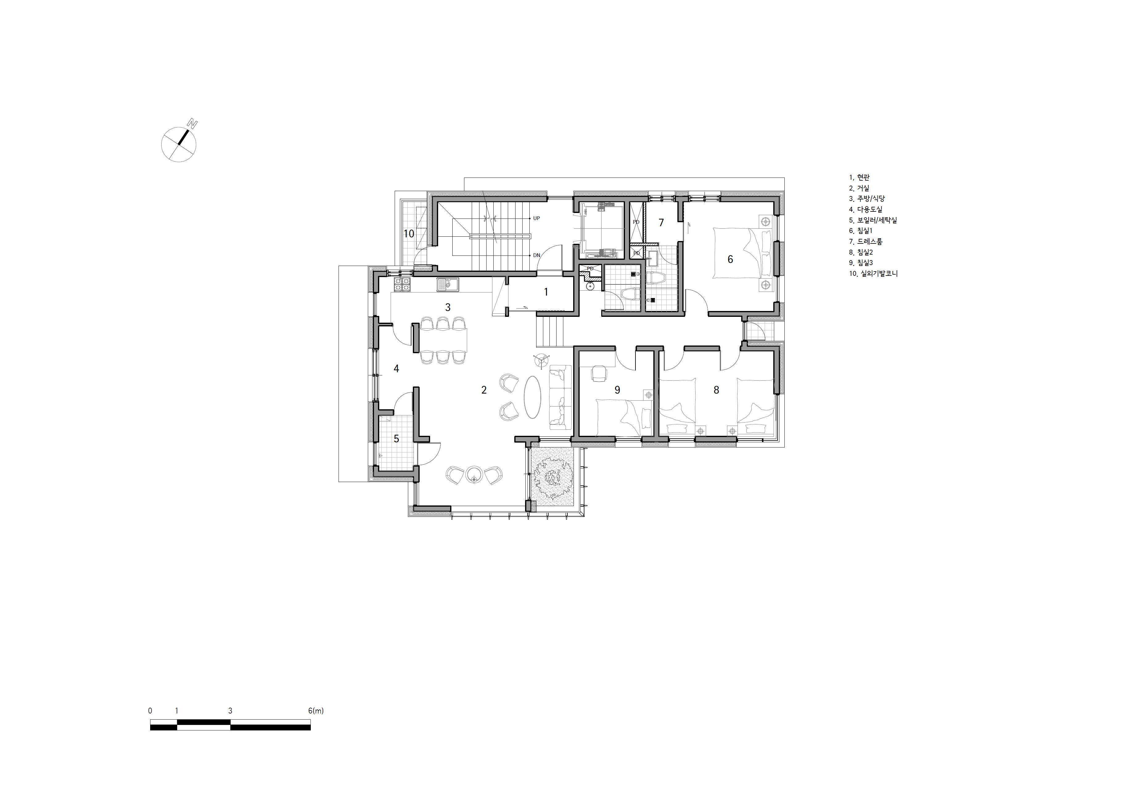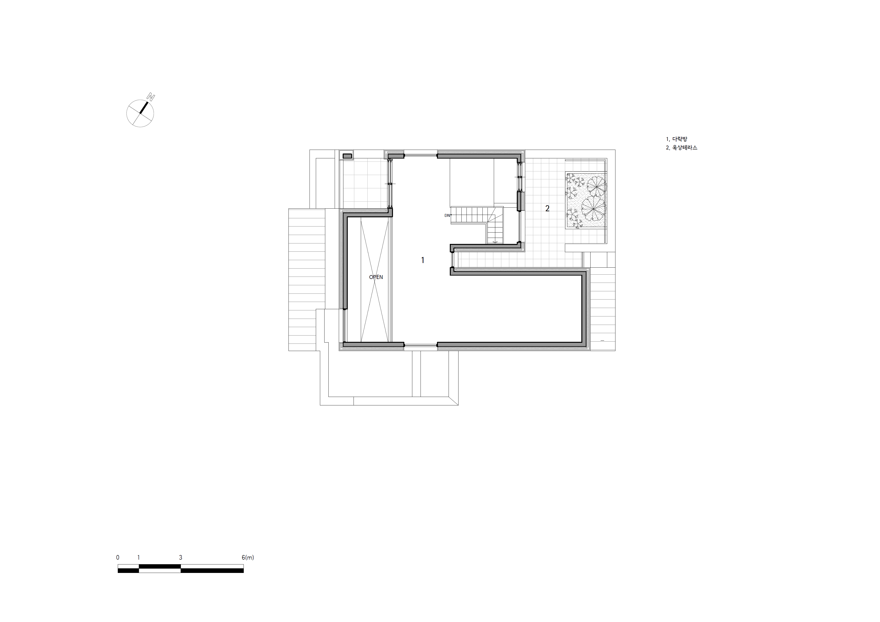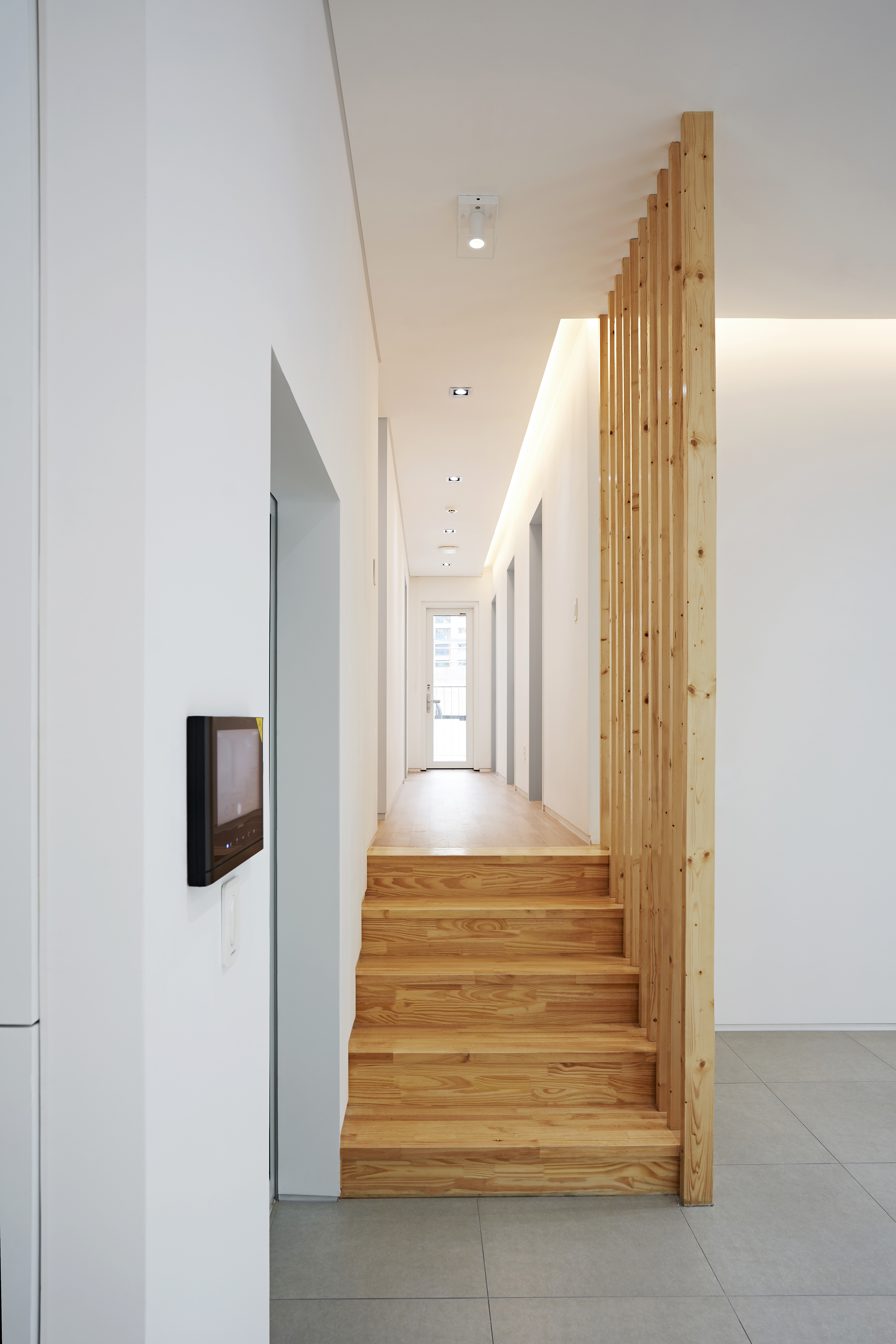 Cheongyeonjae is a commercial multi-family housing in which a total of three households can live. The site is a plot for a store residence in Godeung district, a housing site development area in Seongnam. Cheongyeonjae has competitiveness with a variety of unique compositions that deviate from the monotonous basic type of ordinary commercial housings.The total of three households were organized with one household on each floor, allowing the quality of the residences and as much leasable area as possible to be ensured. The area of the reduced parking lot was absorbed into the shopping area on the first floor, and a shopping area with a larger space compared to the same sites in the surrounding was secured. In addition, the shopping area, where the level difference of the site acted as a disadvantage, was attempted to be overcome with floor height. Since one of the two roads that adjoin the site at the corner buries about 60cm of the site, the floor height of one side was raised that much, separating the residential space on the second floor with a vertical(stairway) circulation plan, and an open public space with a high floor height was arranged on one side while a cozy and private space was provided on the other side by forming it into a bedroom. This skip-floor type plan composition allows various senses of space to be experienced that cannot be found in general commercial housings. By applying a sunken garden that was formed into an exterior space resembling an interior space to the underground space, in which an environmentally unfavorable closed spatial composition is inevitable, it is more advantageous in terms of lighting and ventilation, and it is not only used as a connecting space to the underground shopping area but also acts as a breathing space. As one goes up to the first floor from the basement through the stairs, the entire concrete wall is filled with a large window at the stair landing area, and green bamboos are planted behind the window.