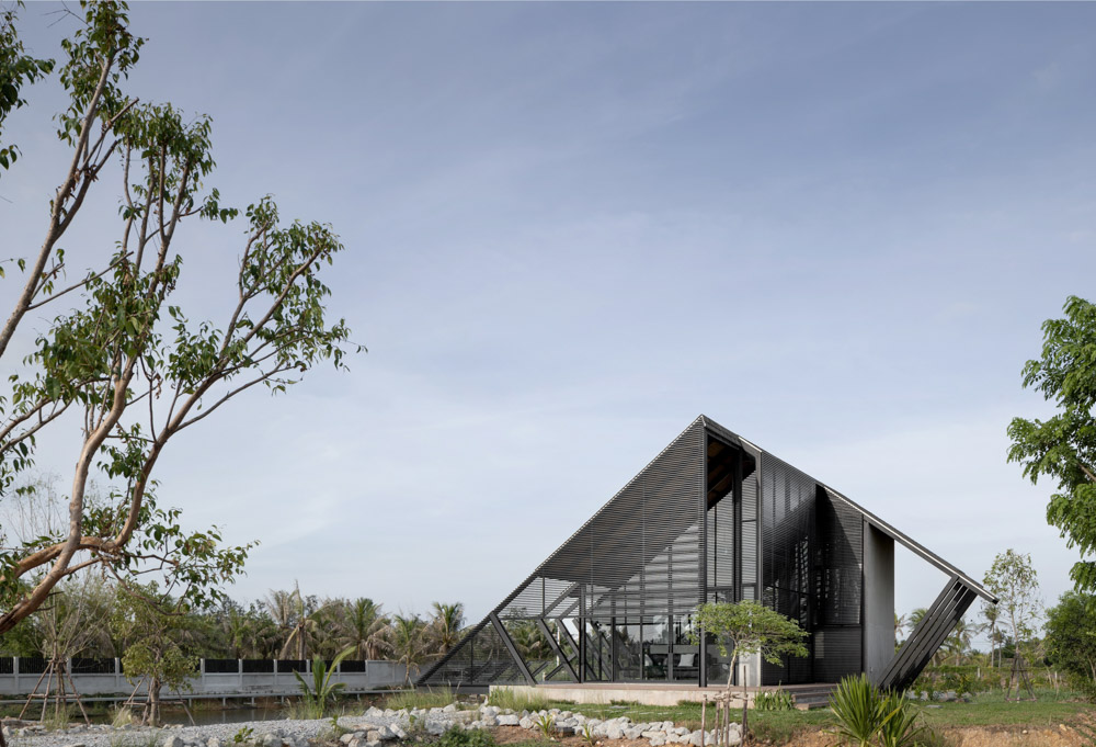An architecture is considered to live along and be part of this water treatment process, therefore, shape and approach are designed to support this development. The designed is originated by a simple cube which is diagonally slashed in half to provide the largest slanted cantilevered surface which act as a roof and wall for draining water, together with all the functions serve what a single-family residence needed within a small, affordable, and useful house, as well as sustainability. An open-plan living space which is arrangeable to multipurpose use, such as family gathering, dining, and extension sleeping area, connects to both private and semi-public area. A waterside edge, in which a bedroom and an outdoor terrace are located, is serratedly subtracted to act as a shading element as well as gaining hierarchical openness; the highest openness at the entrance terrace allows taking sight in standing position, while middle and low for living space and bedroom allows panoramic view in sitting and laying down position, respectively. The other shading elements, a durable aluminum trellis, are apply for the rest wall for heat protection.