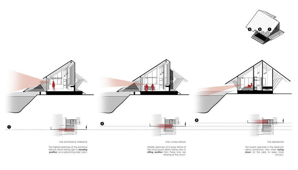 디자인은 단순한 정육면체를 대각선으로 반 자른 형태에서 시작했다. 가장 큰 경사 캔틸레버 면은 지붕과 벽이면서 물을 배수하는 역할을 한다. 이 작고 저렴하면서 유용한 주택은 지속가능한 단독주택으로서 기능한다. 가족 모임, 식사, 확장되는 침실처럼 다목적 사용이 가능한 개방형 생활 공간은 개인 공간과 공용 공간을 연결해준다. 침실과 야외 테라스가 있는 물가 쪽에는 빛을 가릴 수 있도록 차양을 두면서 단계적으로 개방했다. 입구 테라스는 짧은 차양으로 서 있을 때도 시야를 확보할 수 있고, 거실 공간과 침실은 중간 높이와 낮은 높이로 개방해 앉거나 누워 전경을 볼 수 있도록 했다. 다른 차양을 이루는 내구성 있는 알루미늄 격자는 열 보호를 위해 나머지 벽에 사용되었다.