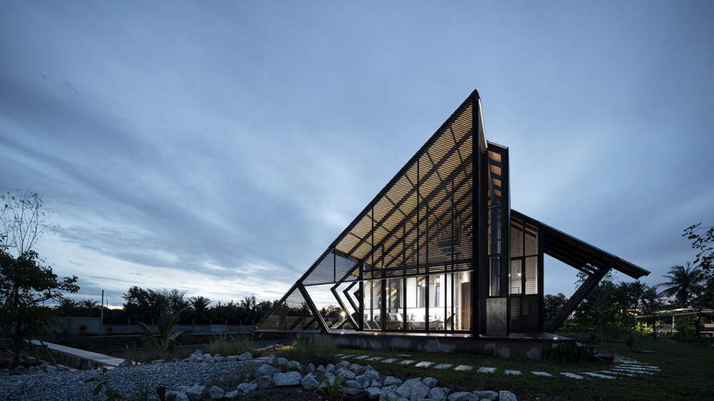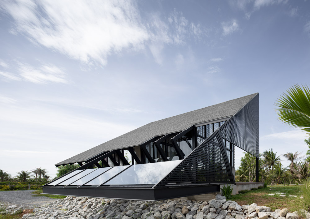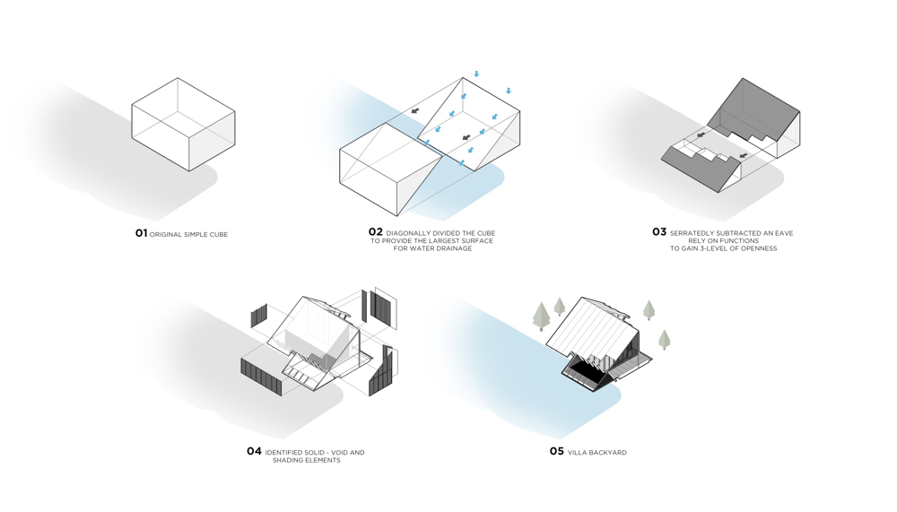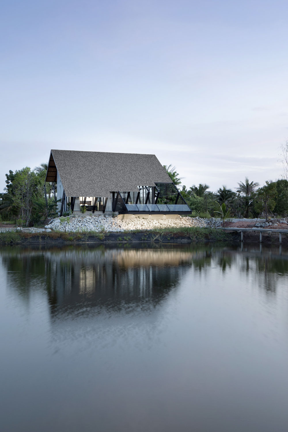 An architecture is considered to live along and be part of this water treatment process, therefore, shape and approach are designed to support this development. The designed is originated by a simple cube which is diagonally slashed in half to provide the largest slanted cantilevered surface which act as a roof and wall for draining water, together with all the functions serve what a single-family residence needed within a small, affordable, and useful house, as well as sustainability. An open-plan living space which is arrangeable to multipurpose use, such as family gathering, dining, and extension sleeping area, connects to both private and semi-public area. A waterside edge, in which a bedroom and an outdoor terrace are located, is serratedly subtracted to act as a shading element as well as gaining hierarchical openness; the highest openness at the entrance terrace allows taking sight in standing position, while middle and low for living space and bedroom allows panoramic view in sitting and laying down position, respectively. The other shading elements, a durable aluminum trellis, are apply for the rest wall for heat protection.