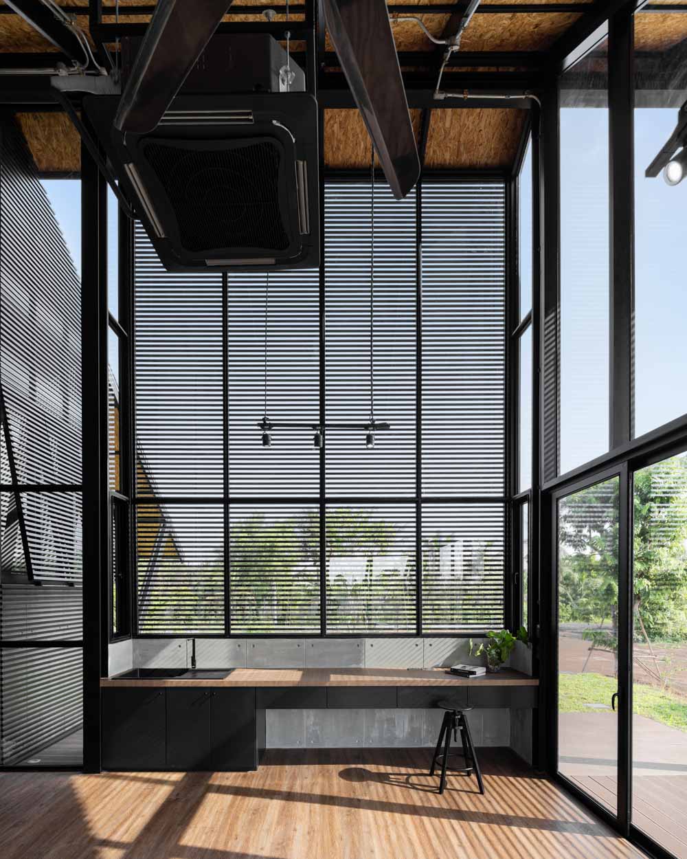 Steel structure with asphalt shingle roof is used for quick and easy installation with lightweight and durability for water drainage. Steel grating is applied for a cantilevered outdoor terrace, which allows rainwater falls directly to the pond, as well as, cooling the air above the floor from water evaporation. Aluminum trellis is not only durable, low maintenance and last-longer used material, but also can easily be re-used for another building because of a clip-lock installation.