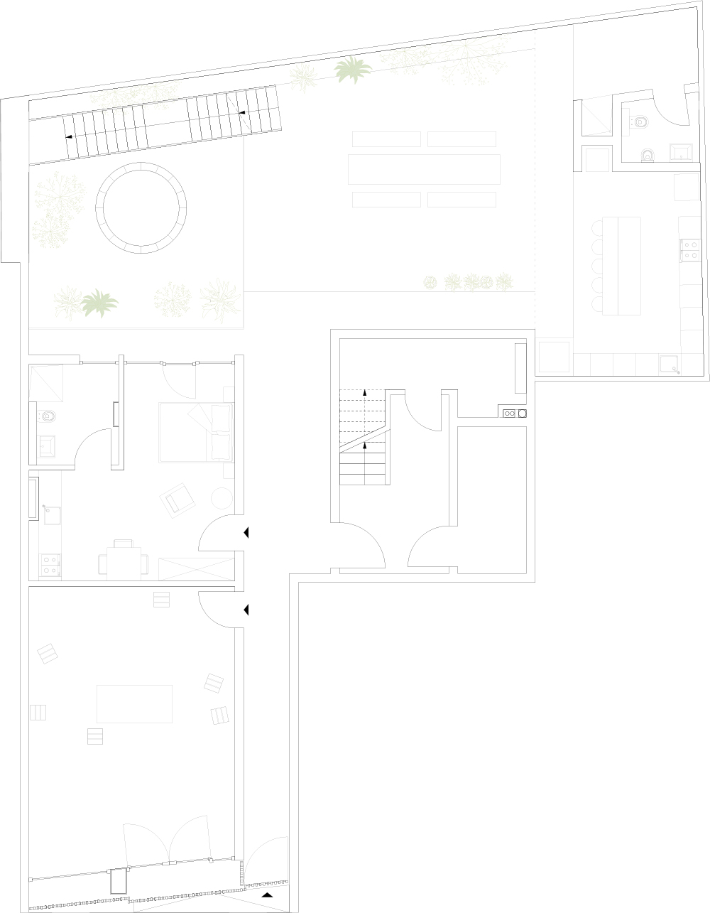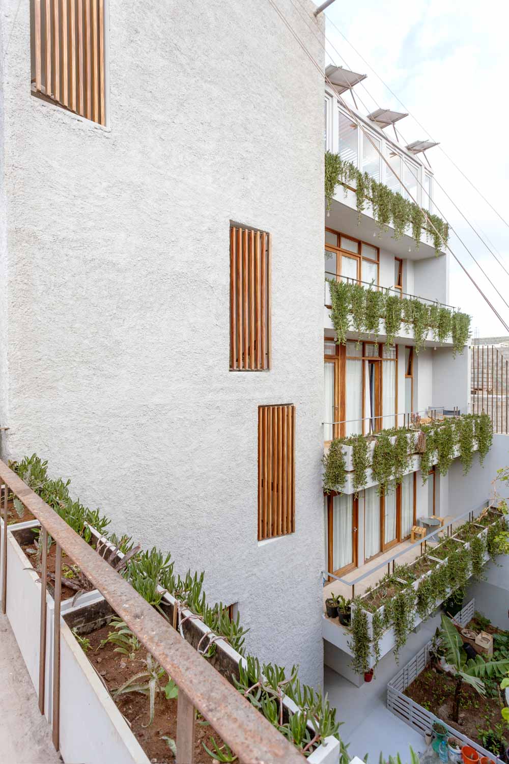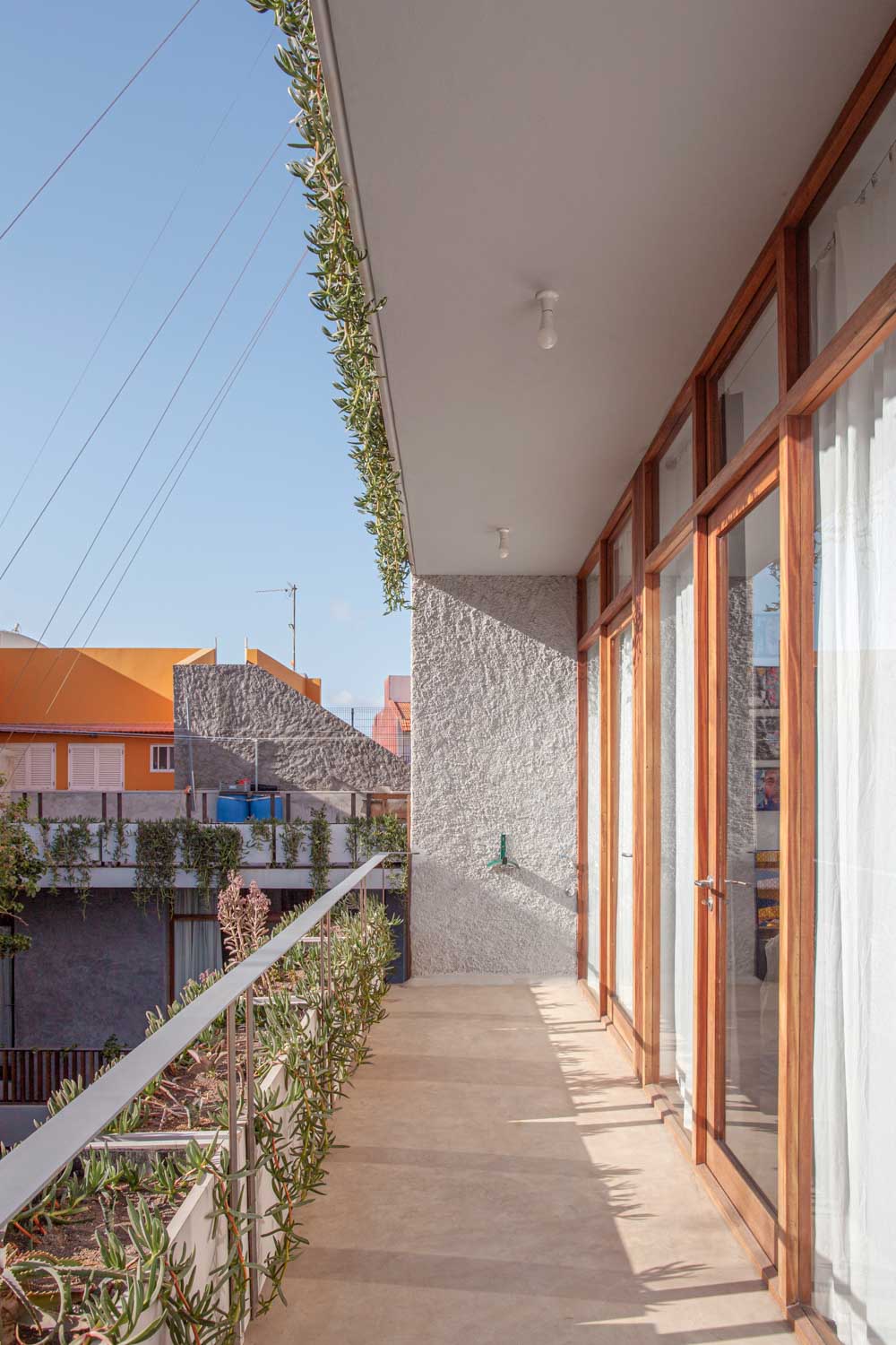 Bringing together São Vicente’s urban touch and Santo Antão’s greenery, the design furthers its dialogue with Cabo Verde’s cultural and natural traits through other structural choices. The island’s imposing sun grows into a valuable resource as it illuminates the solar panels laid across the flat roof and which power the space. The windowless vertical tower at the side of the building, which encloses the stairs connecting the five floors, is set in plaster, an inexpensive and common material on the island. As it enters from the bottom entrance, wind is channeled upwards through it and used to refresh the various floors before exiting at the seam – another recurring practice in Cabo Verdean structures. Reflecting this structural hybridity, the building’s function is widely versatile, bringing together cultural, residential and hospitality spaces. While the bottom floor houses a gallery space, open to local cultural events, the upper floors welcome a diversity of inhabitants, permanent residents and temporary travelers alike. Coming together in the interior courtyard, where a communal exterior kitchen and long benches are towered by the lush balconies, all occupants gather in this sheltered space, tucked away from the street, yet deeply connected to it. At the Casa d’Poço, public and private communicate as do nature and culture, all hailing their profound Cabo Verdean identity as cultivating a profound sense of community.