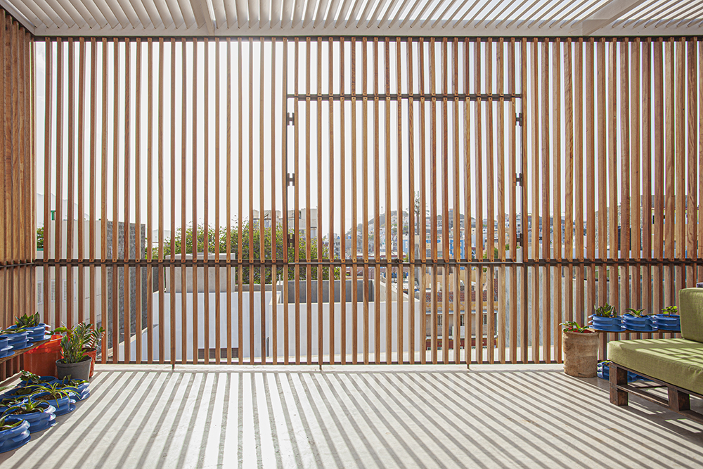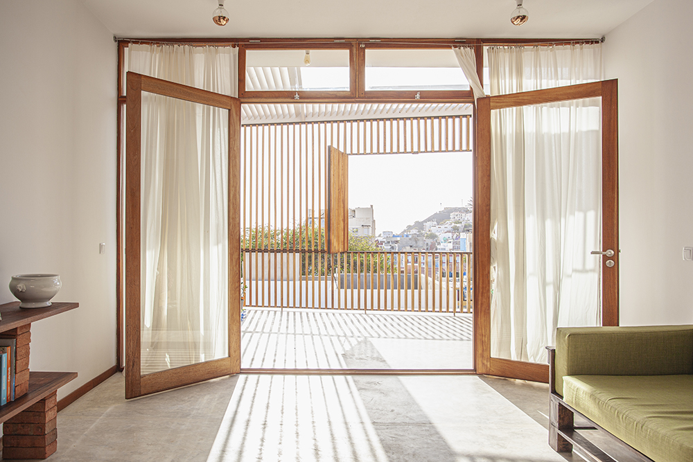 At the Casa d’Poço, the façade of the five-storey building acts as a reflection onto the archipelago’s São Vicente and Santo Antão islands and their distinct cultural and environmental markers. A response to São Vicente’s notable stone-dominated architecture, the street-facing side is clad with three-dimensional wooden shades as a warmer, more welcoming alternative, one in touch with the island’s reputation as the beating heart of the annual Carnival. The hybrid panels, made of Mahogany wood, provide shaded protection from the sun and heat. Alternatively open and shut, a musicality emanates from the vertical shutters as they become the shifting background and scenery of the Carnival, echoing the constantly changing and vivacious costumes of the performers that inhabit the streets.