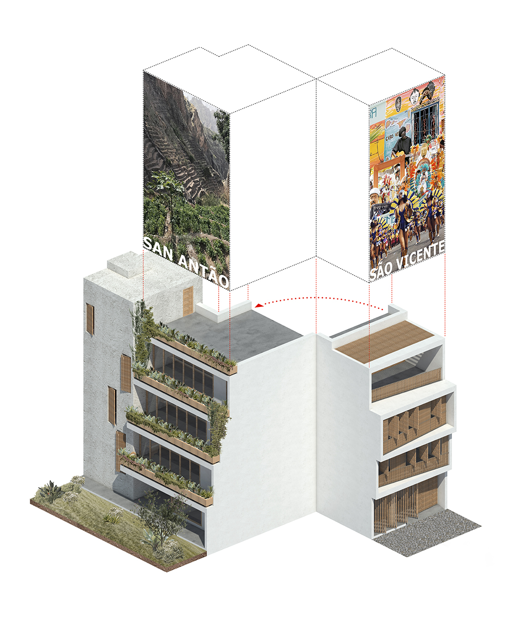 열리고 닫힘이 일어나면서 카니발의 변화하는 모습과 풍경이 나타나며 수직 루버 사이로 음악이 흘러 나오고 거리 공연자들의 생생한 의상과 다채로운 풍경의 변화가번져 나간다. 계단식 테라스로 고정된 후면 파사드는 안뜰 아래로 열려 있으며 이웃한 산투안탕 섬과 질주하는 듯한 산의 경작지 풍경이 보인다. 상비센트와는 반대되는 습한 기후와 풍부한 자연을 갖춘 이 섬의 언덕은 고원이 겹쳐지고 구두점이 만들어지며 폭우가 올 때 물을 모으는 역할을 하는 분지가 있다. 이러한 시스템에 영감을 받아 내부 테라스에는 밀과 옥수수 화분들을 줄지어 설치했다. 홍수가 날듯한 비가 이 발코니와 정원에 자리 잡은 안뜰에 쏟아지면 저수조에 물을 모으고 건기에 식물을 키우는 데 사용된다. 상비센트의 도시적 감각과 산투안탕의 녹지를 결합한 이 디자인은 다른 구조적 선택을 통해 카보베르데의 문화 및 자연적 특성이 어우러지게 한다. 섬으로 내리쬐는 태양은 평평한 지붕에 놓인 태양 전지판을 비추고 이것은 건물에 전력을 공급할 때 귀중한 자원이 된다. 5개 층을 연결하는 계단을 둘러싸고 있는 건물 측면의 창문 없는 수직 타워는 저렴하고 섬에서 흔하게 사용되는 석고를 사용했다. 아래 입구에서 바람이 들어와 다른 층이 마주하기 전, 위쪽까지 신선한 공기를 채워준다. 이는 카보베르데의 건물 구조에서 자주 사용된다.