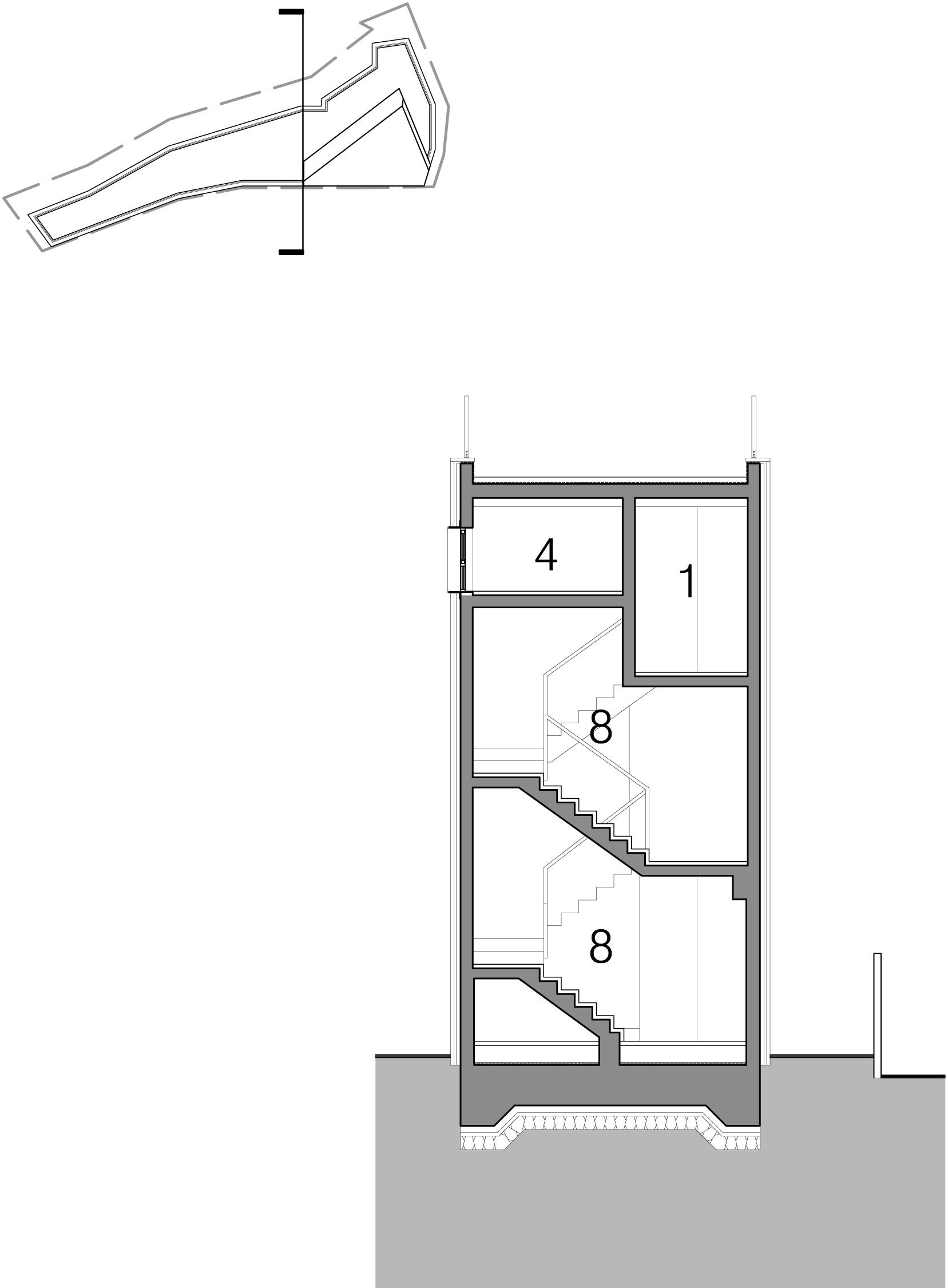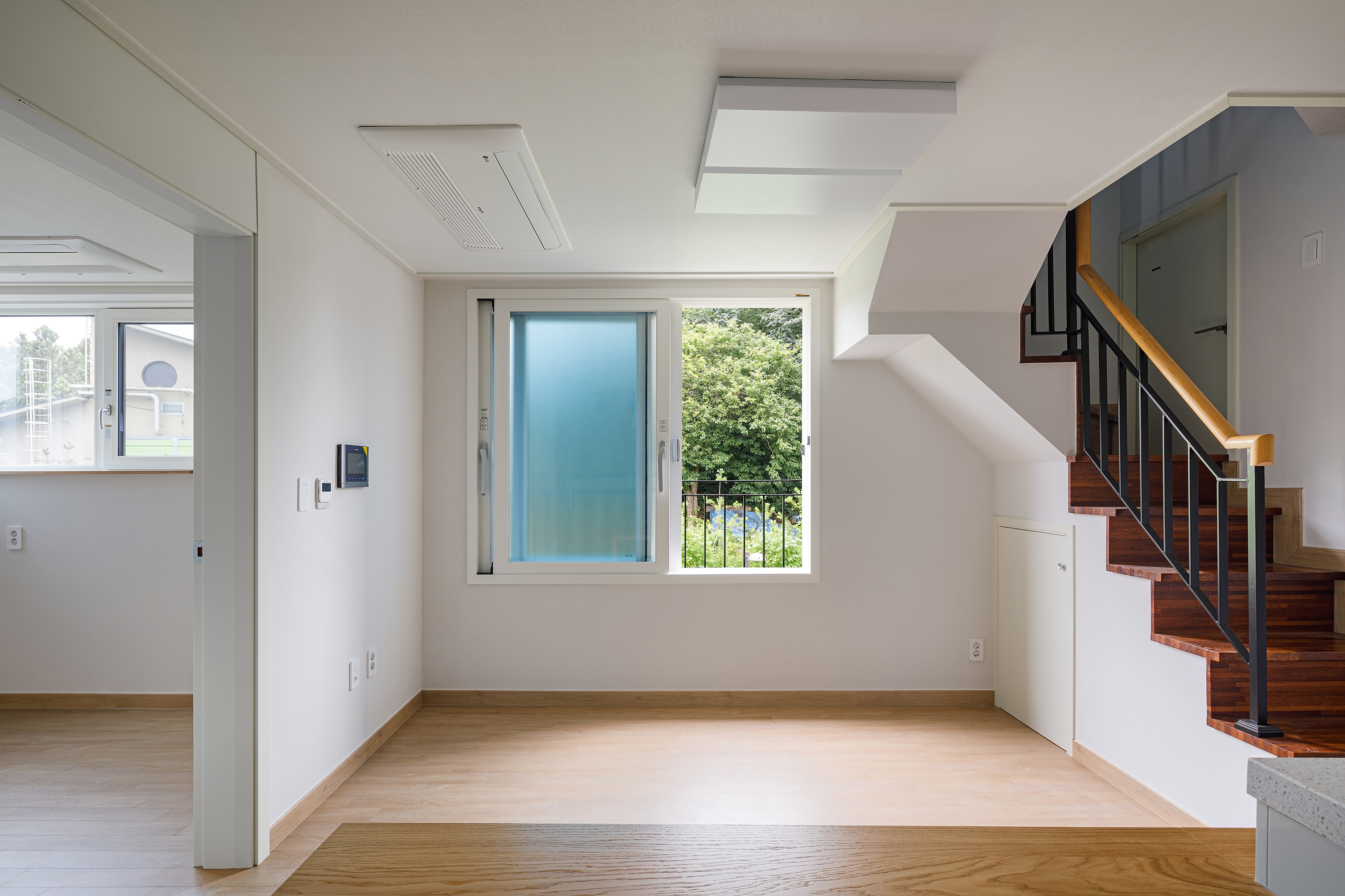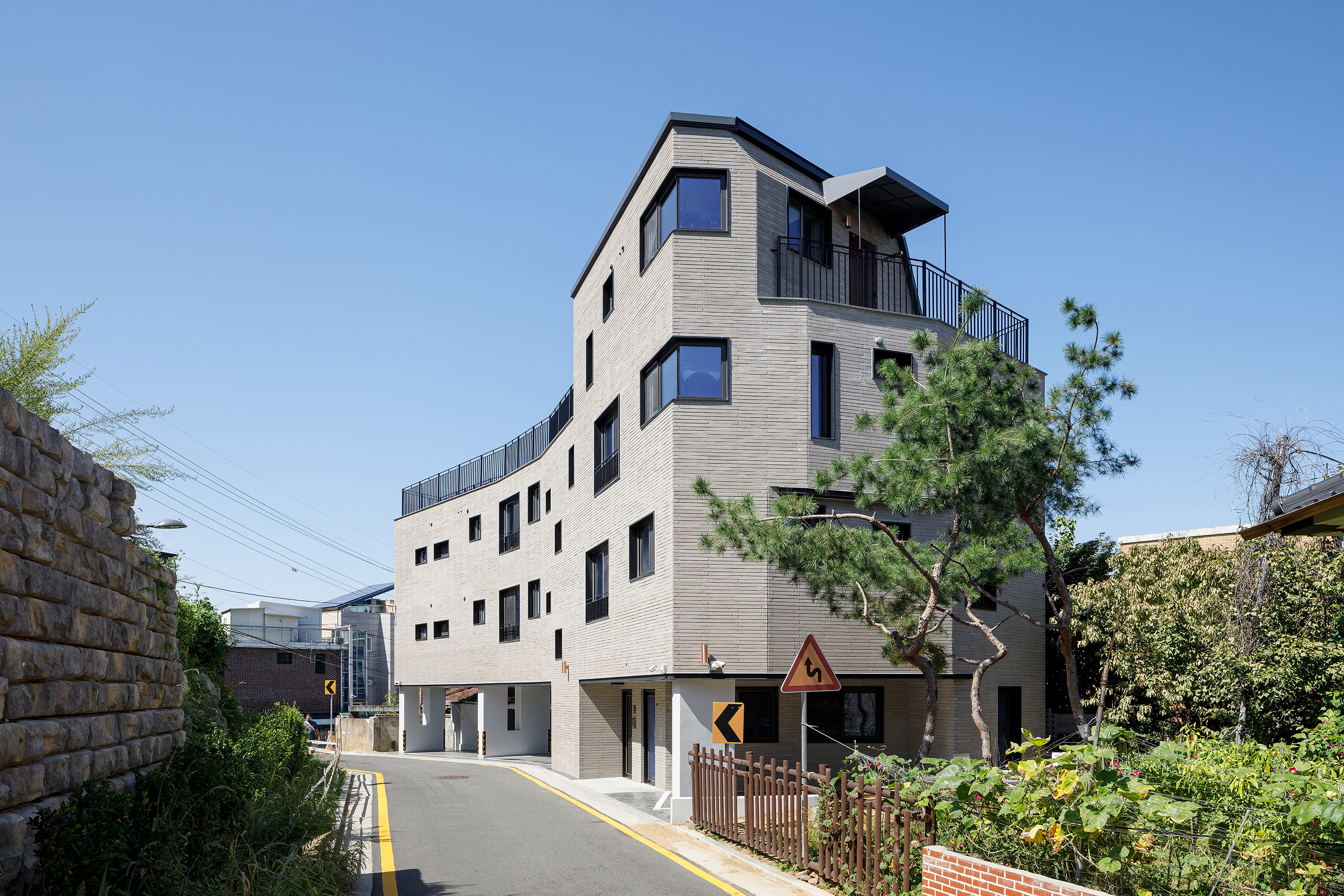A house is a haven where one wants to return to and rest, wherever they are, and it is a space that contains the lives and personal history of the family who live there. The site of TaeShin’s House, which was a landlocked land, was reborn with the patience and efforts of the client. Starting with a civil petition demanding road construction five years ago, a 6m city planning road was approved in three years, and the process of road construction, removal, architectural design and construction took place for more than two years. As the existing site was partially removed due to the road, it turned into a site with a crooked, narrow and long shape, and had a confined form that seemed as if new construction would be impossible at a glance. During the construction period, the neighbors called it the ‘worm house’ and were curious yet in doubt, saying ‘This can’t become a house, can it?’ TaeShin’s House has a long-shaped spatial plan, and the building is about 2m wide in areas where the site is narrow. Furthermore, it is a house that contains maximum efficiency and space within a building shape made along the form of the site. In this interesting and fun space built along the small land, the households on the left side of the stair hall are separated into layers and have a parallel structured space through the corridor. The right side of the stair hall were distributed into living-room-centric types of existing detached houses. The building directly faces the Children’s Grand Park and attracts the scenery of Achasan mountain in the distance. Since it is located on the highest ground in the surroundings, it was reborn as a unique and pleasant house that lives with nature as it attracts the changes of the four seasons through the windows or terraces, and it provides awareness as a landmark of the neighborhood as it was designed in a long form along the shape of the newly formed road.