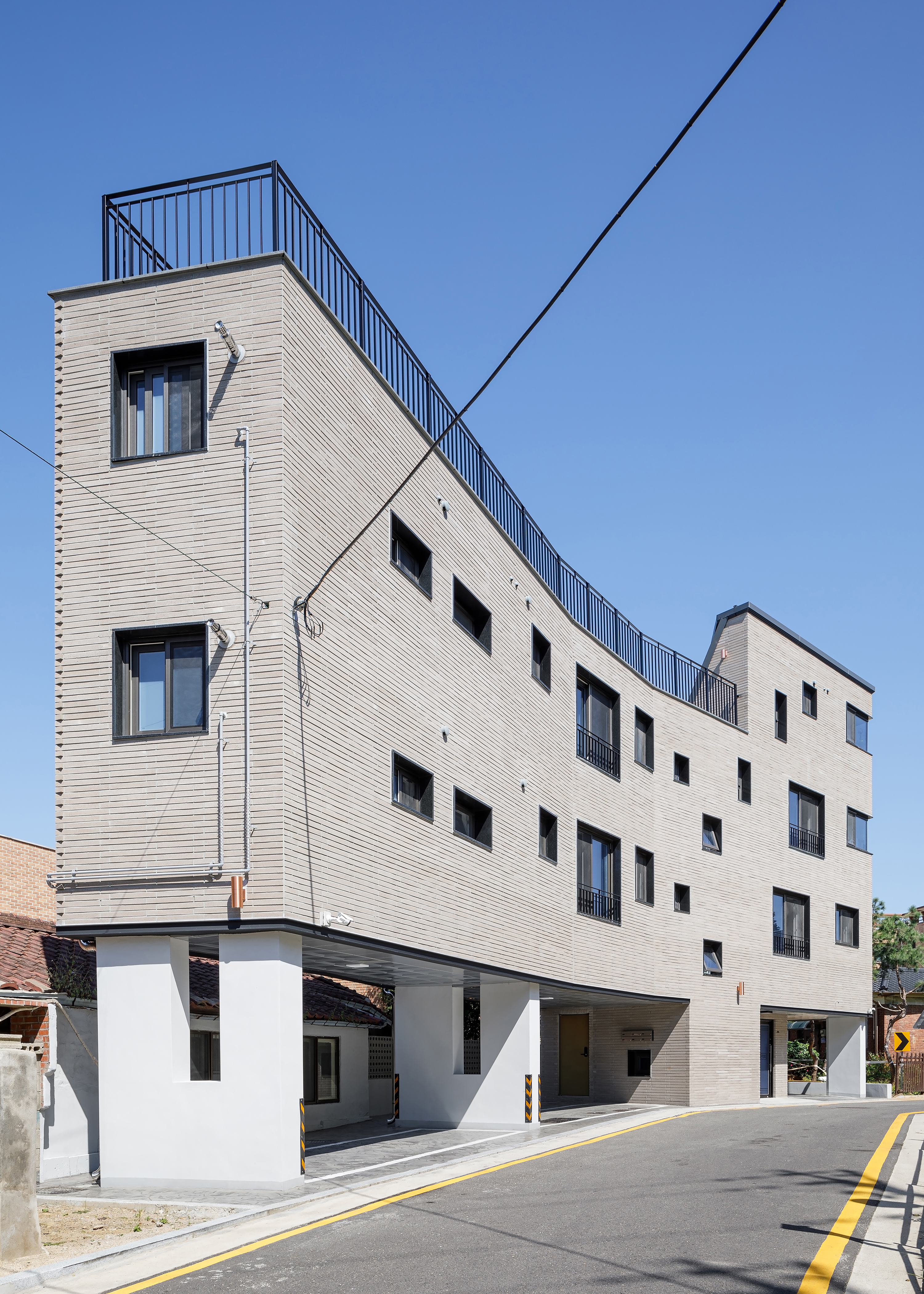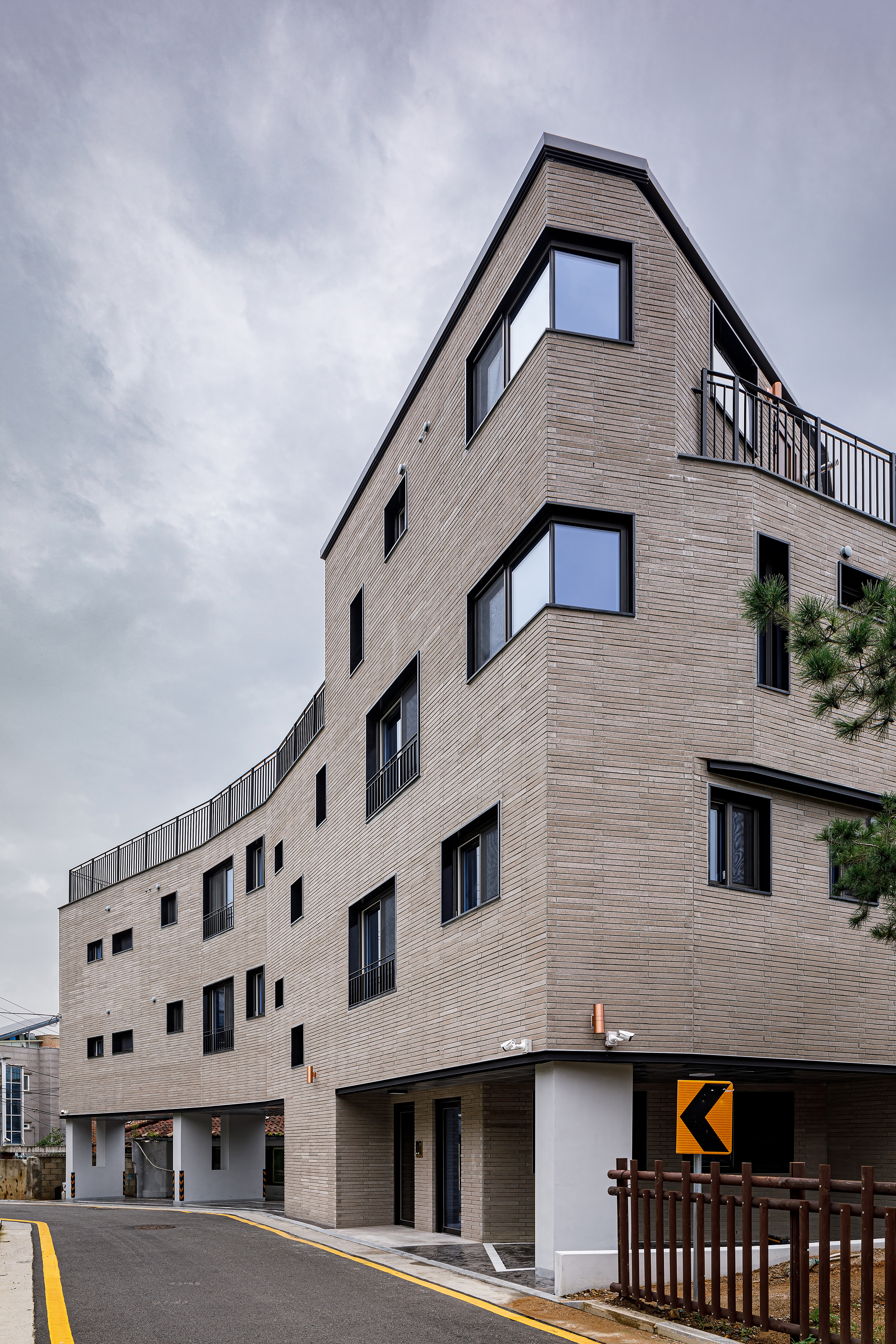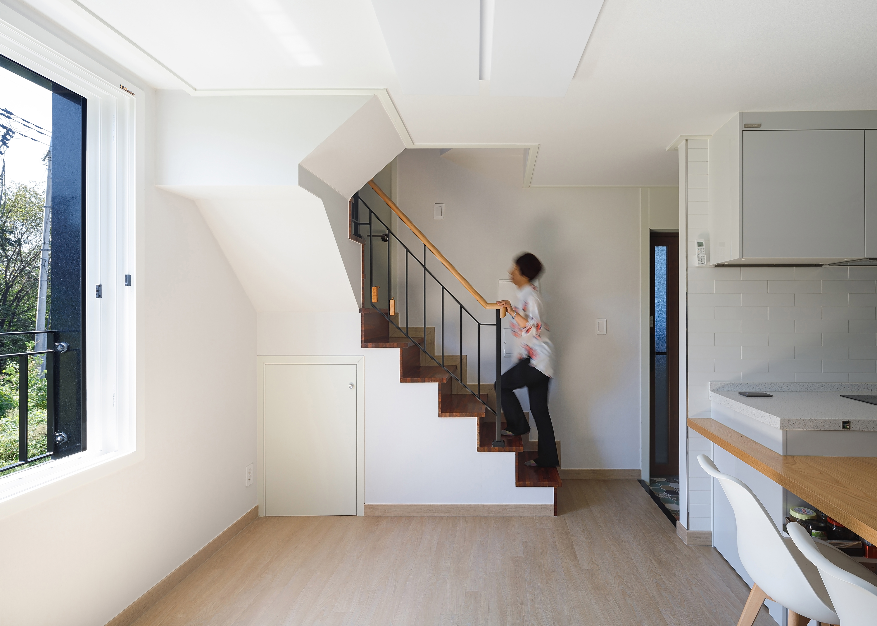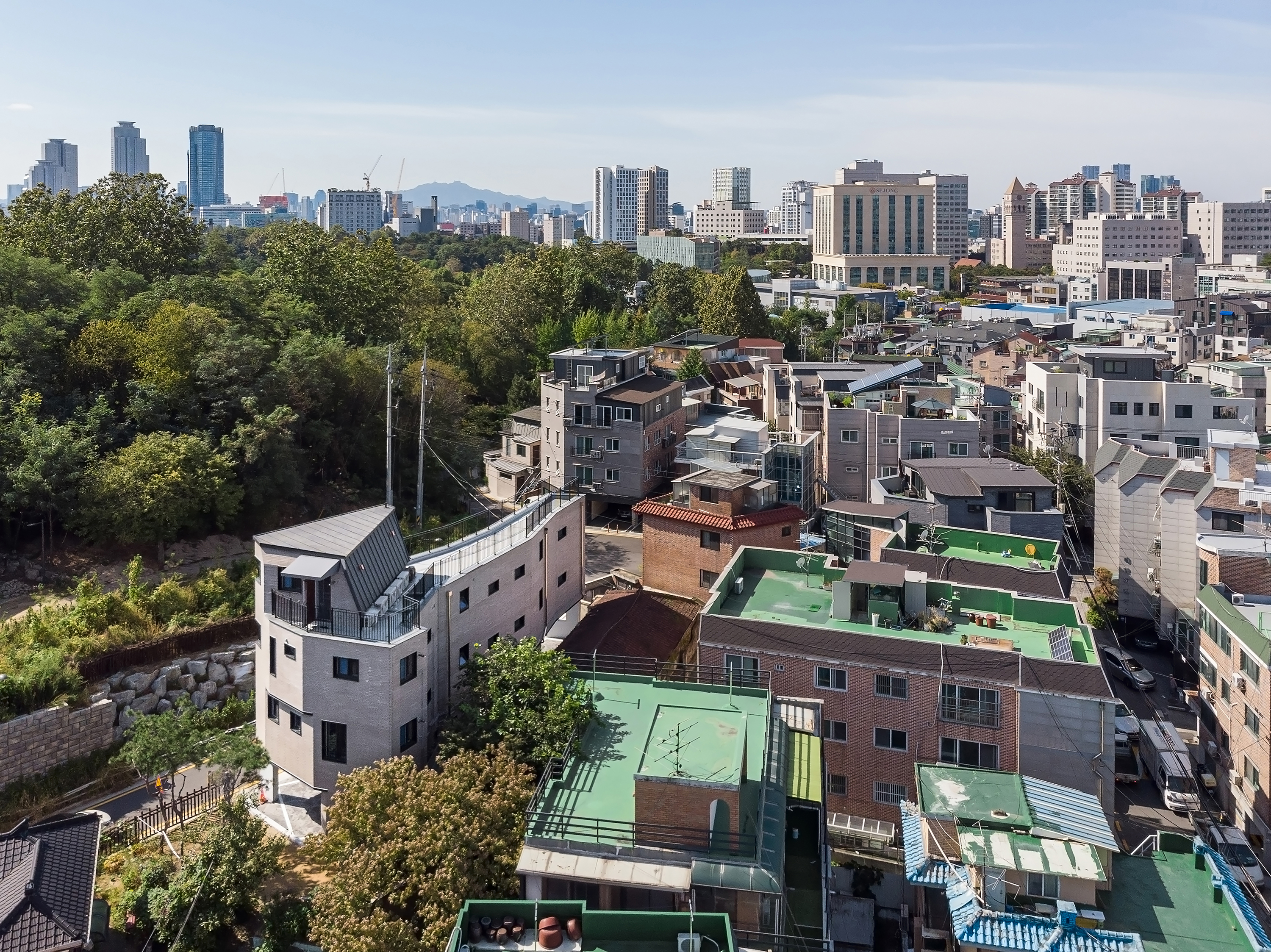 A house is a haven where one wants to return to and rest, wherever they are, and it is a space that contains the lives and personal history of the family who live there. The site of TaeShin’s House, which was a landlocked land, was reborn with the patience and efforts of the client. Starting with a civil petition demanding road construction five years ago, a 6m city planning road was approved in three years, and the process of road construction, removal, architectural design and construction took place for more than two years. As the existing site was partially removed due to the road, it turned into a site with a crooked, narrow and long shape, and had a confined form that seemed as if new construction would be impossible at a glance. During the construction period, the neighbors called it the ‘worm house’ and were curious yet in doubt, saying ‘This can’t become a house, can it?’ TaeShin’s House has a long-shaped spatial plan, and the building is about 2m wide in areas where the site is narrow. Furthermore, it is a house that contains maximum efficiency and space within a building shape made along the form of the site. In this interesting and fun space built along the small land, the households on the left side of the stair hall are separated into layers and have a parallel structured space through the corridor. The right side of the stair hall were distributed into living-room-centric types of existing detached houses. The building directly faces the Children’s Grand Park and attracts the scenery of Achasan mountain in the distance. Since it is located on the highest ground in the surroundings, it was reborn as a unique and pleasant house that lives with nature as it attracts the changes of the four seasons through the windows or terraces, and it provides awareness as a landmark of the neighborhood as it was designed in a long form along the shape of the newly formed road.
