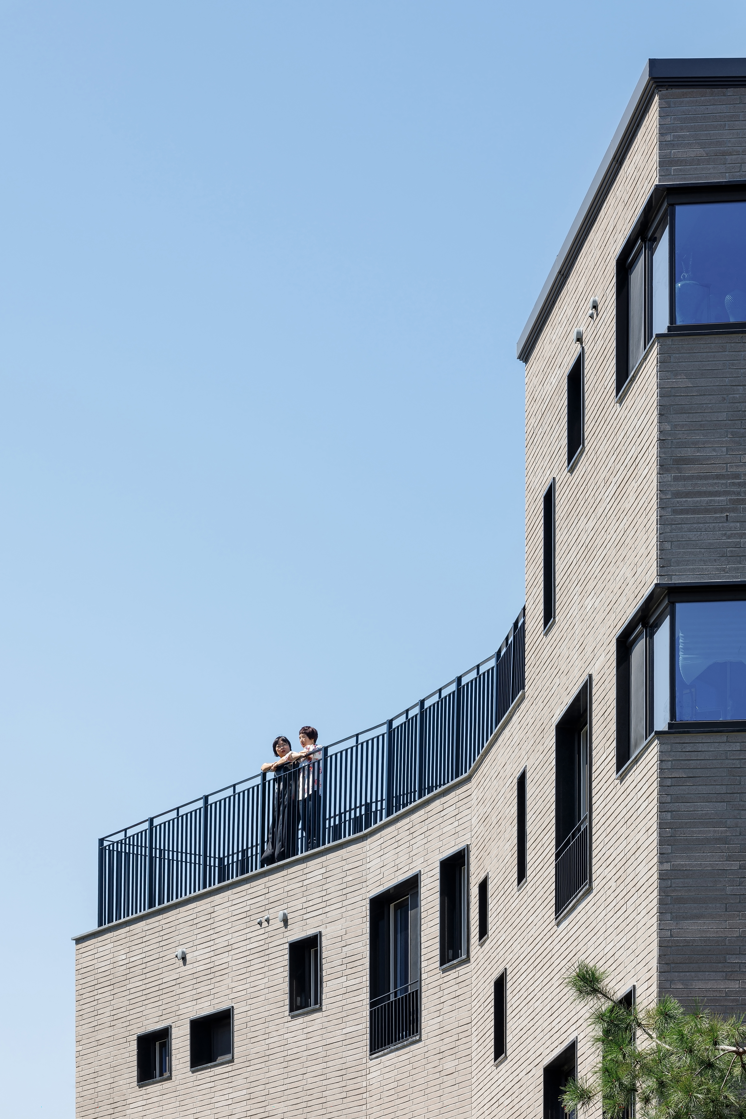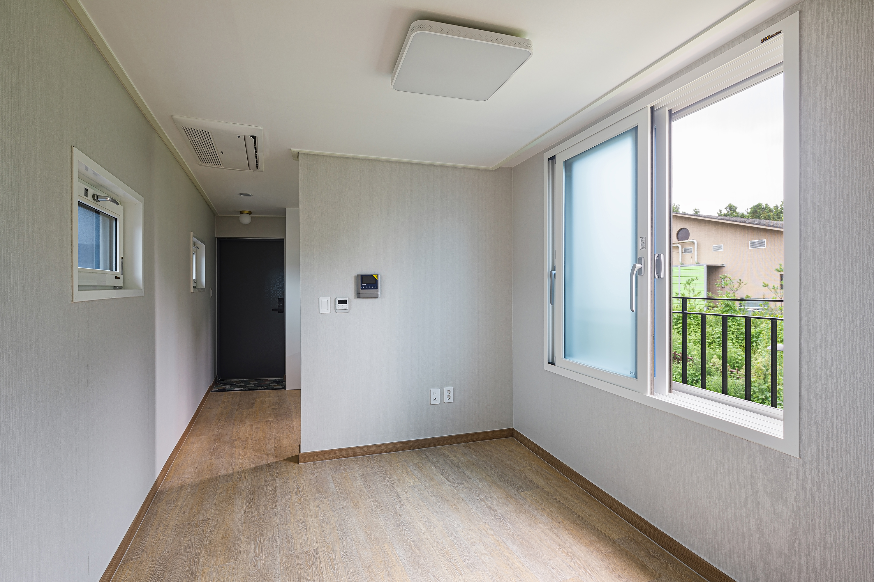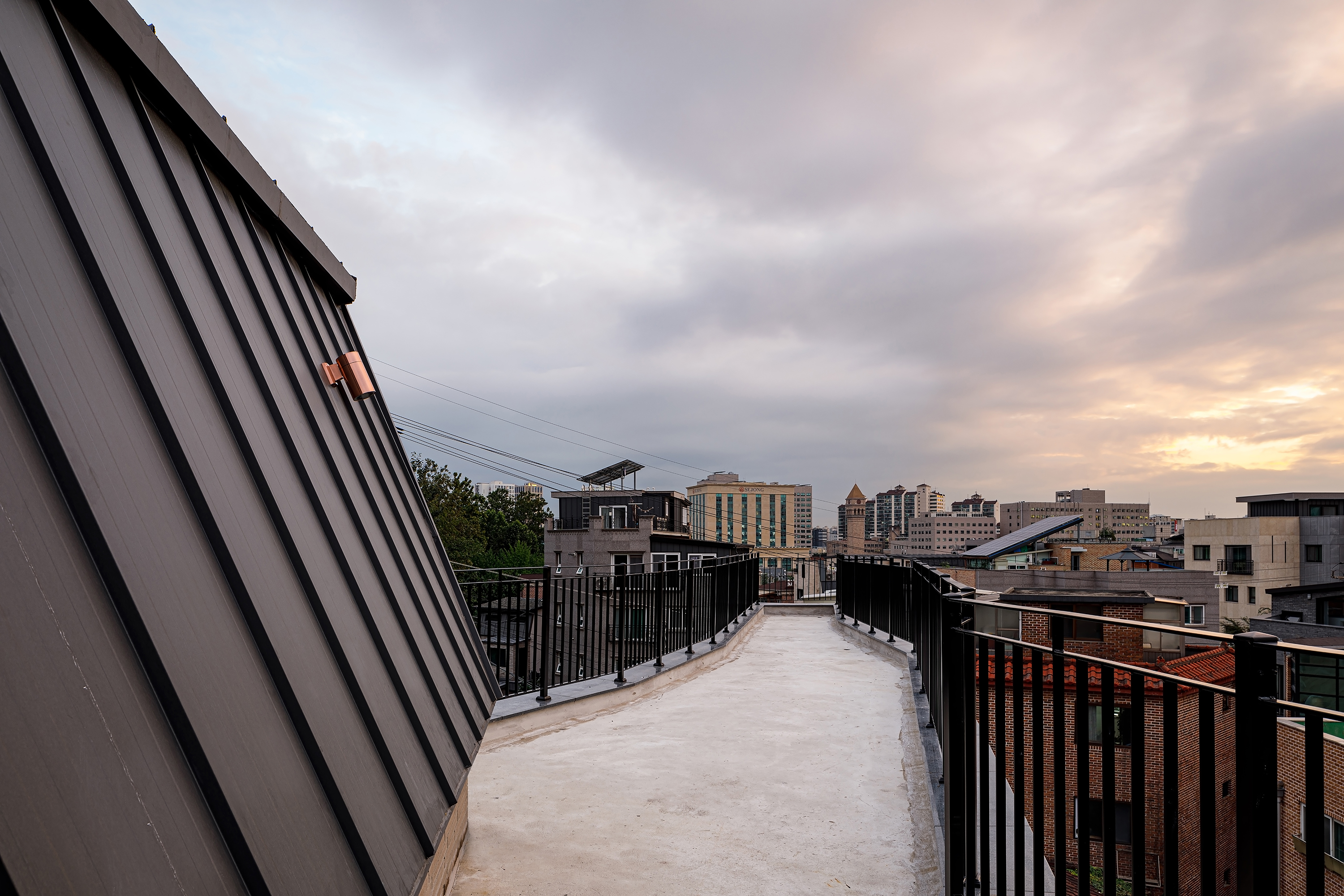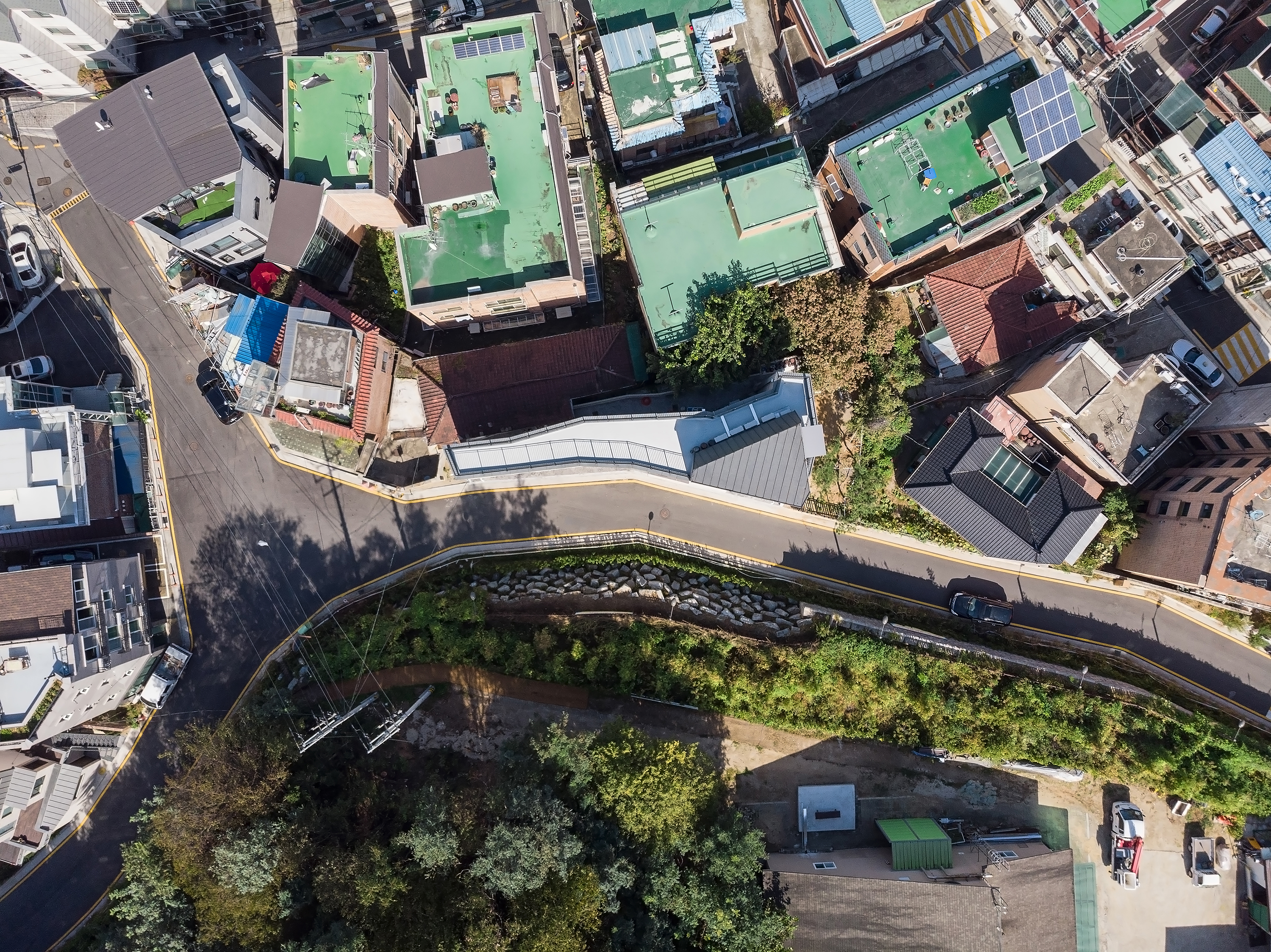 A house is a haven where one wants to return to and rest, wherever they are, and it is a space that contains the lives and personal history of the family who live there. The site of TaeShin’s House, which was a landlocked land, was reborn with the patience and efforts of the client. Starting with a civil petition demanding road construction five years ago, a 6m city planning road was approved in three years, and the process of road construction, removal, architectural design and construction took place for more than two years. As the existing site was partially removed due to the road, it turned into a site with a crooked, narrow and long shape, and had a confined form that seemed as if new construction would be impossible at a glance. During the construction period, the neighbors called it the ‘worm house’ and were curious yet in doubt, saying ‘This can’t become a house, can it?’ TaeShin’s House has a long-shaped spatial plan, and the building is about 2m wide in areas where the site is narrow. Furthermore, it is a house that contains maximum efficiency and space within a building shape made along the form of the site. In this interesting and fun space built along the small land, the households on the left side of the stair hall are separated into layers and have a parallel structured space through the corridor. The right side of the stair hall were distributed into living-room-centric types of existing detached houses. The building directly faces the Children’s Grand Park and attracts the scenery of Achasan mountain in the distance. Since it is located on the highest ground in the surroundings, it was reborn as a unique and pleasant house that lives with nature as it attracts the changes of the four seasons through the windows or terraces, and it provides awareness as a landmark of the neighborhood as it was designed in a long form along the shape of the newly formed road.