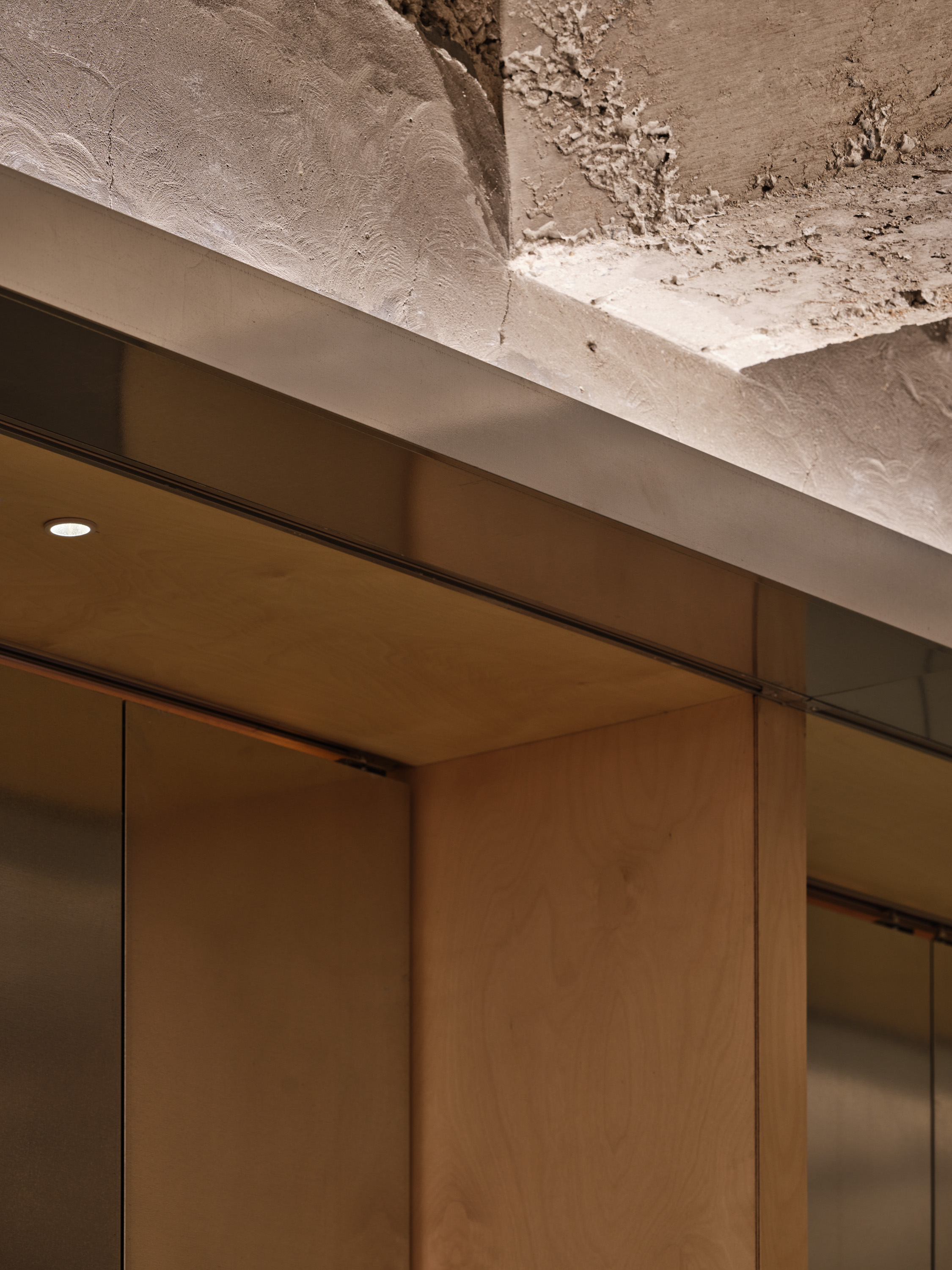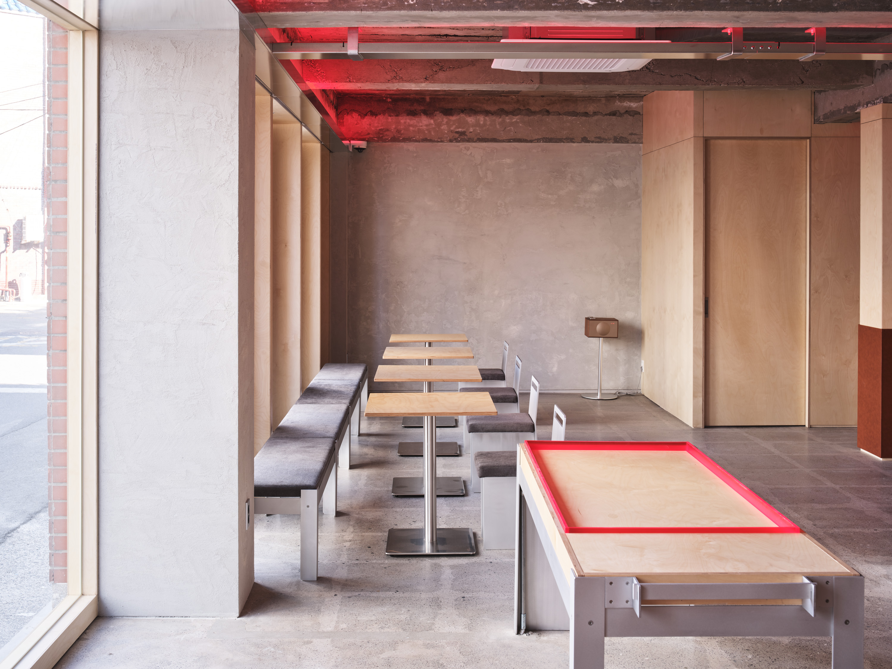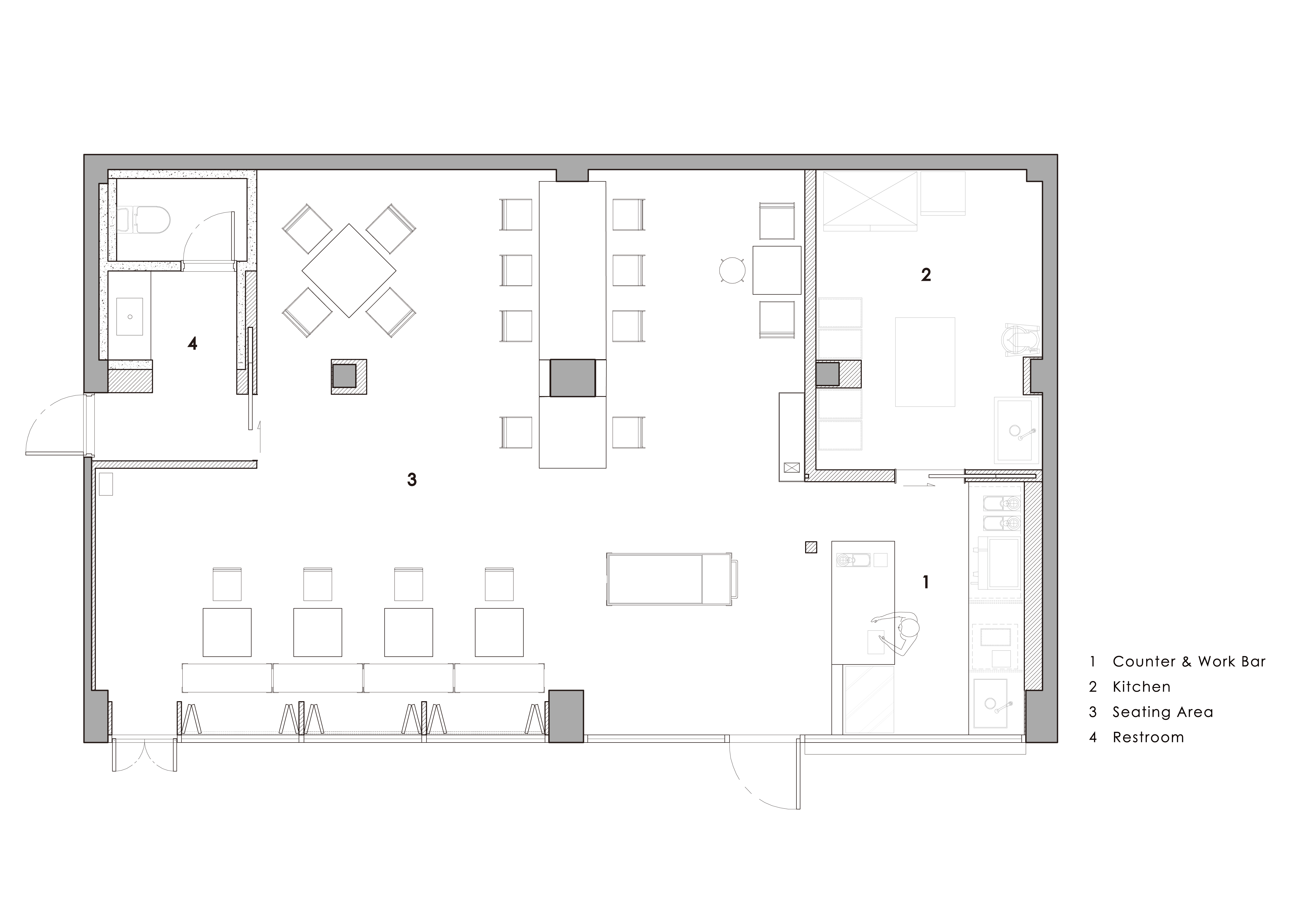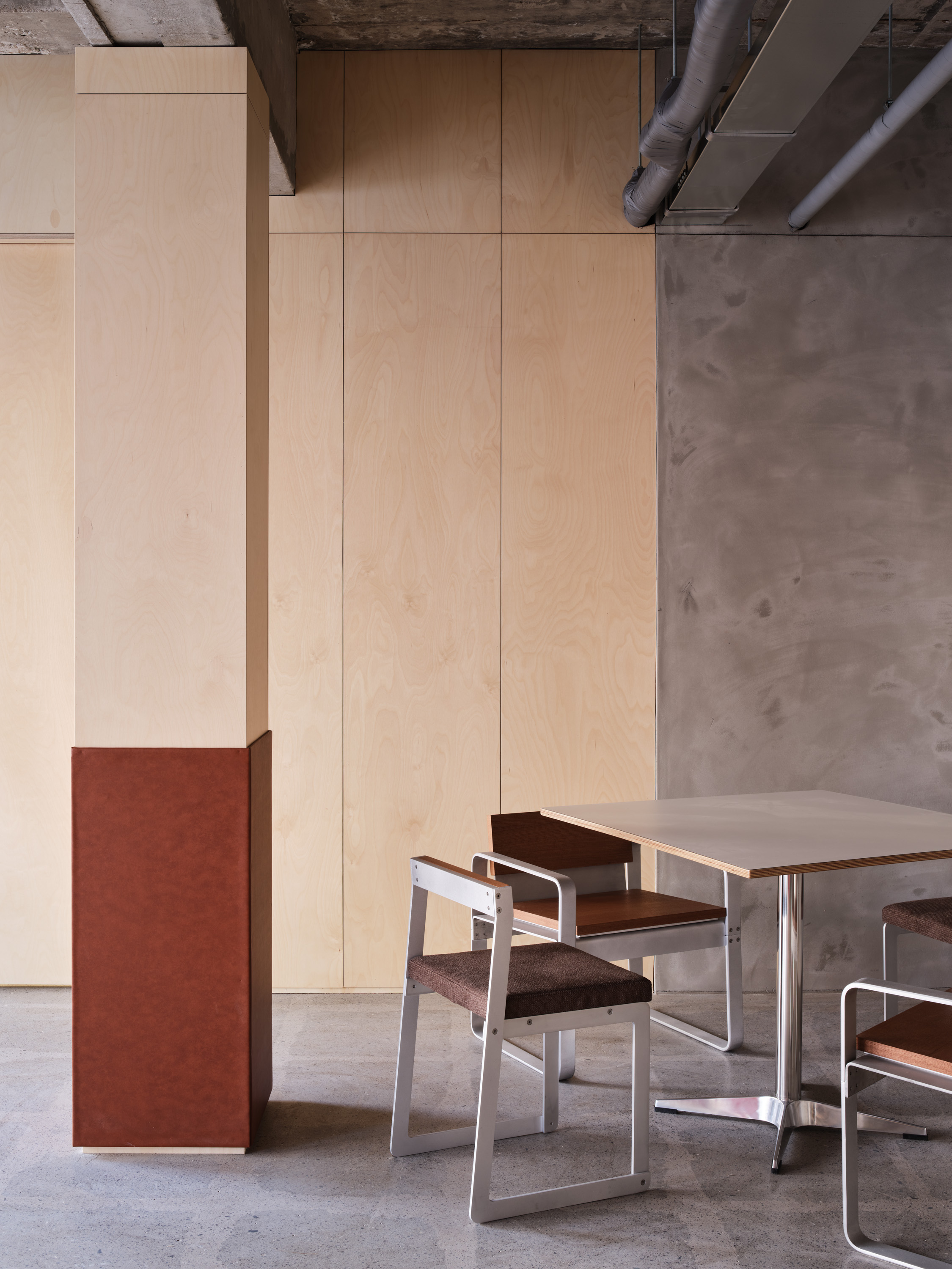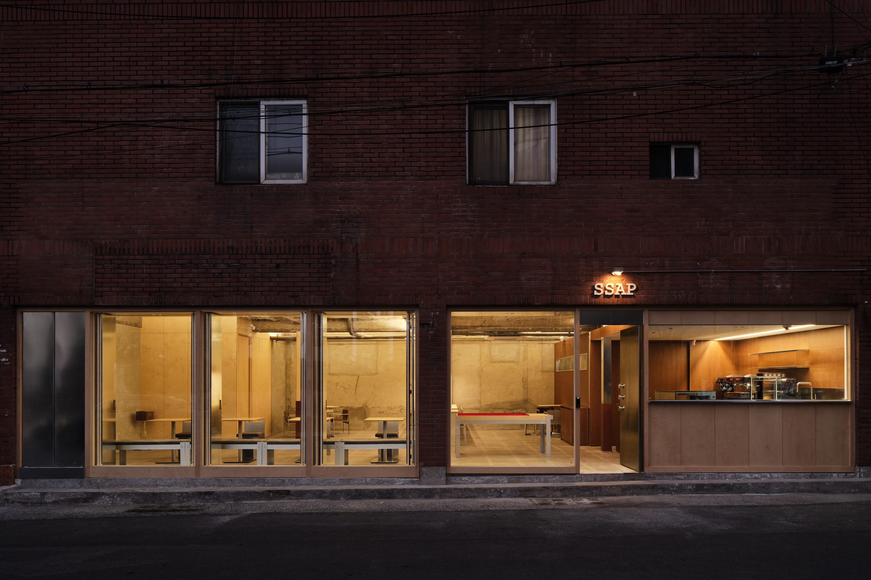 내부는 여유로운 배치, 인위적인 장식을 최대한 배제하며 간결한 형태와 물성이 가지는 자연스러운 변화가 느껴지는 공간을 표현하려 했다. 따뜻한 우드와 금속이 가지는 정교한 라인에서 느껴지는 시각적인 편안함과 함께 시크함을 동시에 주어 양면적이면서 조화로운 공간 분위기를 연출했고, 레드컬러 포인트의 아크릴조명과 수납장, 의자와 벤치 및 베이커리 쇼케이스, 하물며 사소한 전기회로가 지나가는 레이스웨이(전기설비라인)까지 공간과 유기적인 관계형성이 되게 제작하여 힙한 감성과 로컬의 주민들을 위한 과거 오래전부터 장소가 가지고 있는 익숙함과 편안함이 공존하도록 했다. 외부는 오래된 상가주택의 적벽돌과 어우러지면서 가로로 긴 직사각형의 공간이 가지는 파사드의 확장감이 느껴지도록 정갈한 형태와 시간이 지날수록 깊이감이 더해지는 우드와 금속소재로 시각적인 분리가 되어 보이게 마감했다.