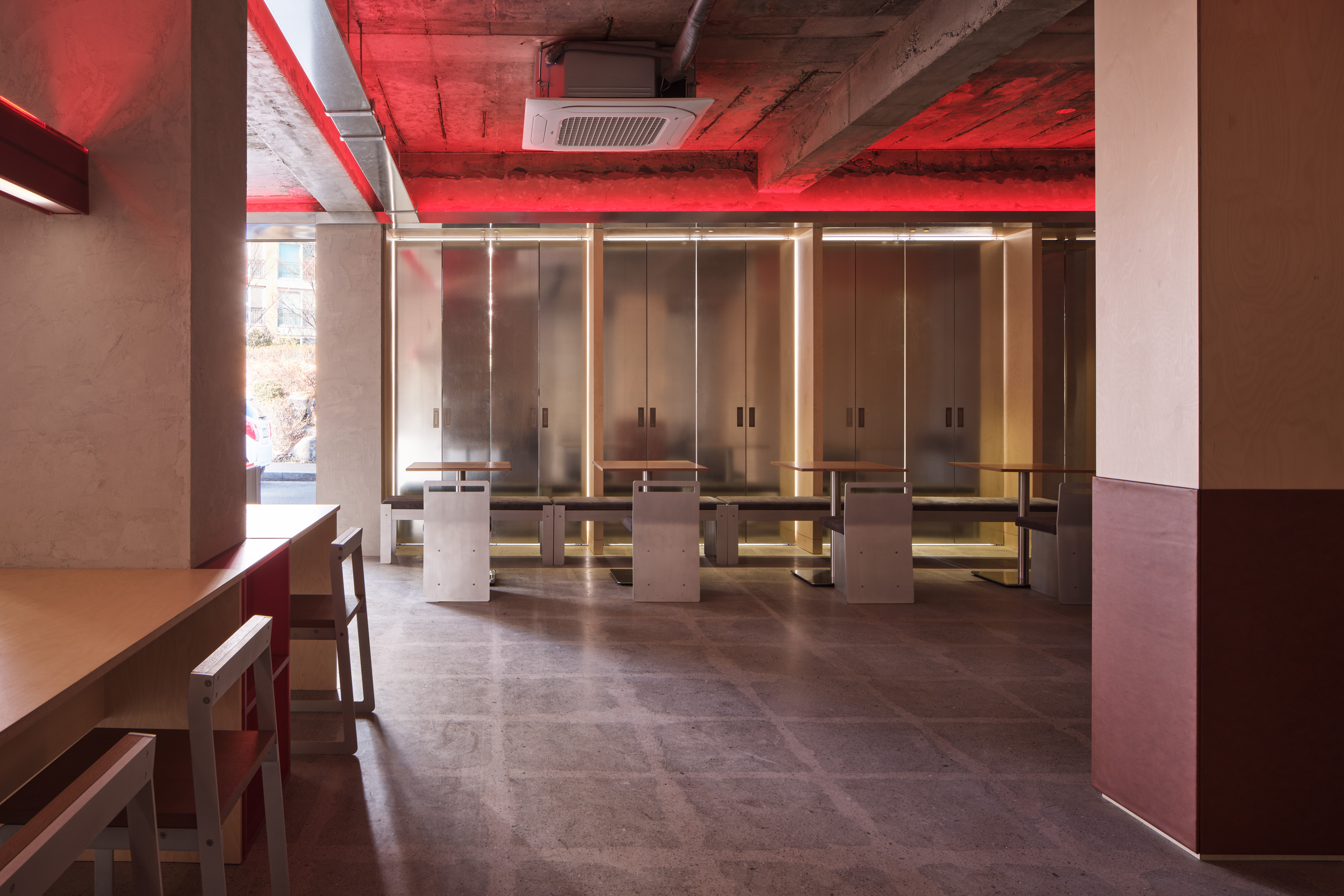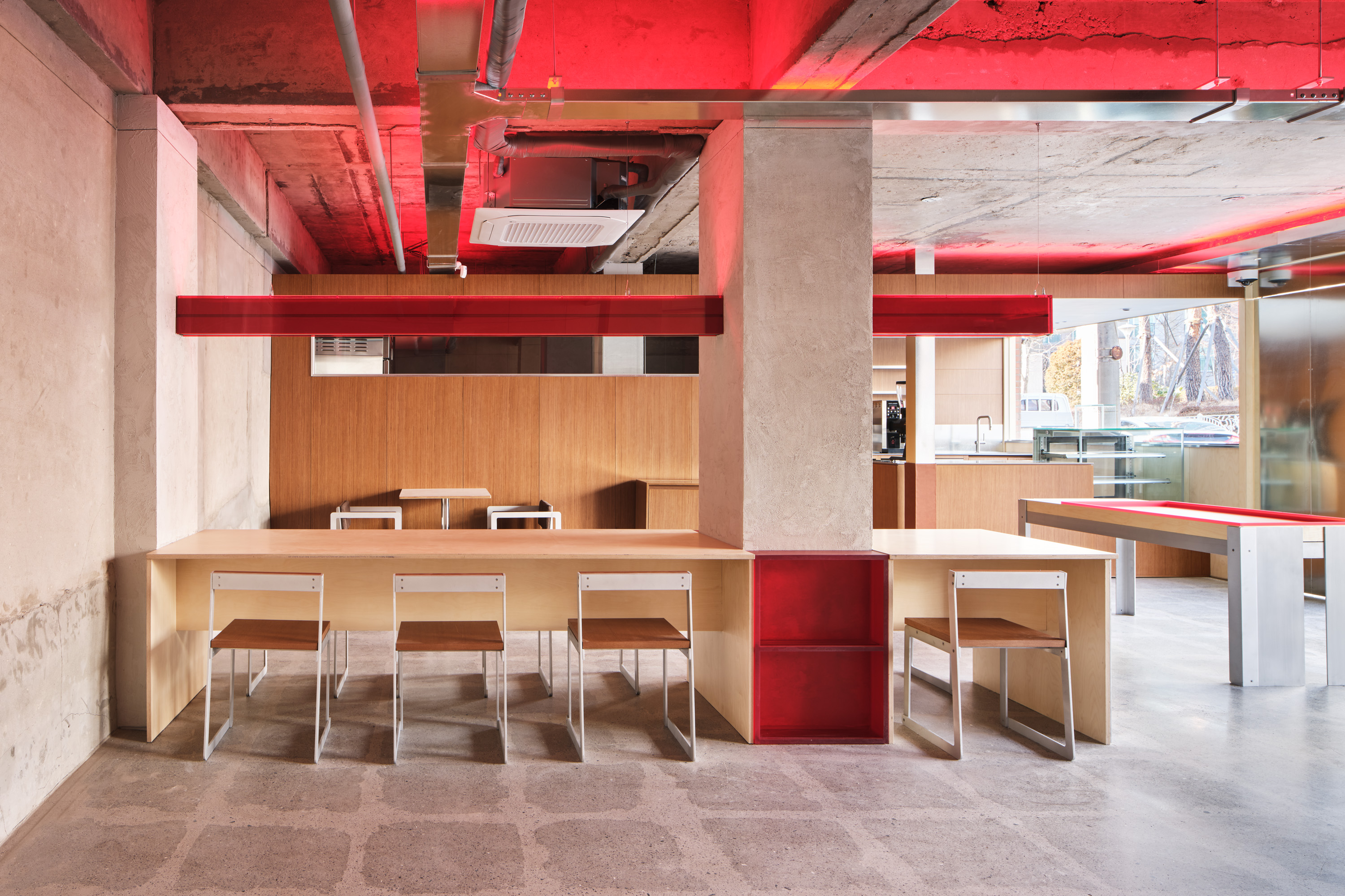 The interior tried to express a space where we could feel the natural change of simple form and physical properties, excluding relaxed arrangements and artificial decorations as much as possible. The visual comfort and chicness of warm wood and metal lines create a two-sided and harmonious space atmosphere. Red-colored point acrylic lighting & storage, chairs, benches, and bakery showcases, as well as raceways (electricity lines) through which small electric circuits pass, creating a hip sensibility and familiarity. The exterior is made to look visually separated with wood and metal materials that add depth over time so that you can feel the expansion of the fa드의ade of the horizontal rectangular space as it blends with the red bricks of the old commercial house.