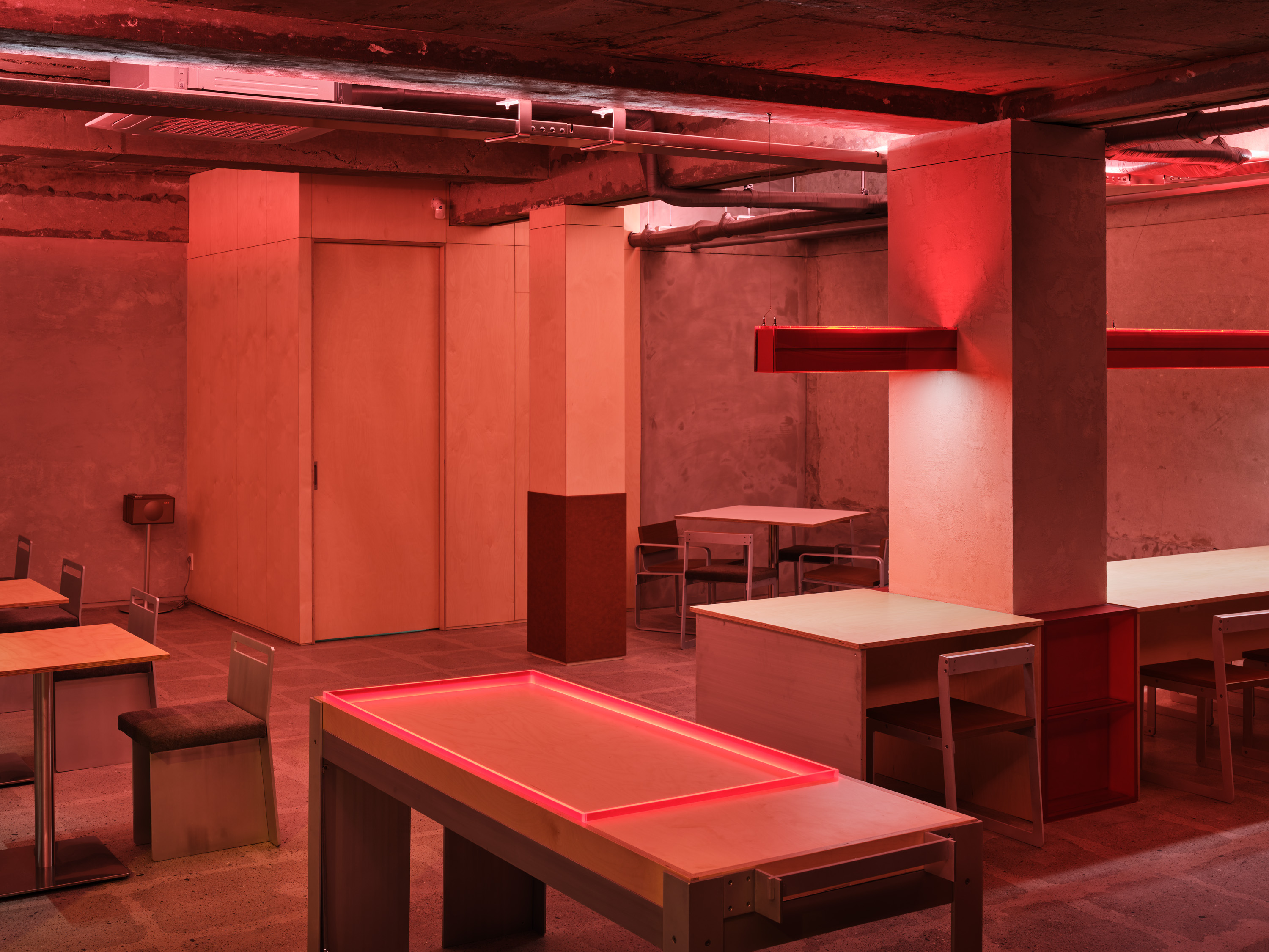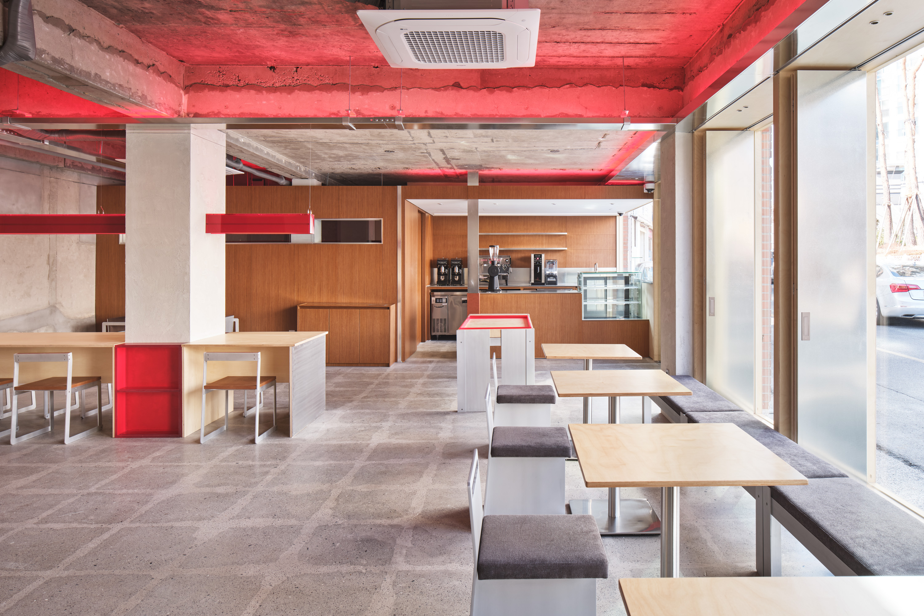 The interior tried to express a space where we could feel the natural change of simple form and physical properties, excluding relaxed arrangements and artificial decorations as much as possible. The visual comfort and chicness of warm wood and metal lines create a two-sided and harmonious space atmosphere. Red-colored point acrylic lighting & storage, chairs, benches, and bakery showcases, as well as raceways (electricity lines) through which small electric circuits pass, creating a hip sensibility and familiarity. The exterior is made to look visually separated with wood and metal materials that add depth over time so that you can feel the expansion of the fa드의ade of the horizontal rectangular space as it blends with the red bricks of the old commercial house.