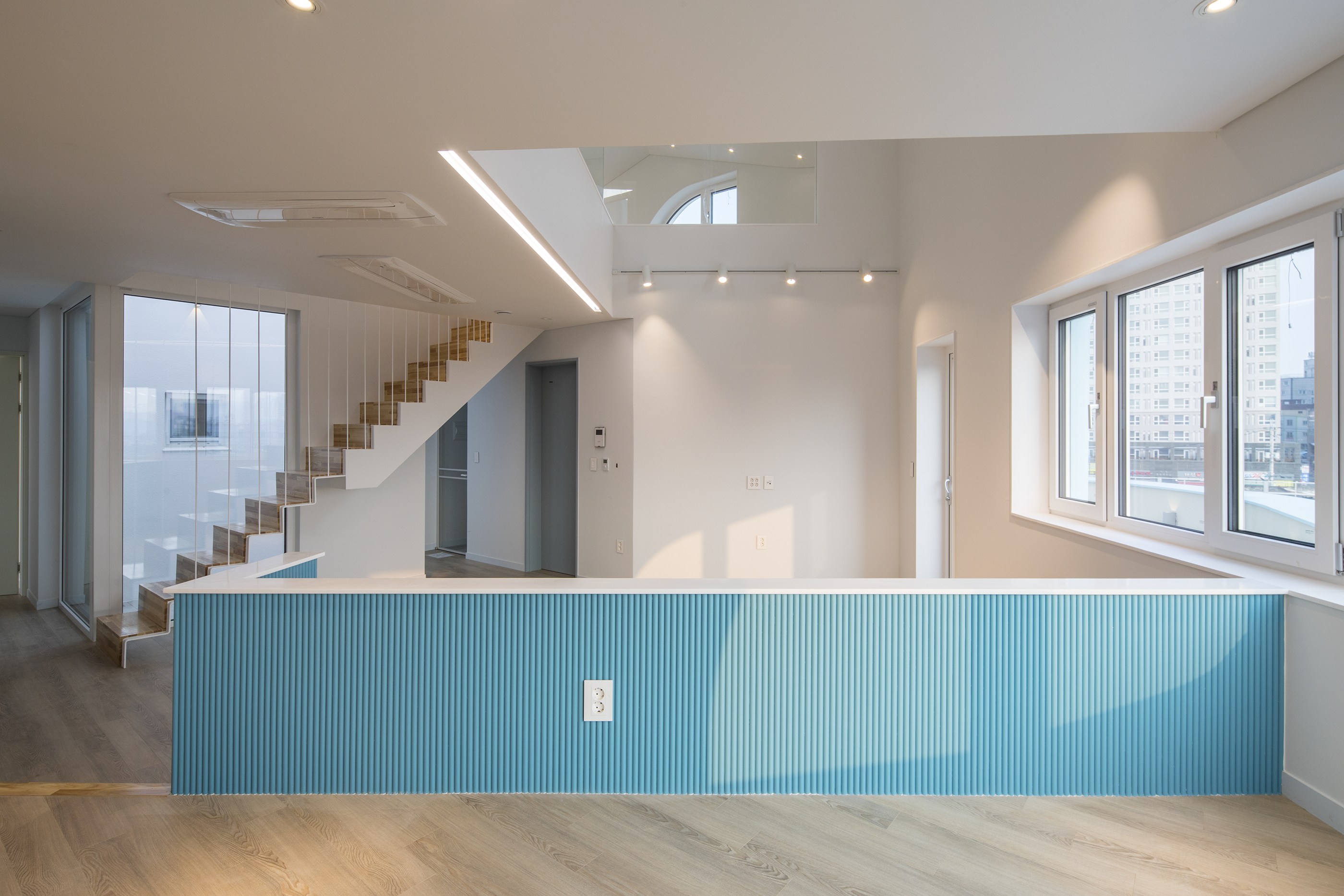 The building’s main entrance/exit couldn’t be approached from the piloti with backside parking lot but could be recognized from the front and we wanted them to have a bright image. The building’s main entrance/exit has designed on the front side which overlooks Seojeongri stream and has a side entrance which could access the building after parking. It considered the livelihood access circulation for strolling Seojeongri stream. The building’s main entrance/exit of the front side comes along together with the extended curved lines of the mass and has painted with blue so that the characteristic of entrance could be emphasized. We’d like to contain the image of “wave” and “light” picturesquely to the common space, which is the first thing we could face after the entrance. For the floor of the common space, the waves of sea have drawn with blue marble epoxy in white background. The pattern which flows with the stairs emphasizes the image of flowing water even more. A blue louver and glass blocks have added to the exterior of an elevator hall window and express the sparkling of starlight. These louver and glass blocks act as a masking wall hiding boiler room’s stovepipe and air conditioning grill which are planned on the side of the inner space and become an element which reveals characteristic image of the Maristella. Various overlapping axes of the 4th floor, where the building owner lives in, complete interior space more abundantly. A little courtyard located on the center of the living space is the first thing we could face after entering the entrance. By putting some flowerpots, the courtyard where sunlight directly comes in could be an extra space to the interior space. The living room has added with openness through the horizontal window overlooking southwest side with wide view and an open ceiling space. Every space from the living room to the dining room and kitchen spreads in one sight and the view gets extended to the loft space of the top part. Started from the courtyard space of the center, it’s connected with the main terrace which is connected with the living room, and the master room. The various big and small exterior spaces such as an eastside terrace which could be seen from the toilet and the library, and the rooftop space, which gets connected from the loft, have planned to link together with the interior space, in almost every space of the inside has made to face outdoors. The space of the loft, which is the tallest part of the building, has filled by the meeting of a form of an inclined roof, various axes, and the curved surface of the building.