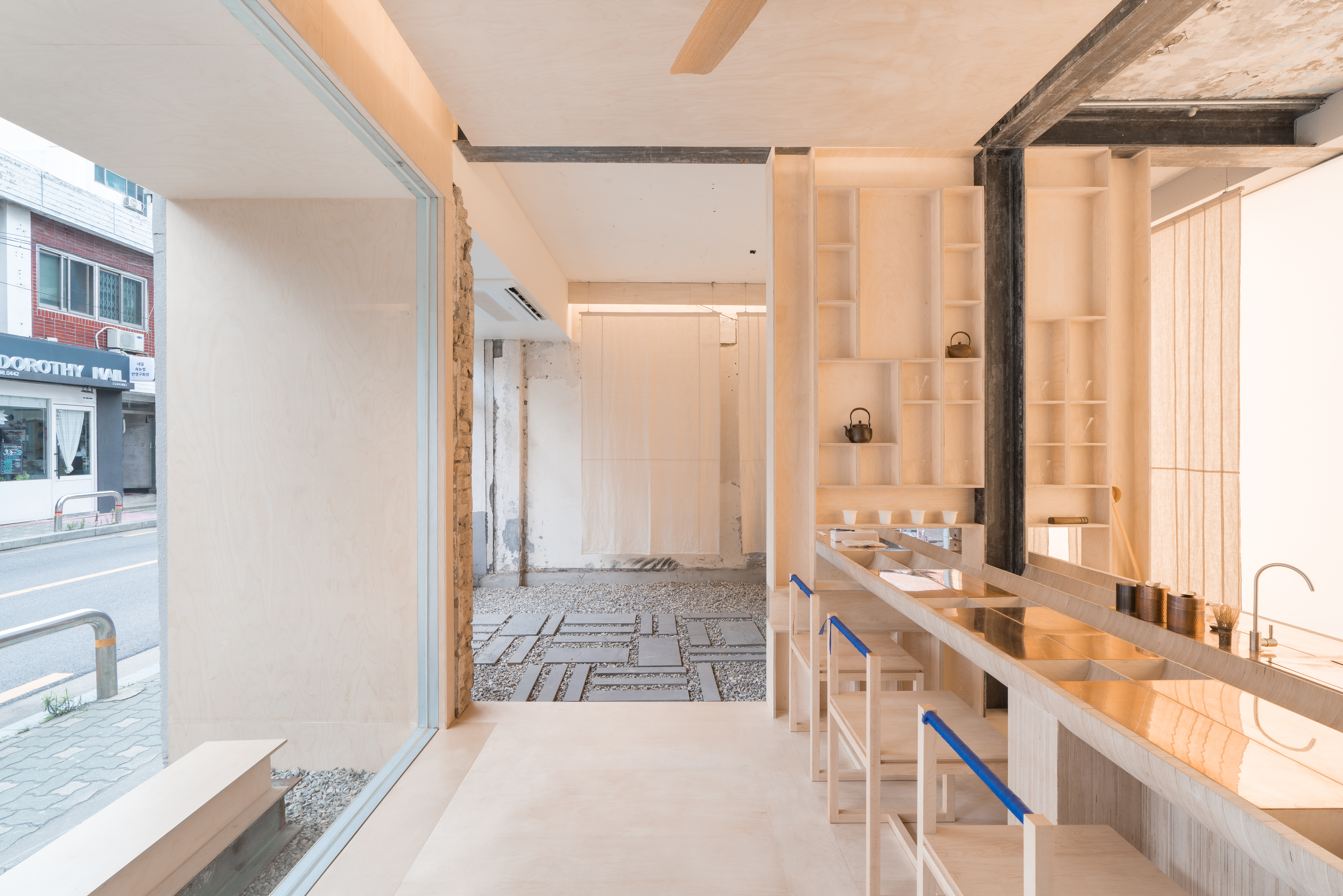 3개의 다른 가게가 있던 1층은 안내와 포장을 위한 공간, 차를 내리는 공간, 커피를 내리는 공간으로 나뉜다. 기존 공간 구성을 이용하여 설계된 세 공간은 다른 마감 재료와 공간 구성을 가지며 작은 상점들로 이루어진 망원동의 맥락을 이어간다. eert 의 가레산스이를 재해석해 만든 중앙의 긴 테이블은 서로 다른 세 공간을 이어주는 역할을 한다. 테이블 뒤의 벽 조명은 커피와 차를 만드는 행위에 집중하게 해주며, 손님들에게 새로운 경험을 가능하게 한다. 이 빛은 기존 공간의 흔적과 새로운 요소들을 밝혀주는 동시에 거리를 밝혀주고 사람들의 시선을 끌어모은다.