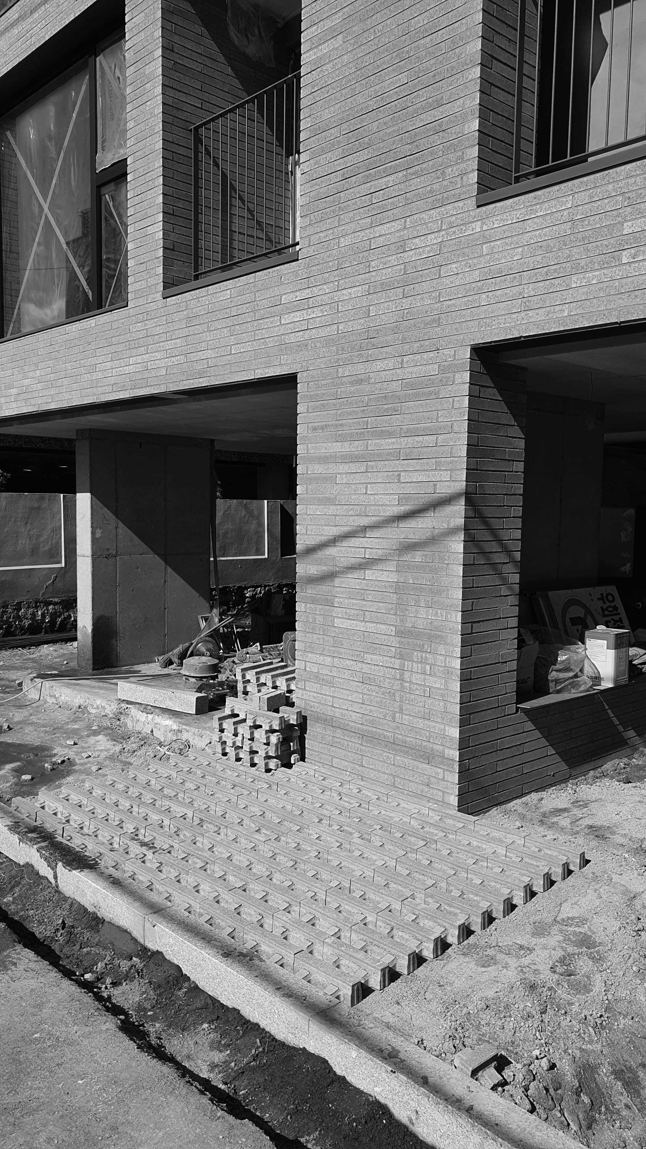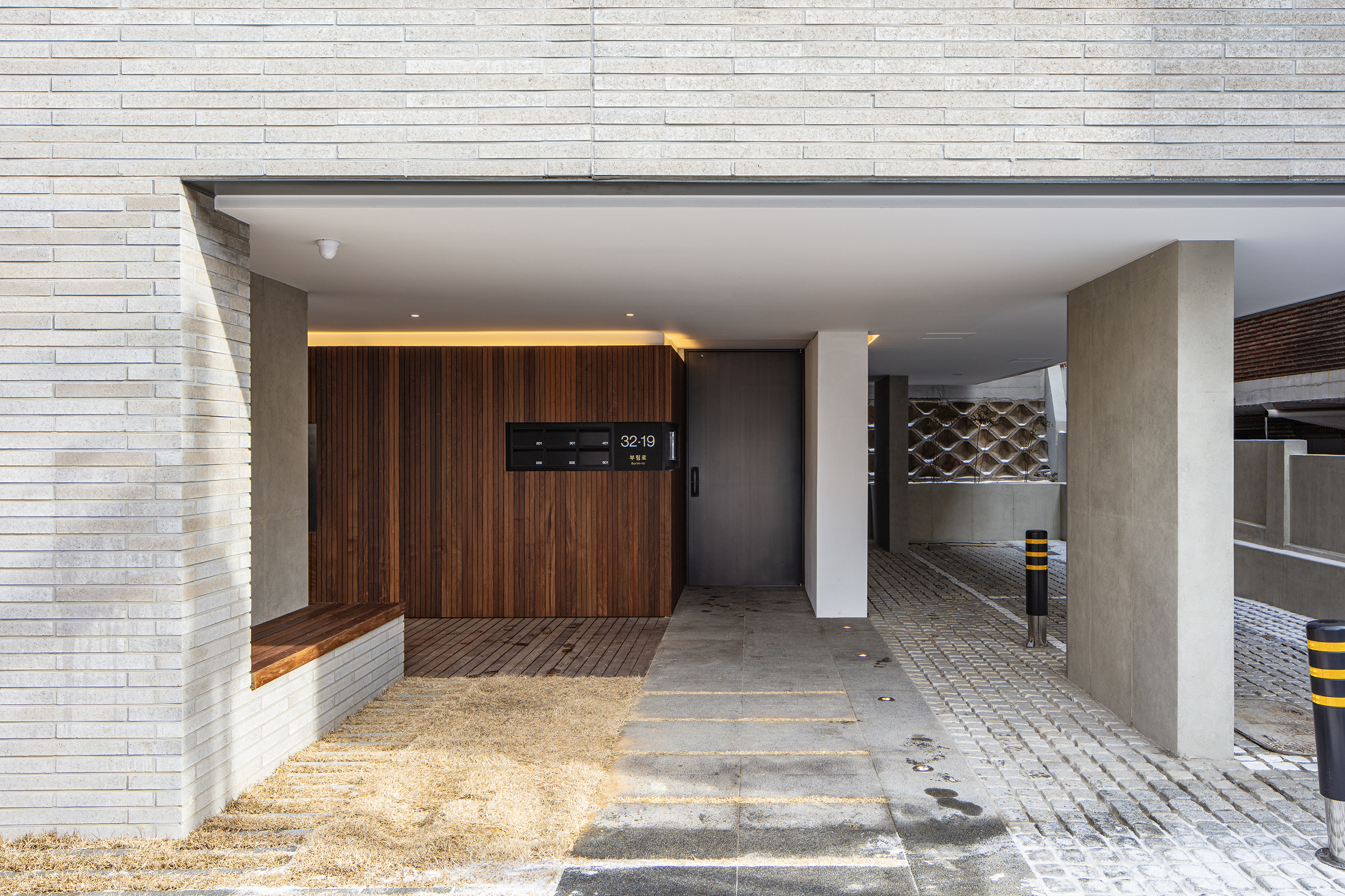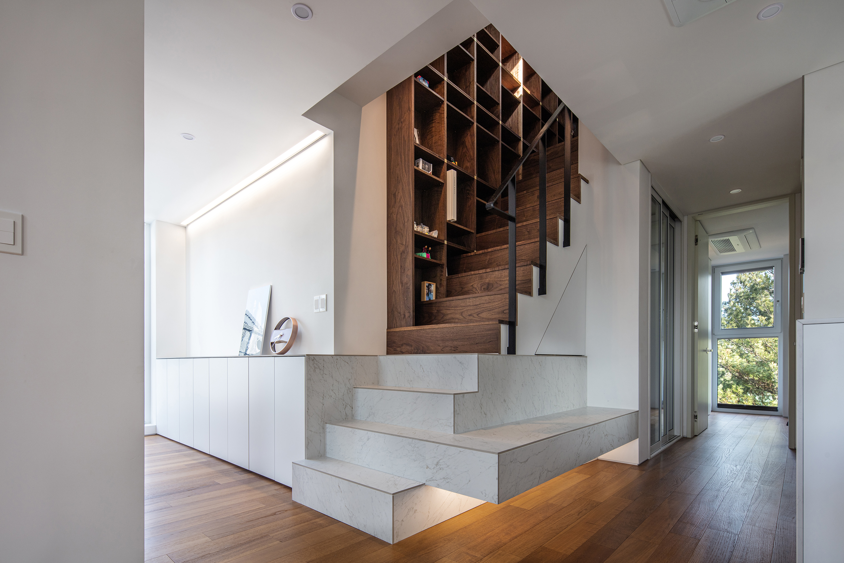 The building expresses the history of the deep and dense lives of the three generations, who have lived here for 40 years, contained in this place. The elevation is partitioned by the vertical windows that repeat in a familiar scale, the slender bricks that are artlessly and candidly stacked in a horizontal pattern, the ipe wood that alludes to the verticality of the pine grove, the vertical walnut affix windows that pair up with the ipe wood, etc., and Yulmokjae’s unique, simple and well-organized form is emphasized. and the round windows, vertical windows, affix windows, and skylight selectively bring in the natural light that changes depending on the time and reveal the shades of the light sleeping in the space. In the common spaces, such as the stair hall, a soft and peaceful light gradually soaks in through the vertical louver, perforated brick stacking, and the horizontally long window attached to the floor. From the stair landing, which is finished with pine exposed concrete, the pine grove can be viewed like a framed picture. Each household has a balcony overlooking the forest as well as a separate utility room. A small built-in chair is installed on the pillar area of the first floor piloti, which is the entrance of the building. This small space is a small shelter for the residents and people in the town. Although it is just a small chair, it serves as a guest room for people to gather in multiplex residences in Korea that lack amenities for residents. The stairs that lead up to the attic from the fifth floor also have an image where the lower storage, bookcases, chairs, stairs and lights are integrated, and contain various scenes of everyday life as they are called by various names.
