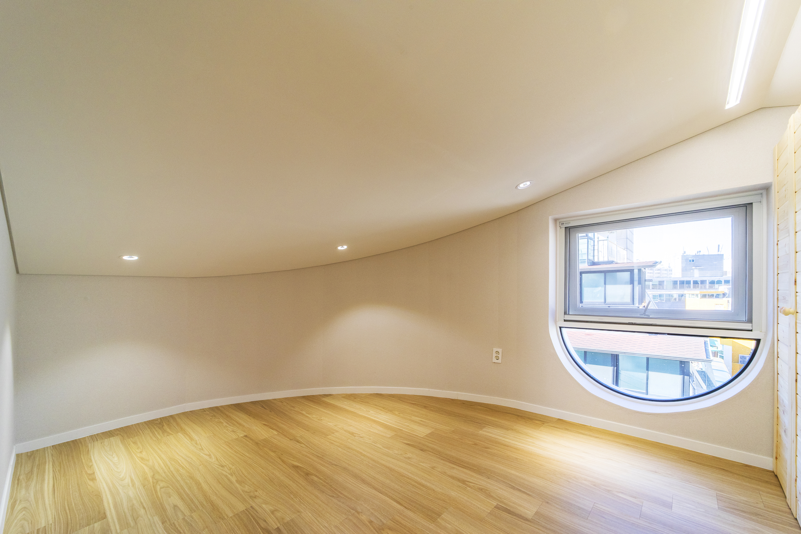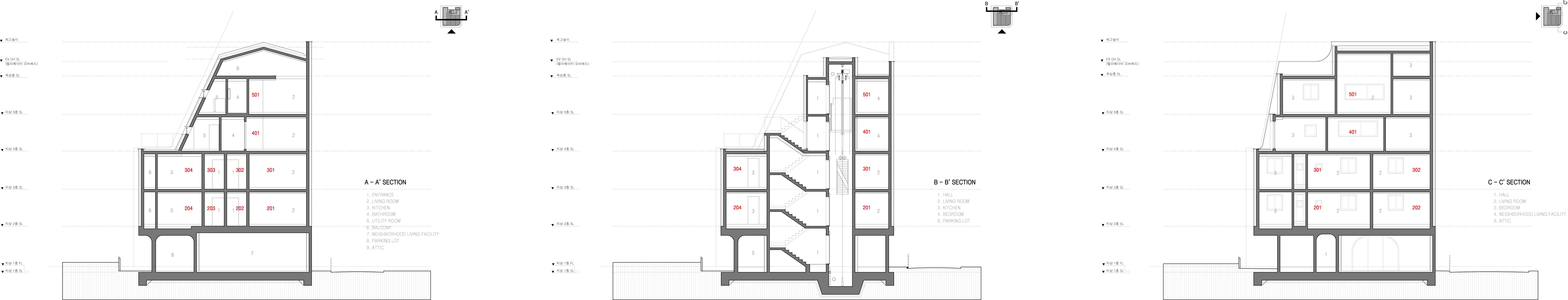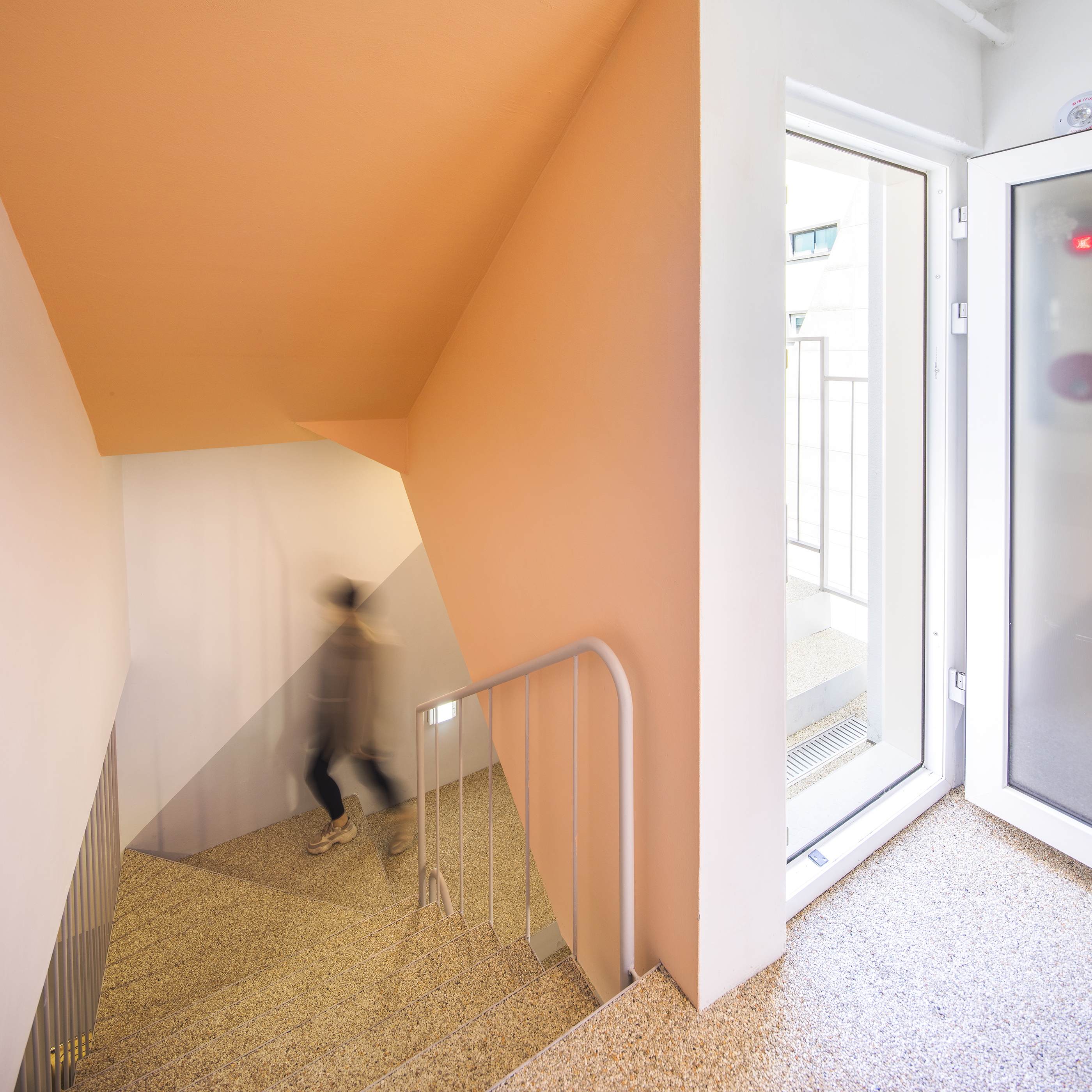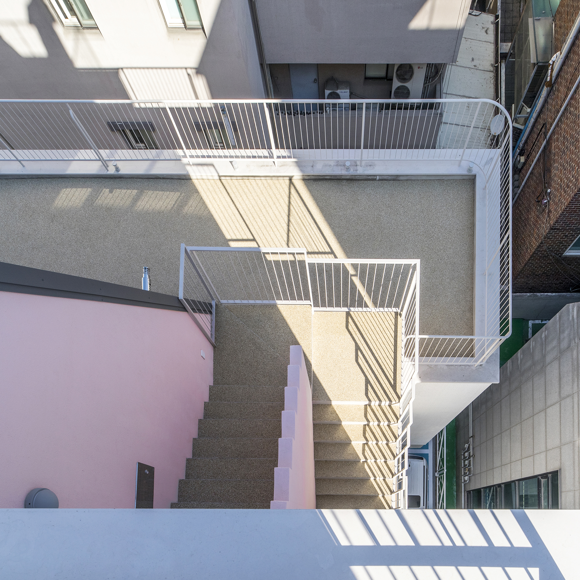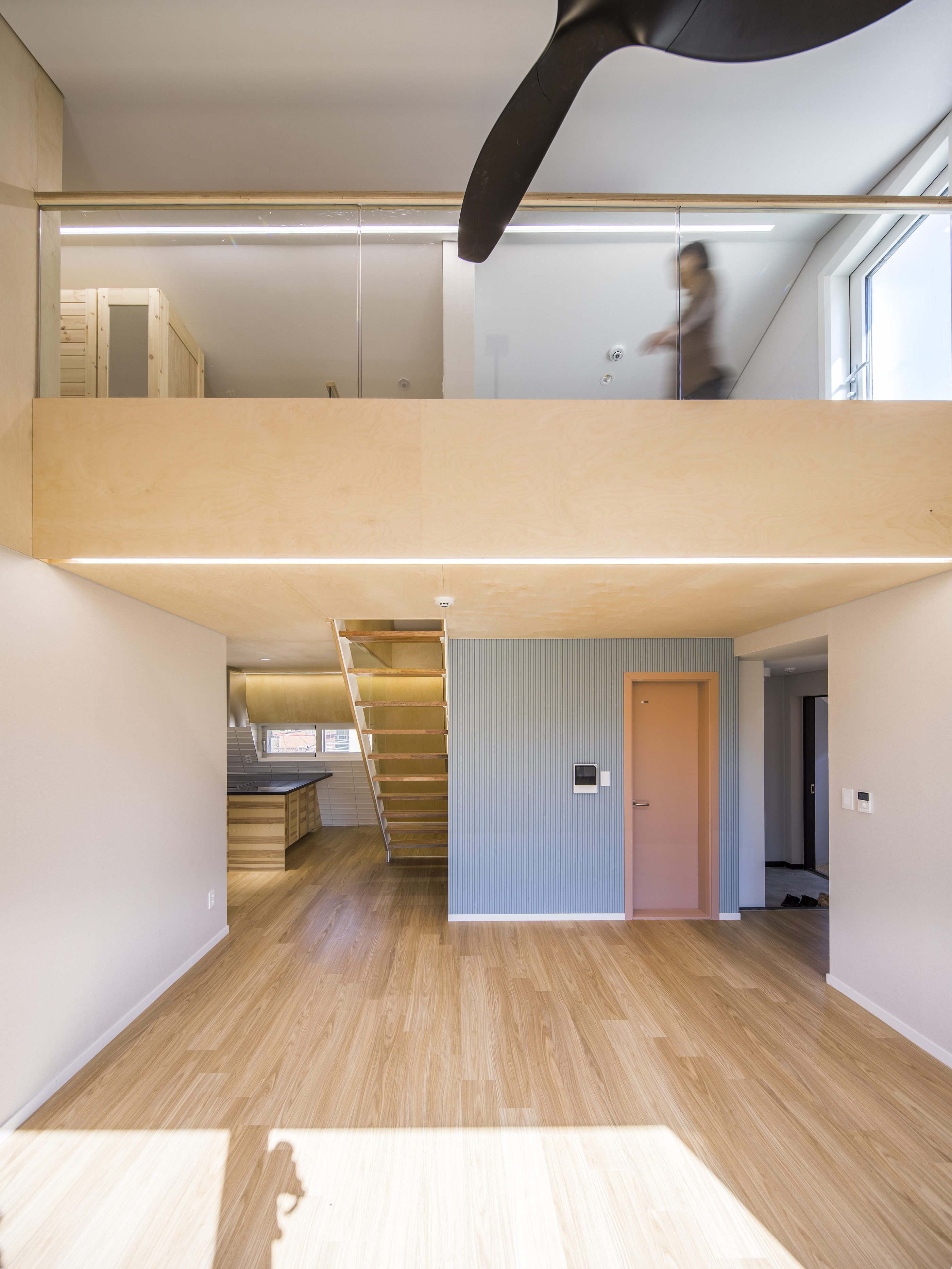 이 규모 건물의 공용공간은 엘리베이터와 계단, 복도가 한눈에 노출되어야 한다. 복도가 꺾이거나 어두워지는 공간을 피하고, 따뜻한 질감의 콩자갈 수지포장을 적용했다. 외부계단은 4층의 식구와 5층의 식구를 연결하는 계단으로 작용한다. 정북일조권을 피하면서 4층 어머니 세대의 마당 같은 테라스와 5층을 외부에서도 연결된다. 원룸이라 불리는 작은 임대주택의 기본원칙은 복도가 생기더라도 공간이 분리되어야 하며, 거실과 방의 채광을 우선으로 배치한다. 그리고 보일러실과 세탁실을 따로 만들어 분리시키는 것을 원칙으로 한다.
