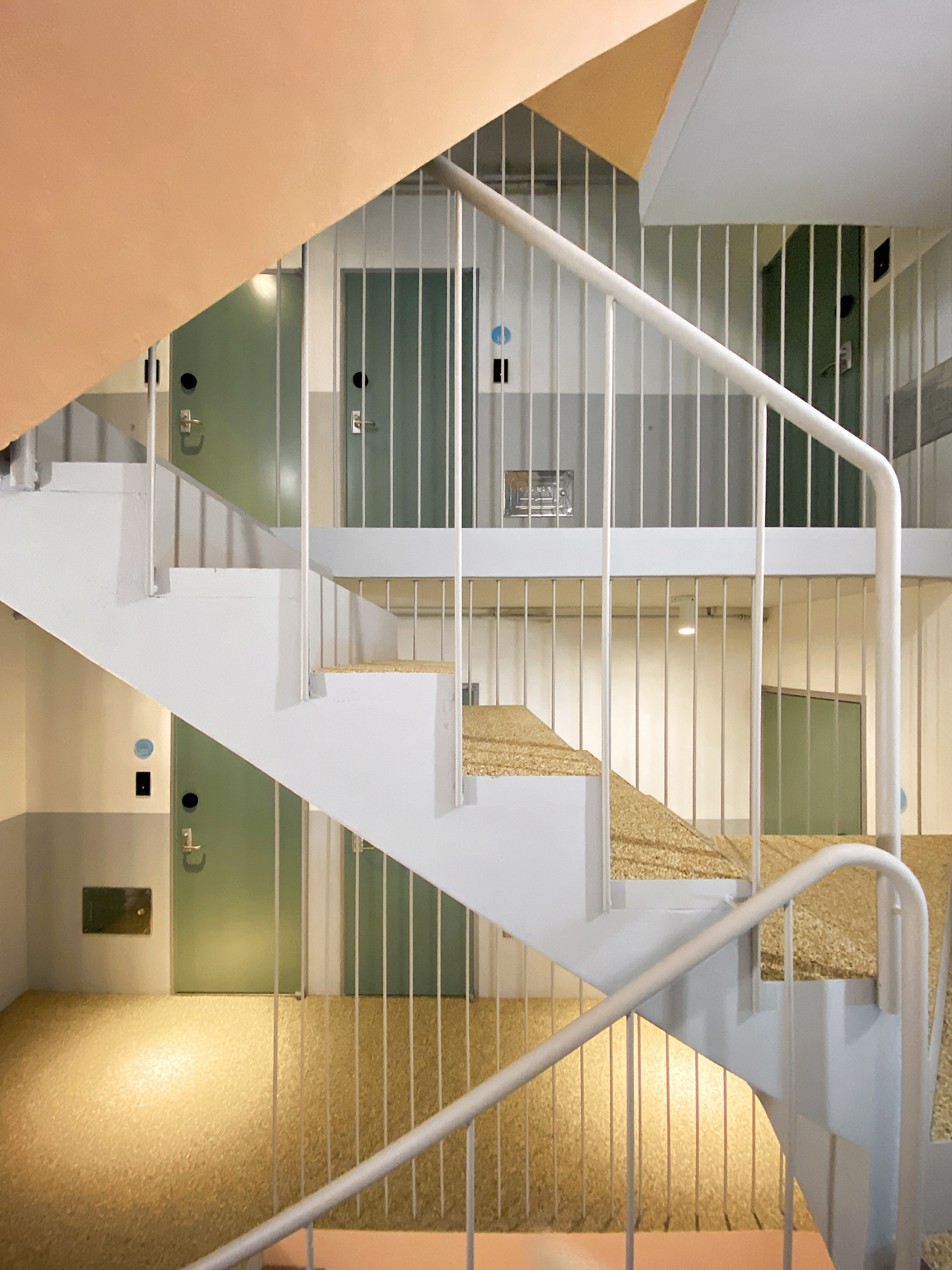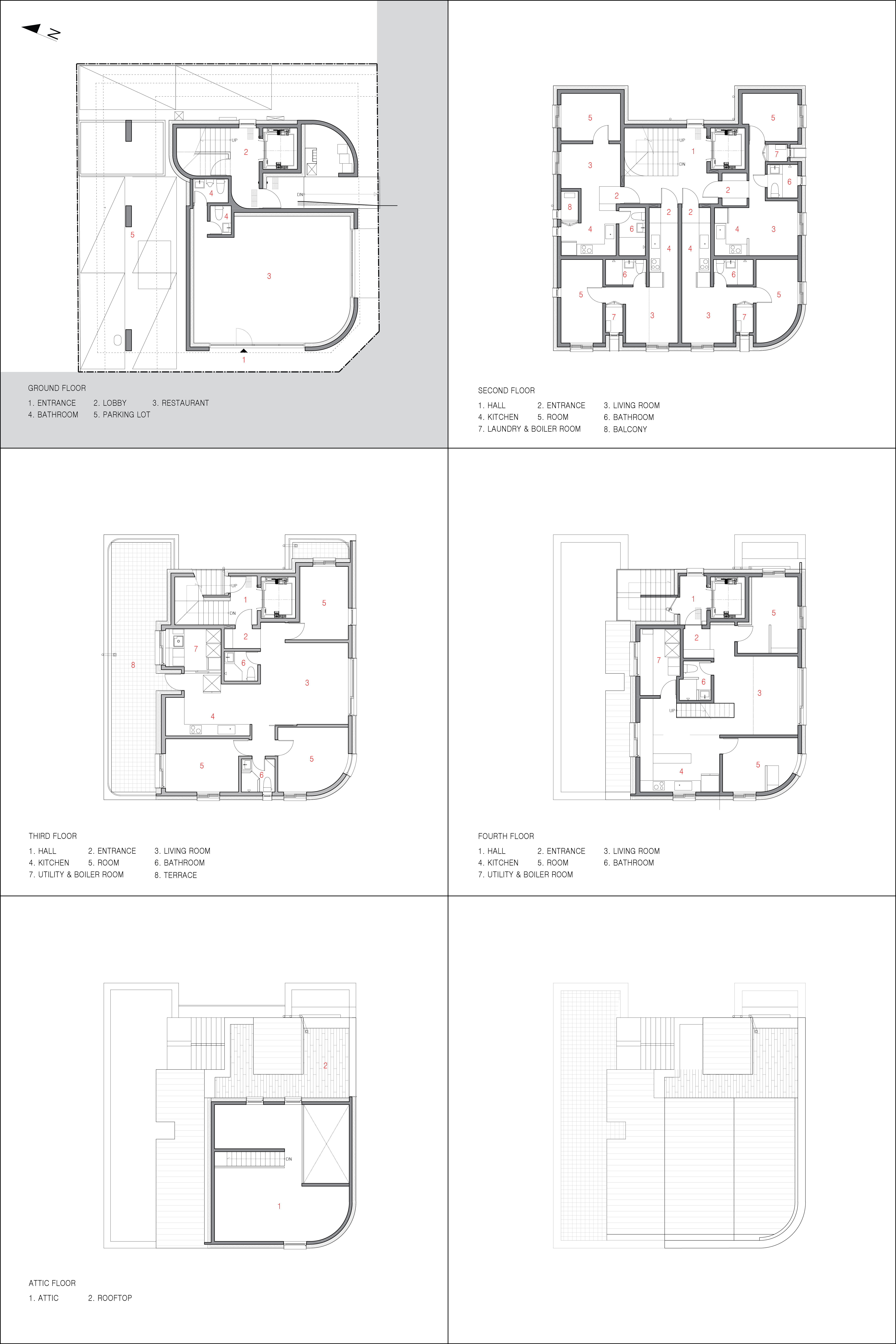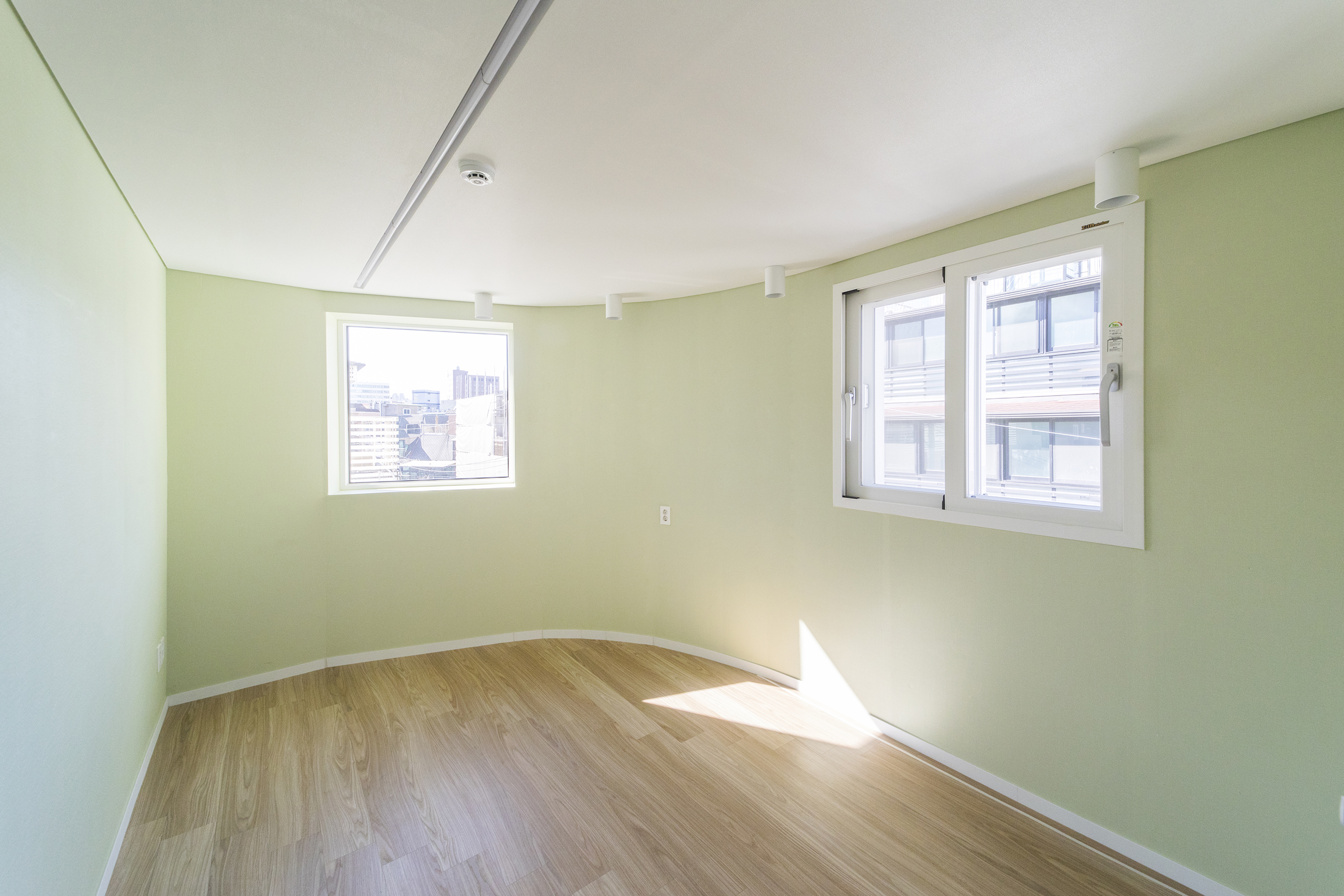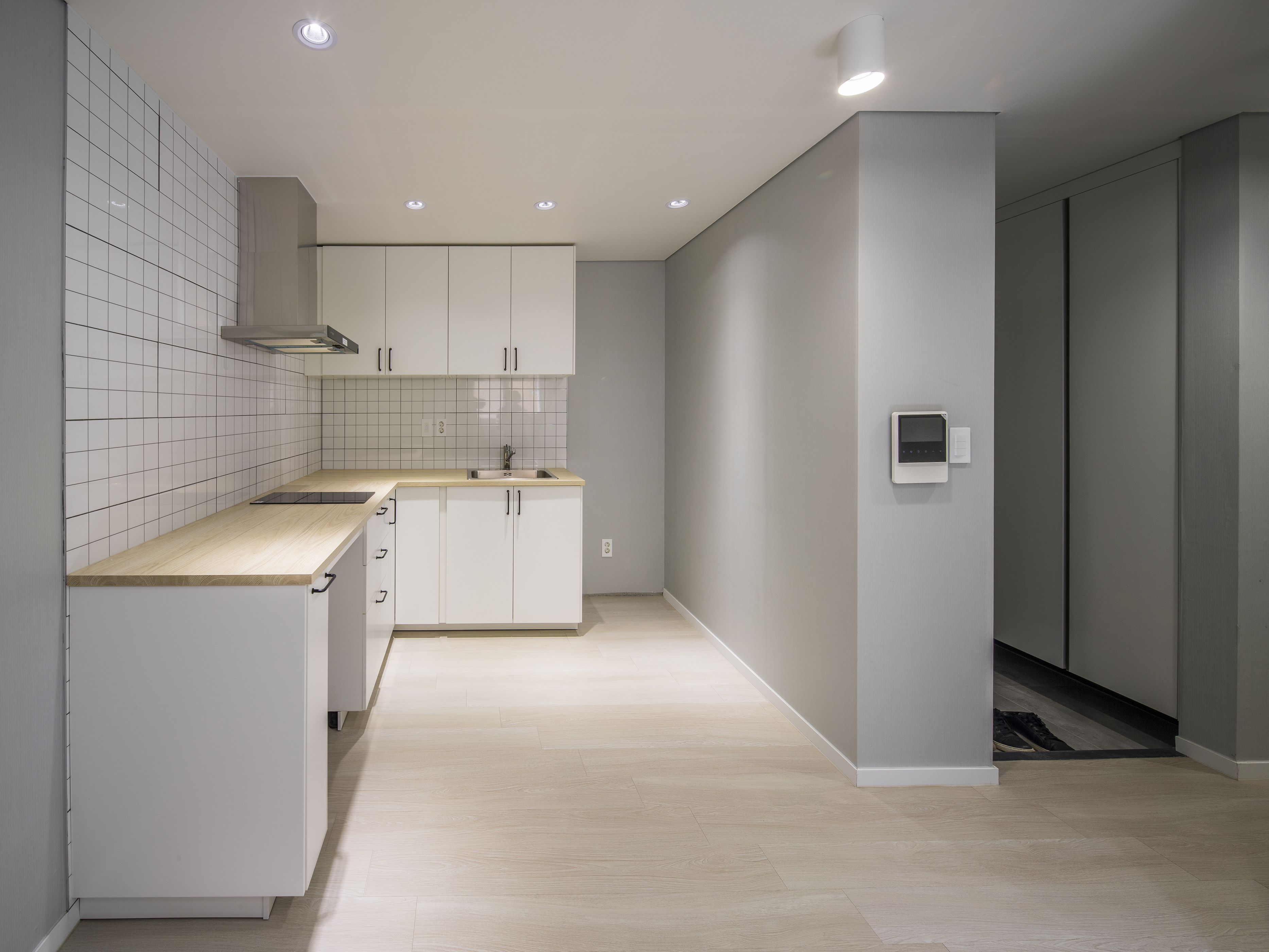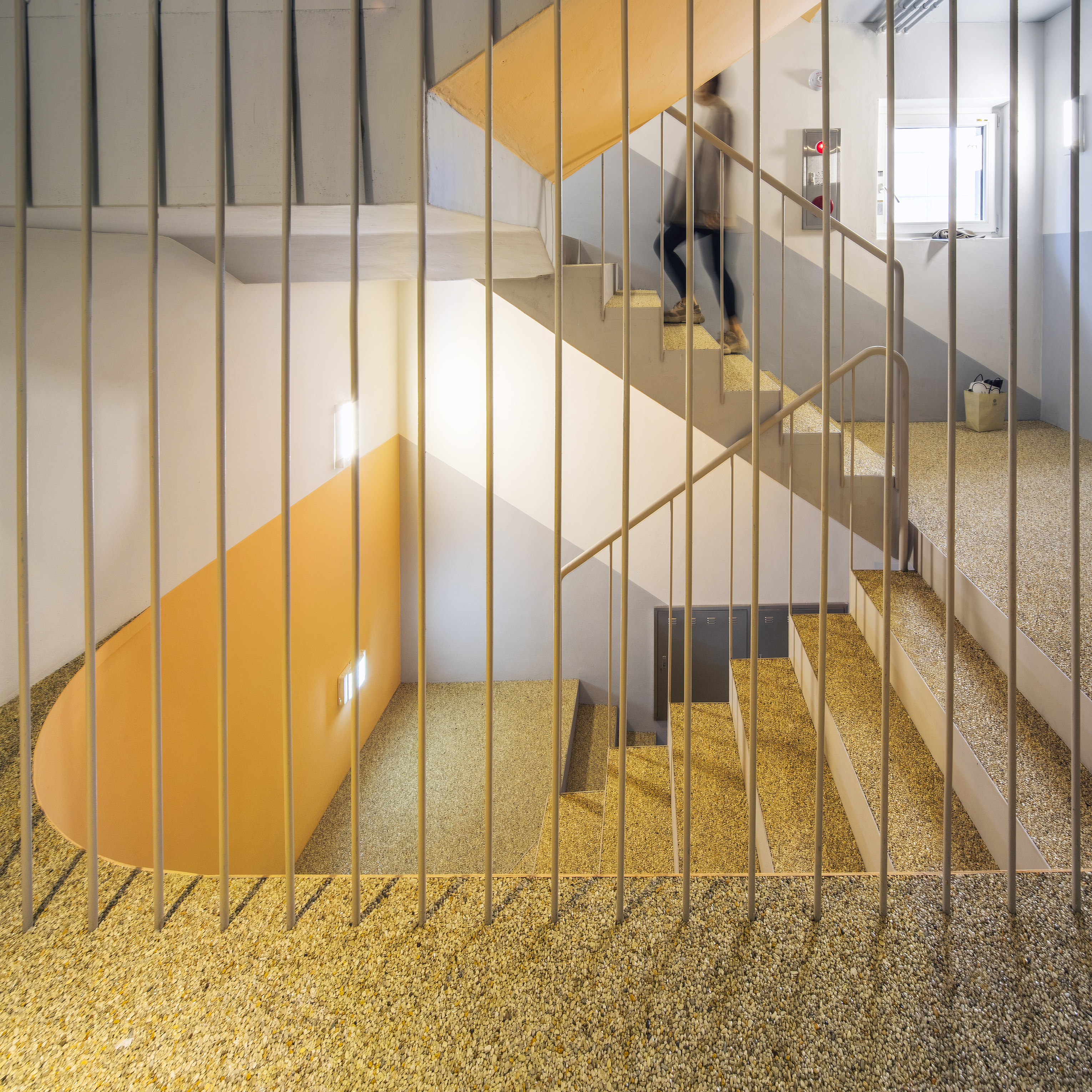 이 규모 건물의 공용공간은 엘리베이터와 계단, 복도가 한눈에 노출되어야 한다. 복도가 꺾이거나 어두워지는 공간을 피하고, 따뜻한 질감의 콩자갈 수지포장을 적용했다. 외부계단은 4층의 식구와 5층의 식구를 연결하는 계단으로 작용한다. 정북일조권을 피하면서 4층 어머니 세대의 마당 같은 테라스와 5층을 외부에서도 연결된다. 원룸이라 불리는 작은 임대주택의 기본원칙은 복도가 생기더라도 공간이 분리되어야 하며, 거실과 방의 채광을 우선으로 배치한다. 그리고 보일러실과 세탁실을 따로 만들어 분리시키는 것을 원칙으로 한다.