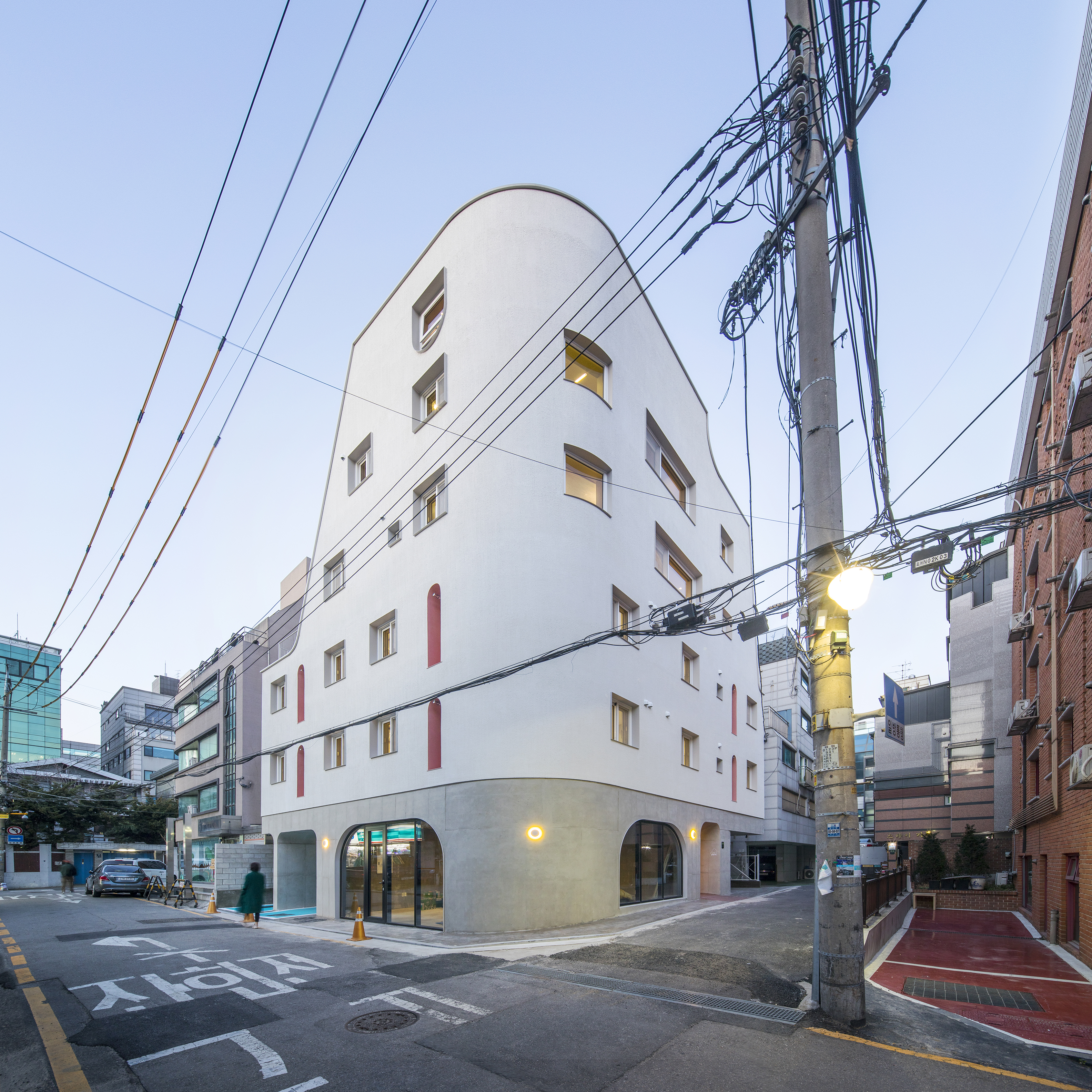 Cloud House is a multi-unit dwelling built for the client to live with their children who have moved out. In the new multi-unit dwelling, the families that have now grown more gather and live together again. The site is located at the corner between a one-way street and a dead-end alley in the side street of downtown Sinsa Station in Gangnam. Every building that adjoins that road was newly constructed within the last ten years, and it is an ordinary urban alley as there are multi-unit studio apartments, offices, convenience stores, restaurants and cafes. The joint front door of the building’s main entrance is recognized from the street, allowing direct entry. The entrance has to be bright, and it is made so that it isn’t blocked by a car and the appearance of entering the front door is visible from the road. In multi-unit dwellings, pilotis spaces and parking lots are both used as if they share the same name. Pilotis, which Le Corbusier proposed in his urban planning, was a “liberation from the ground” and was a concept of not placing the space for residence on the ground but devoting it to the passage of the city. However, the typicality of pilotis, which have become parking lots, best show the internal contradictions in multi-unit and multi-household dwellings in Korea. This typicality of pilotis is made into an arcade for passage, which is at least a little bit closer to its original meaning, and a design that is not dark, not deep and not typical is created.