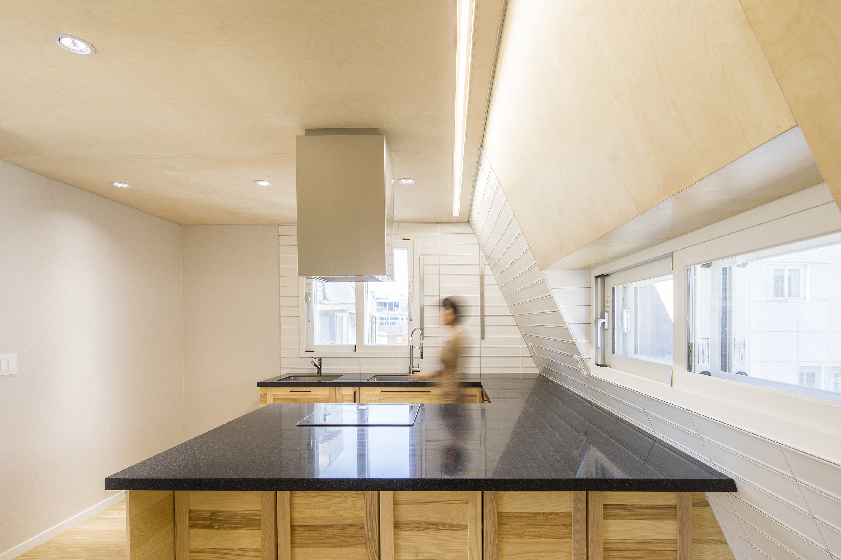 With common spaces of a building of this size, the elevator, stairs and corridor should be exposed at a glance. Spaces where the corridor is bent or darkened was avoided, and a warm-textured pea gravel resin packing was applied. The exterior staircase serves as a staircase that connects the families on the fourth and fifth floors. It avoids the northern sunlight right and connects the terrace, which resembles a courtyard, on the mother’s household on the fourth floor to the fifth floor from the outside. The basic principle of the small rental households called studios is that the spaces must be separated even if a corridor is created, and the lighting of the living room and room are arranged first. Furthermore, a boiler room and laundry room should also be made and separated.