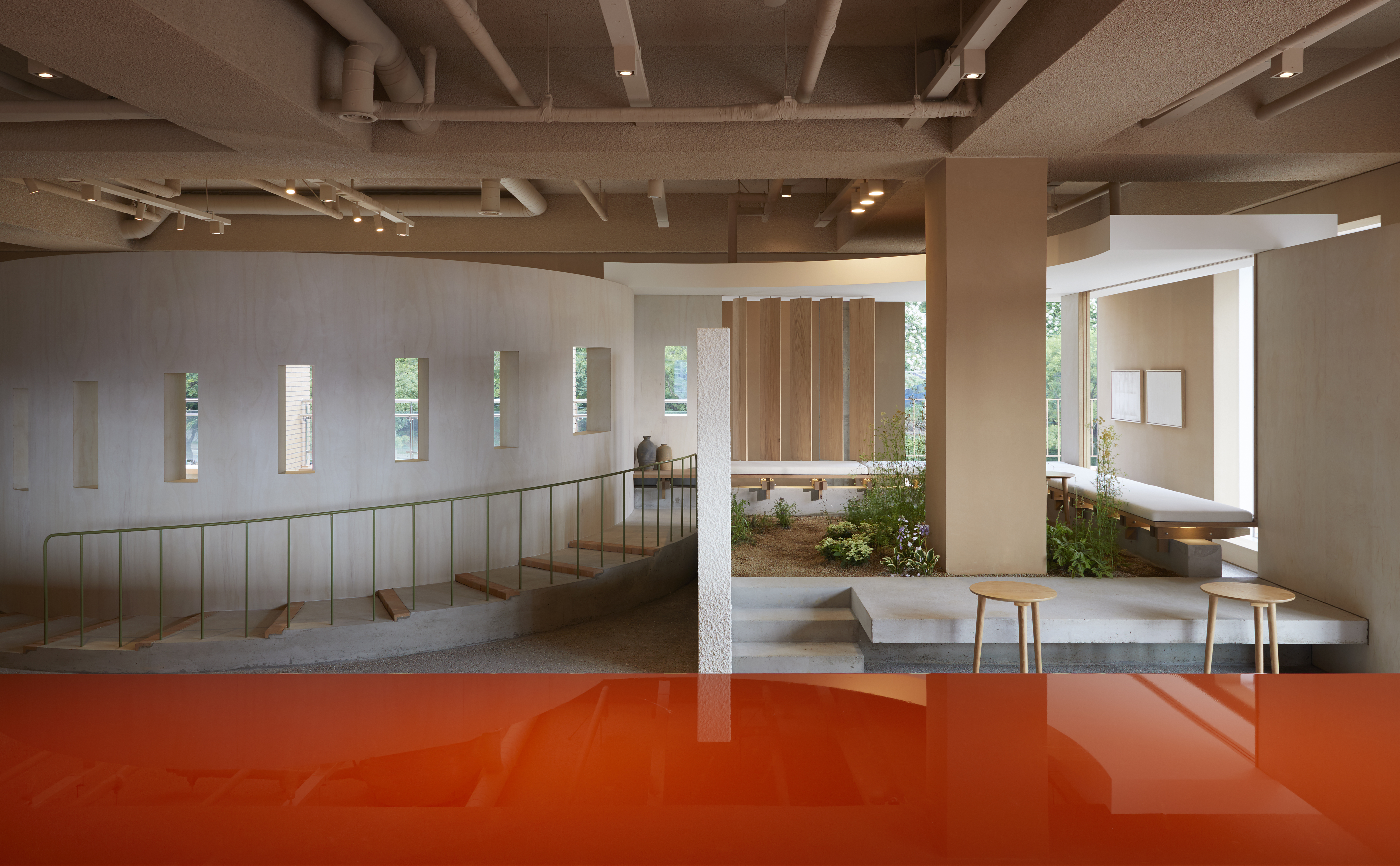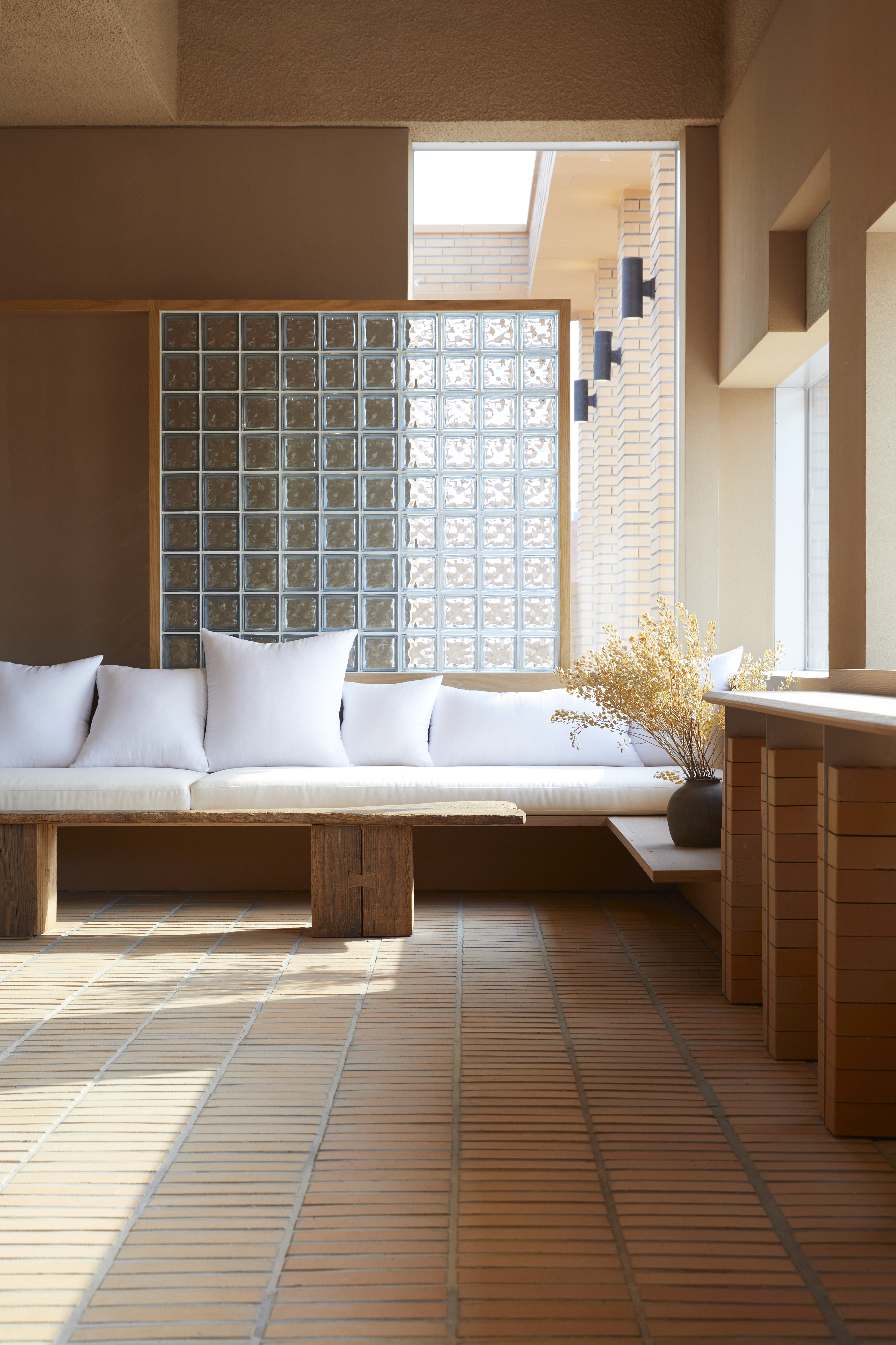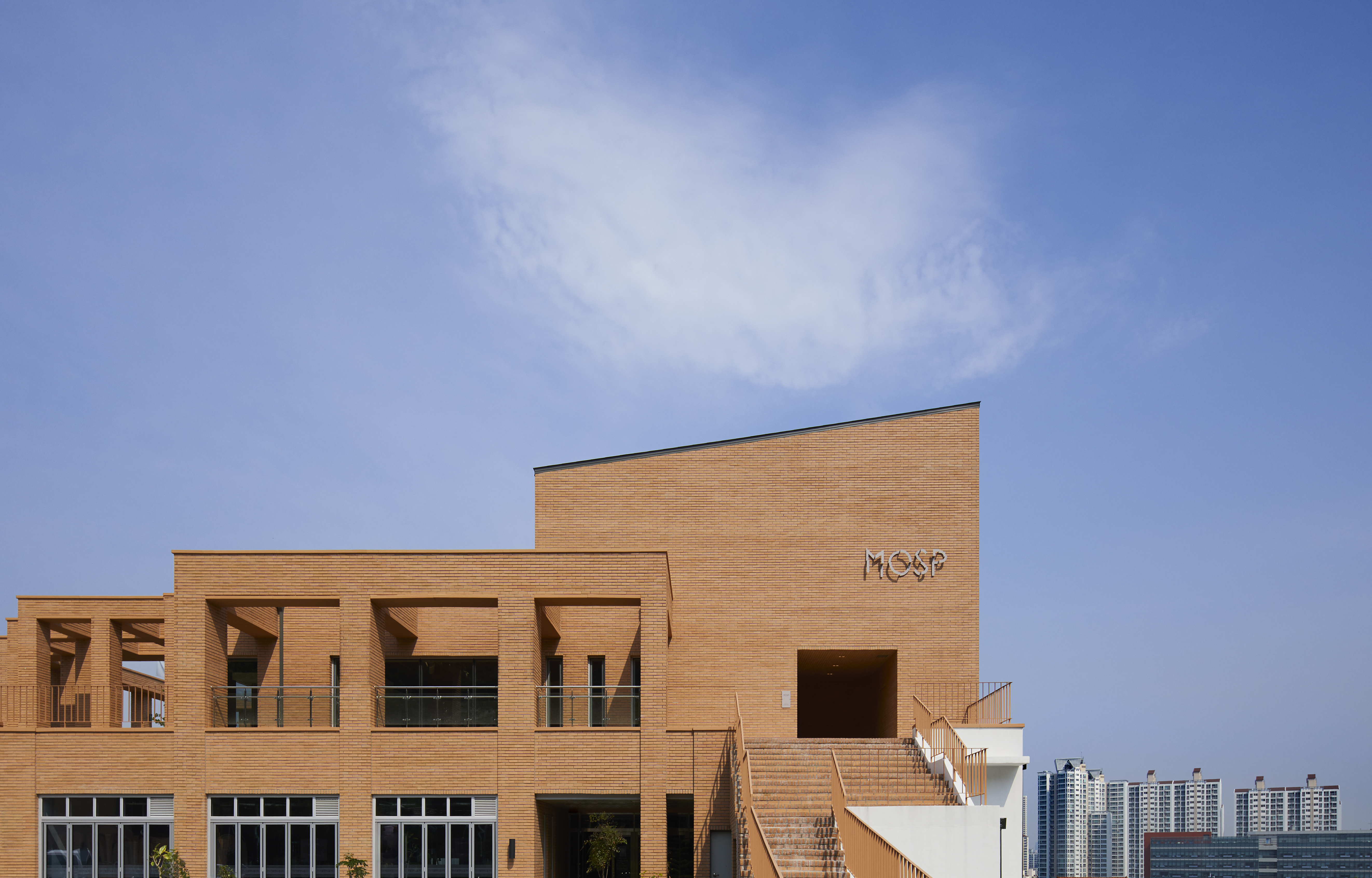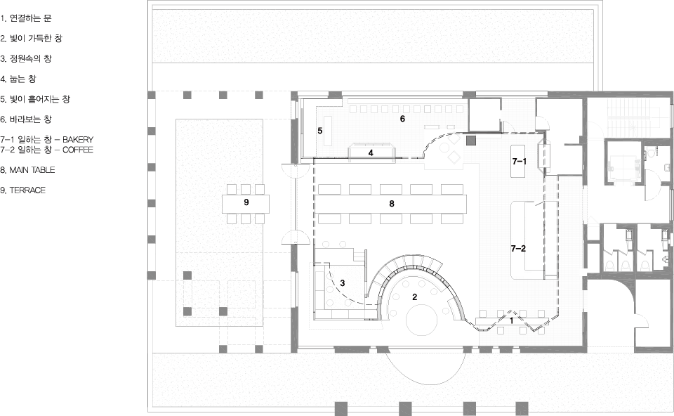 Daejeon MOSP is located gently at the foot of the mountain. You can see downtown Daejeon from now on, and there is Bomunsan Mountain in the back. Located on the top of the fifth floor, MOSP used slow stairs from the ground at the foot of Bomunsan Mountain to the inside of the cafe naturally according to the flow of land. The building viewed from the other side of Bomunsan Mountain is somewhat vertical, but when you enter the cafe from Bomunsan Mountain, you enter with a low and leisurely horizontal mass. The view of downtown Daejeon from the terrace opposite after entering feels like an unfamiliar scenery. The interior of the cafe overlooking the slow stairs has its own comfort. The indoor space is large, but it is not a spacious feeling, but I thought about it so that I could stay cozy and relaxed. A long partition was installed in the space, and doors and windows reflecting various rest behaviors were created.