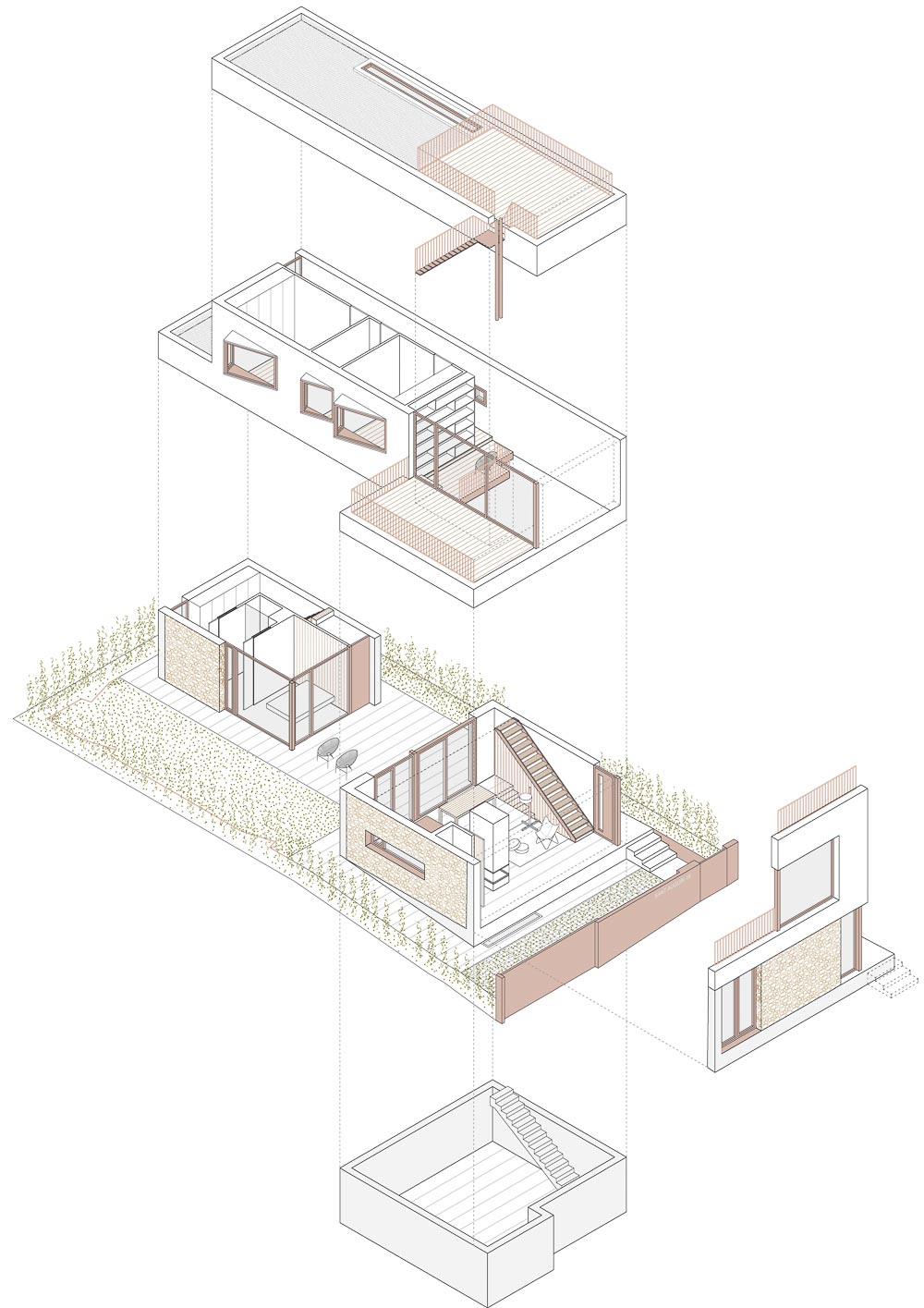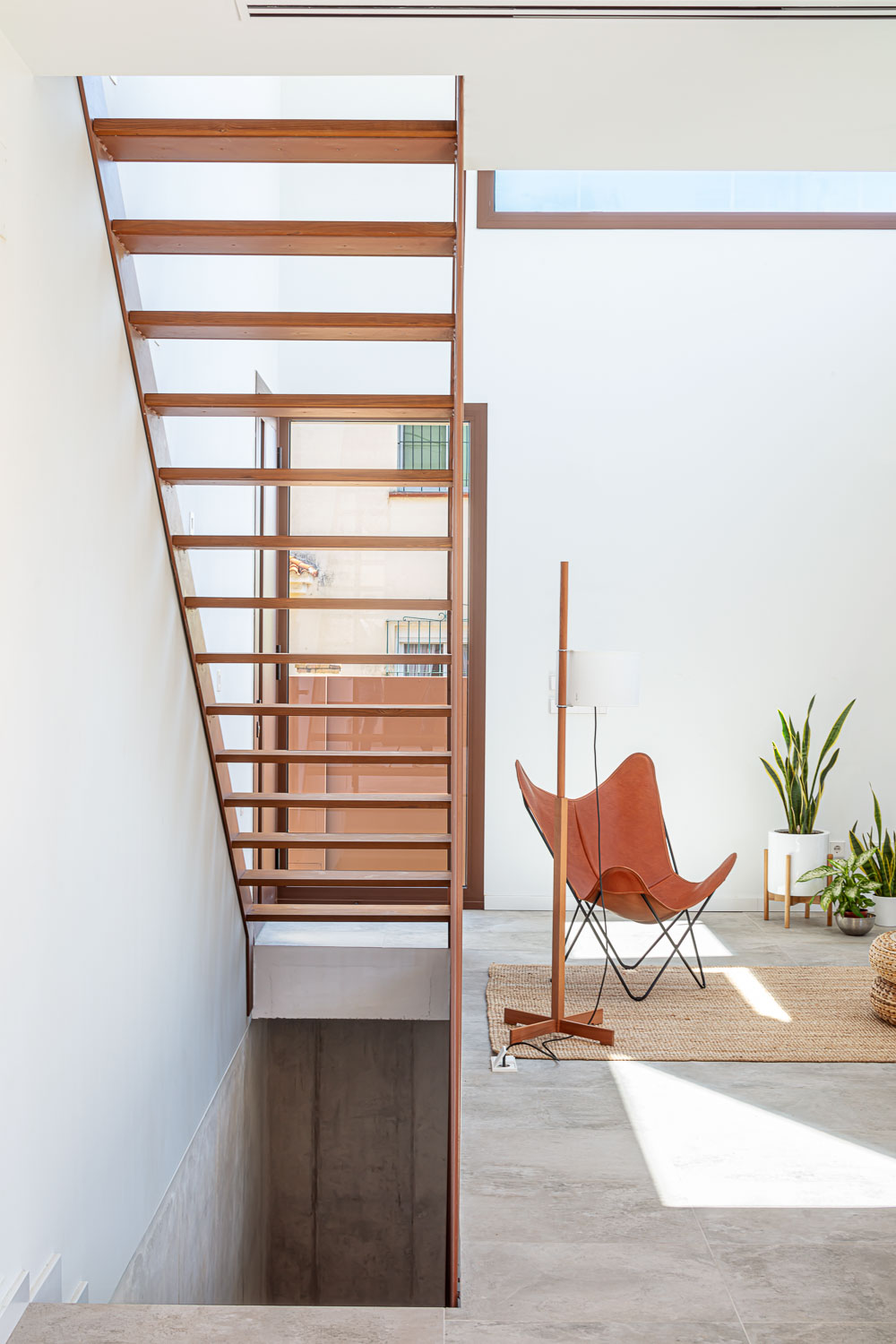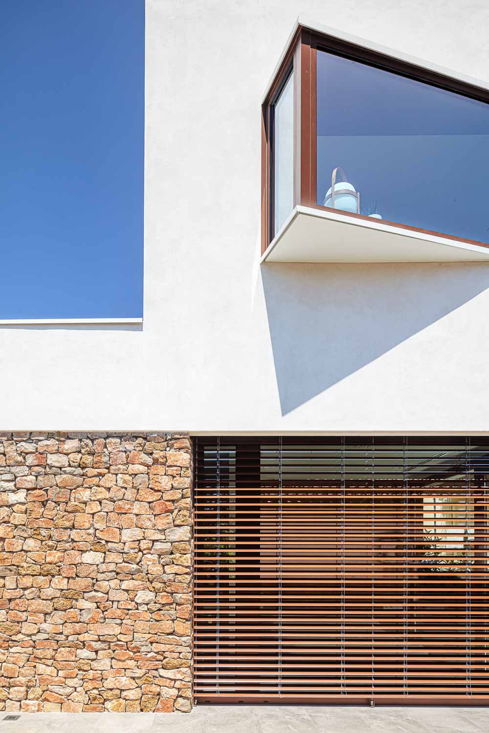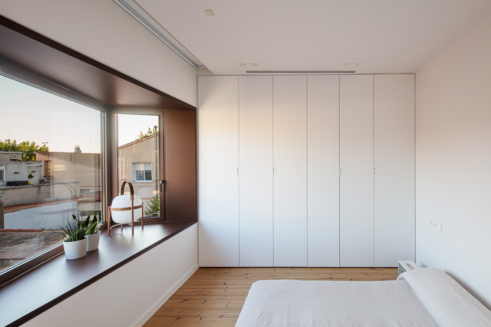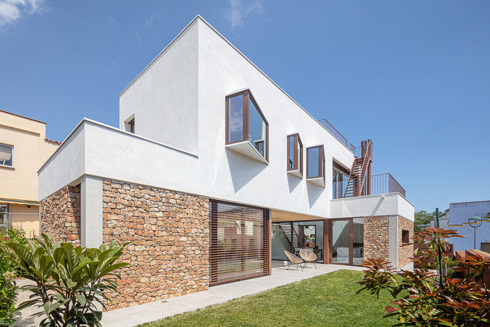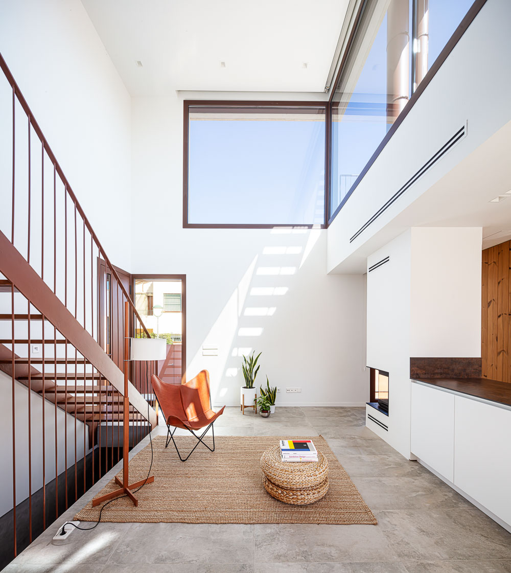 The plot has a limited amount of building space. For this reason, various strategies have been developed to use the space and expand the perception of the dimension of the interior space, such as the outside porch, the double height of the living-dining room, the integration of the circulation areas within the different rooms, the capture of natural light through strategically placed windows or skylights and the creation of three triangular protruding windows that at the same time become floating interiors spaces of seclusion and in visual contact with the garden.