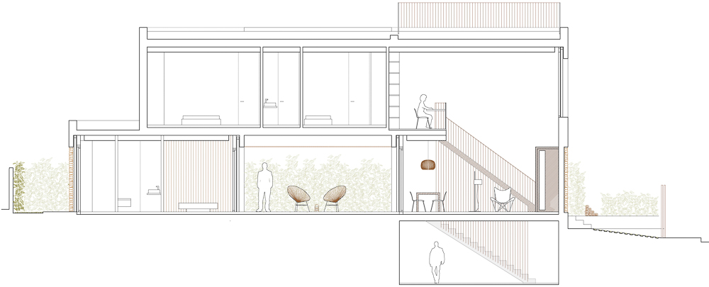현관의 왼쪽과 오른쪽에는 실용적인 프로그램이 있다. 한쪽은 침실과 욕실, 드레스룸으로 이루어져 있고, 다른 한쪽은 주방과 거실이 있다. 양쪽 공간 모두 창고와 설비실로 사용하는 지하와 연결된다. 1층에는 2개의 침실과 1개의 화장실이 계획되었다. 외부의 1층 테라스와 2층 테라스는 도시의 다양한 경관을 조망할 수 있게 했다.