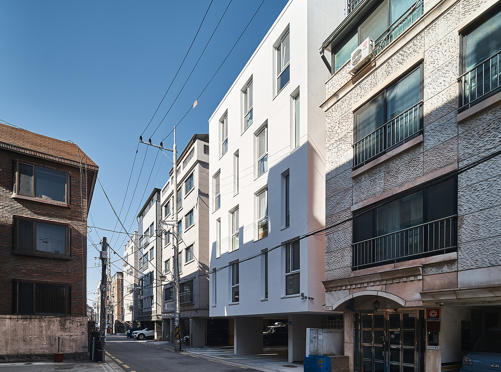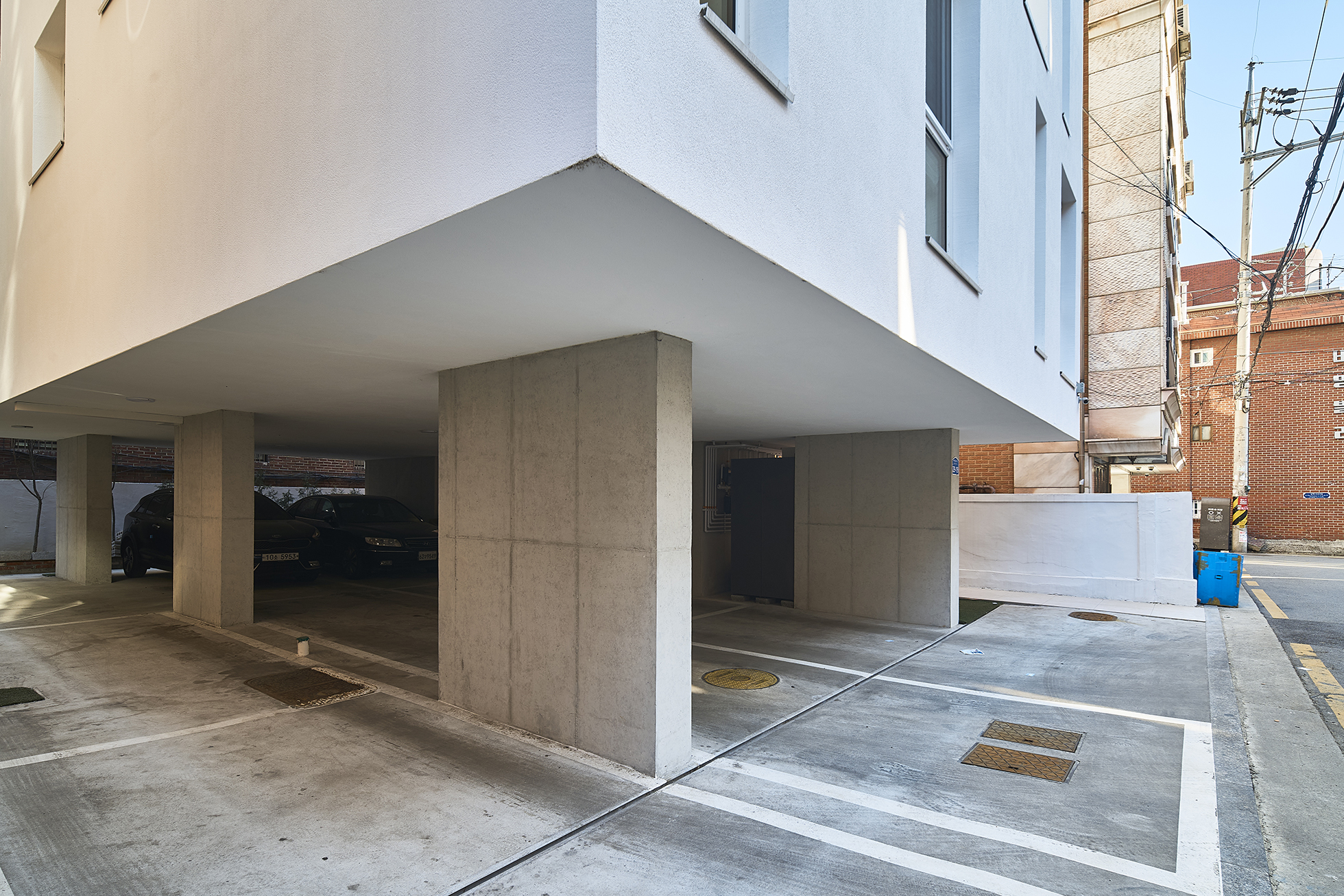 Blanc Blanc, built in an alley filled with multi-family housings in Samjeon-dong, has a distinctive external appearance from the surrounding buildings with a pure white and grout-less mass texture. On the facade of the building, which brightly illuminates the surroundings as it is finished in white, windows are rhythmically arranged, giving off a clean yet exceptional atmosphere. When passing through the first floor piloti, which is supported by exposed concrete, an external staircase that allows access to each household is faced, and it also leads to the rear side where the balconies are arranged. The pure white facade that lights up the alley of Samjeon-dong was constructed with an STO external insulation system, thus it prides itself on satisfying eco-friendly aspects while being economical. Blanc means pure white in French. Within the uniform and crowded alley landscape, the neat and pure white building is changing the surrounding atmosphere.